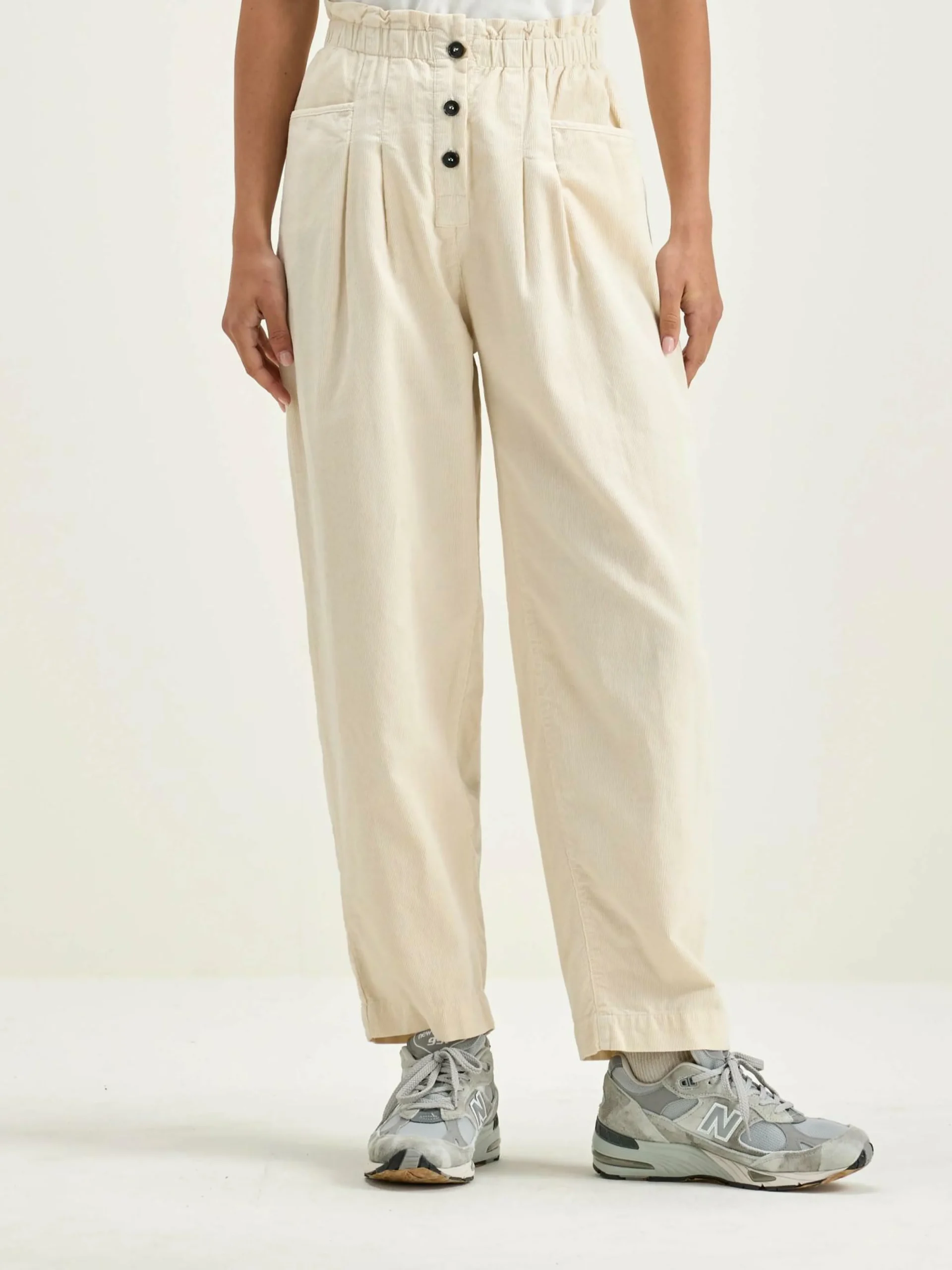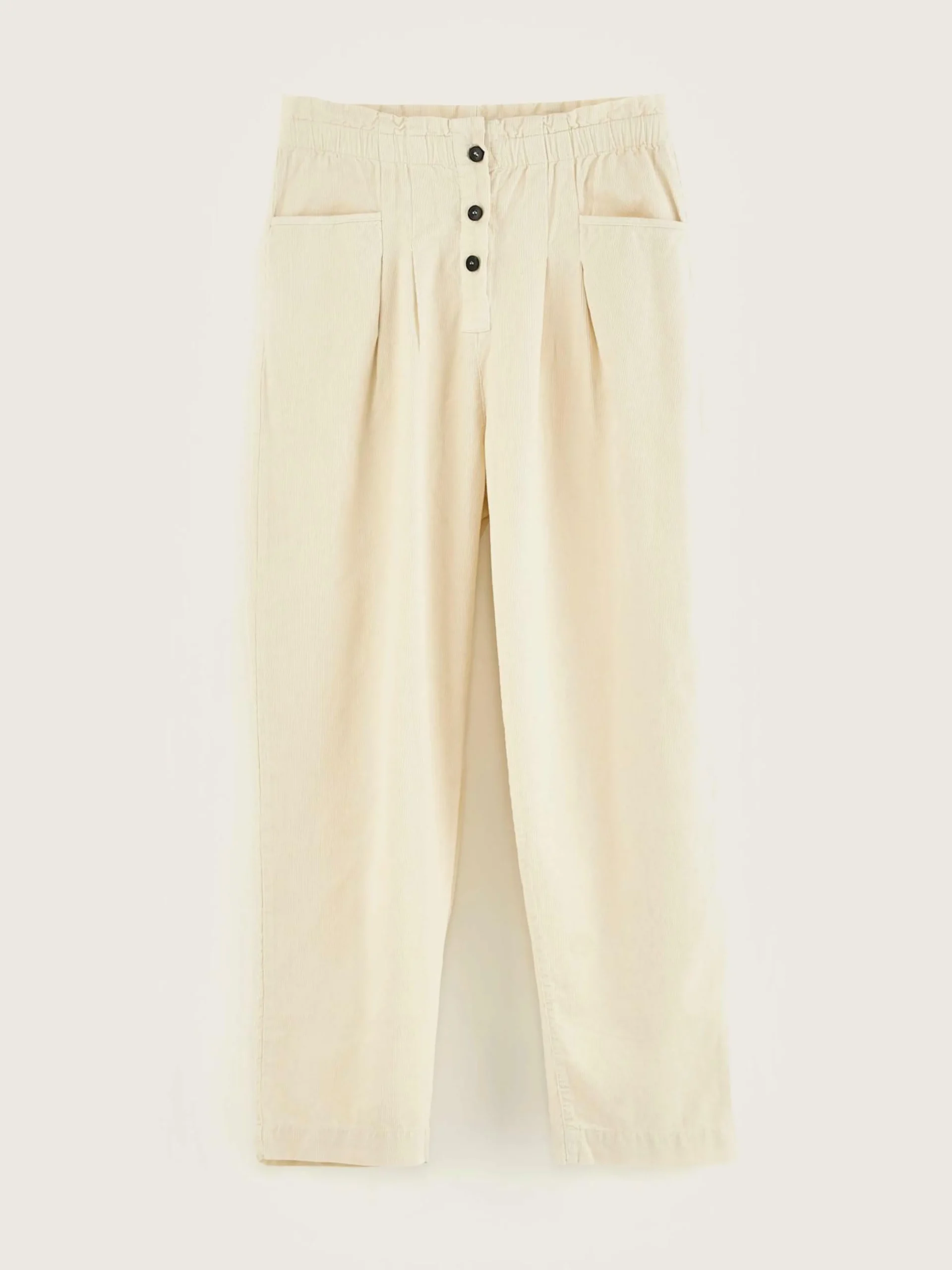 Pantalon taille haute et élastiquée et jambes fuselées décontractées en toile de coton et lin couleur beige.