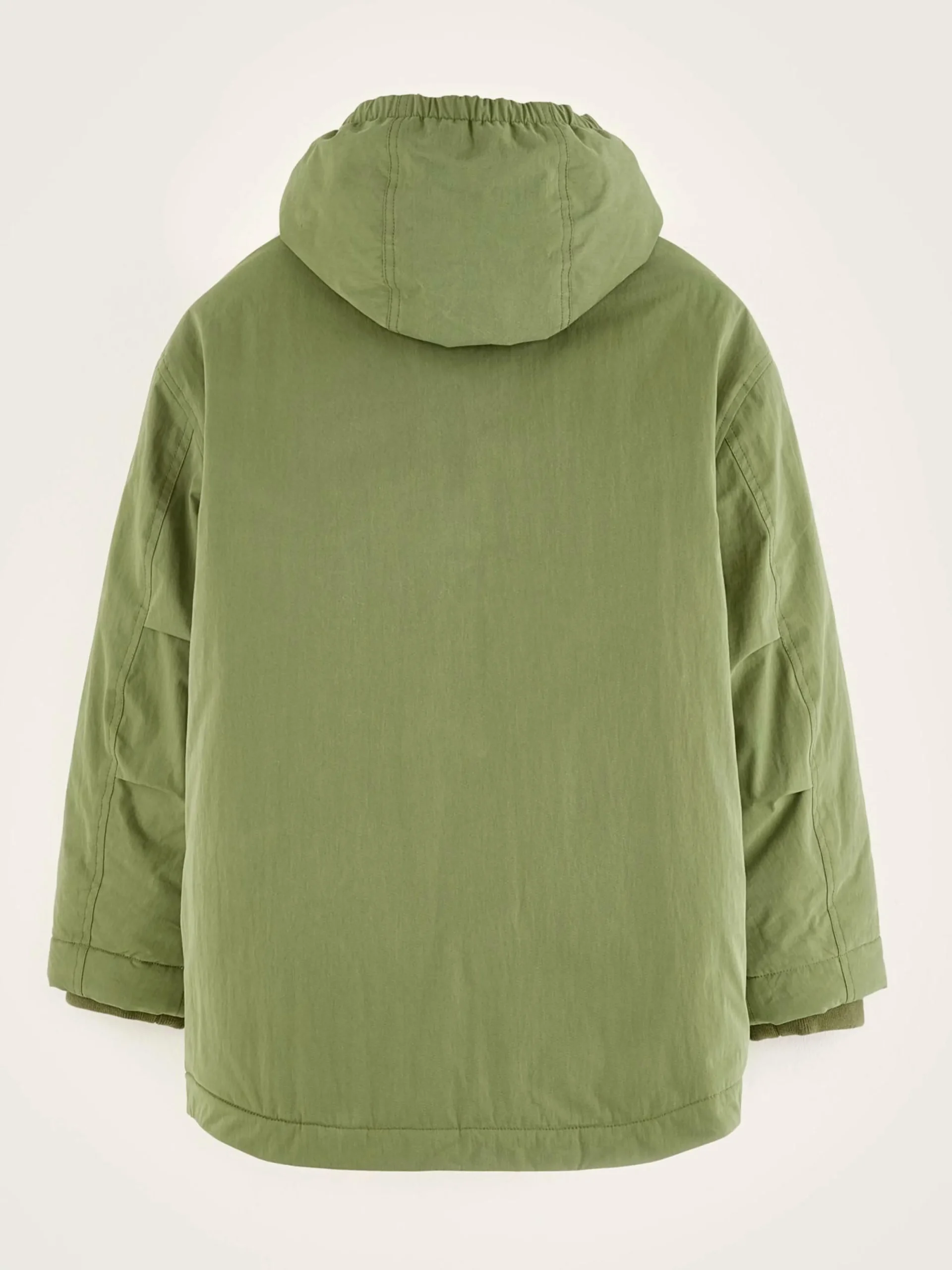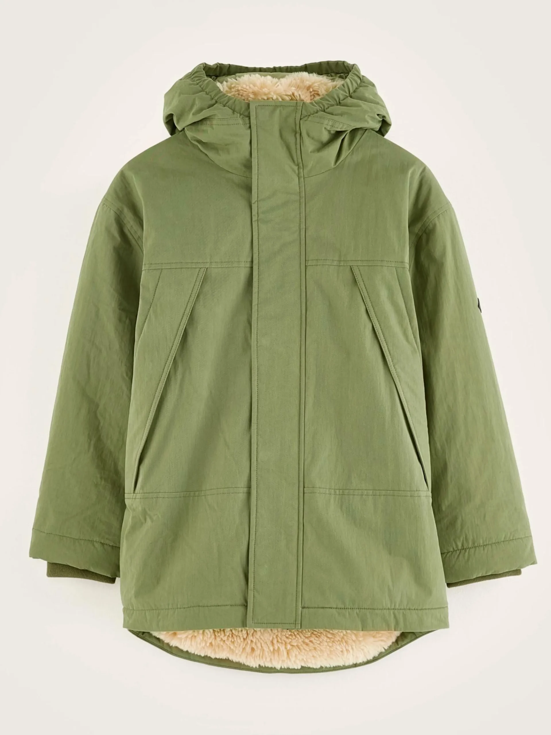 Parka à capuche kaki, coupe classique, poches obliques zippées et doublure en fausse fourrure.