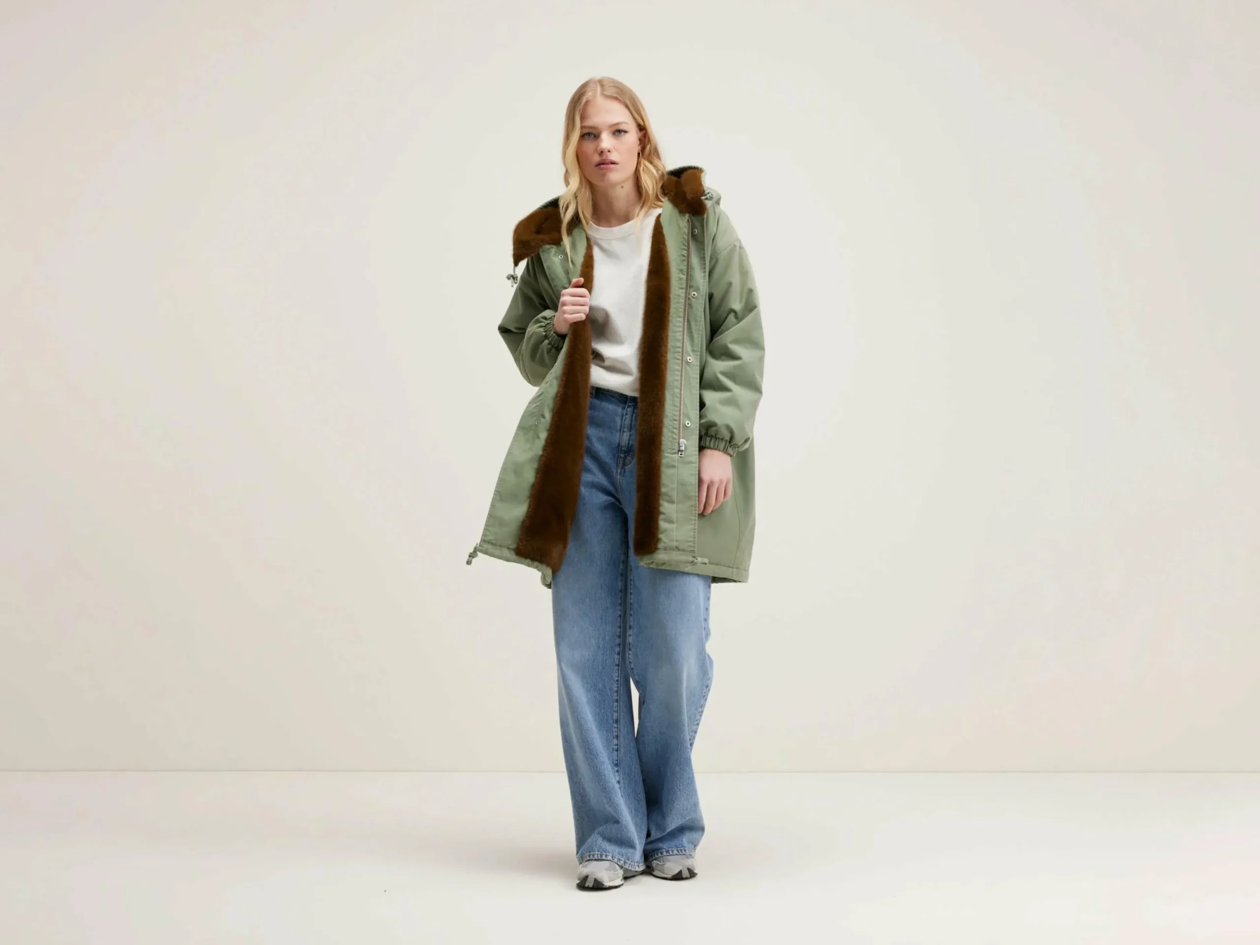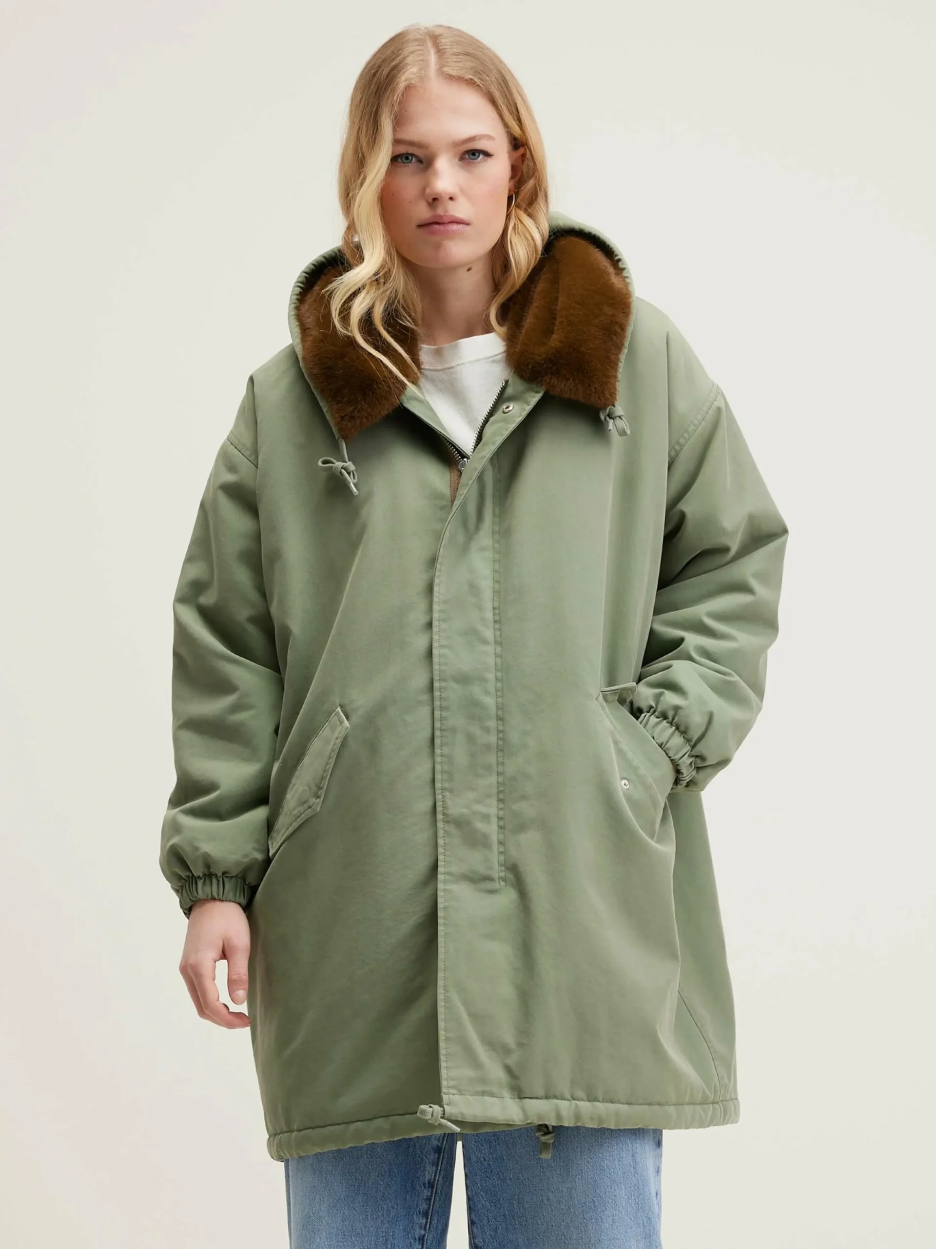 Parka oversize en toile vert eucalyptus, doublée de fausse fourrure brune.