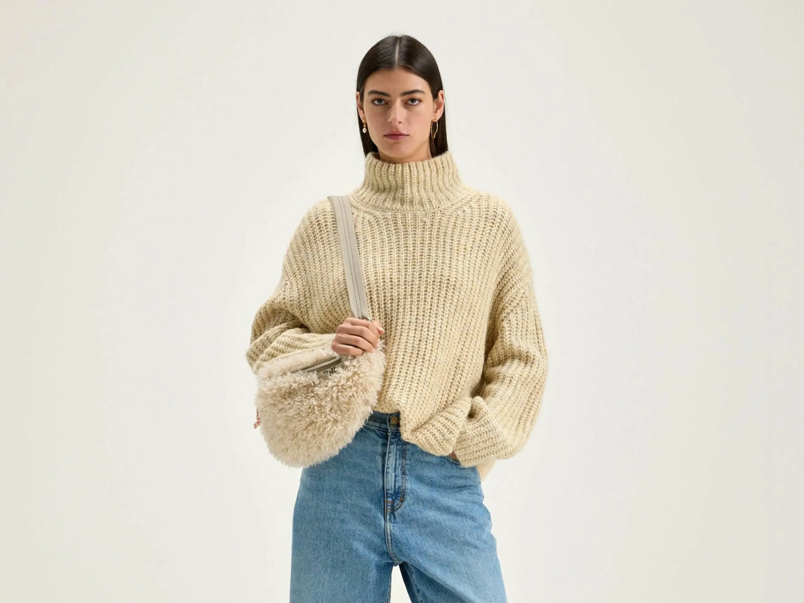 Pull à col cheminée, coupe oversize et droite en maille côtelée beige chiné.