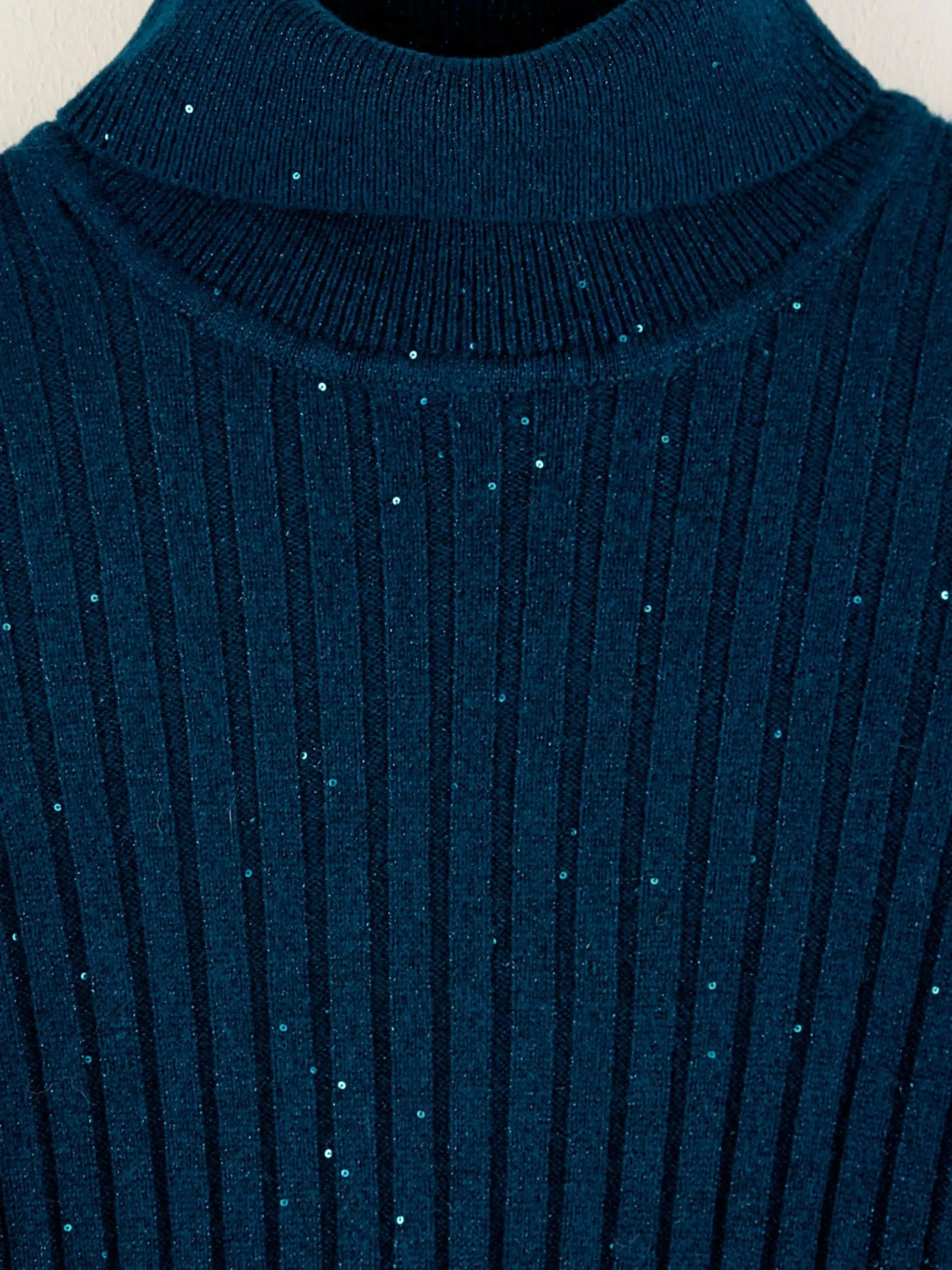 Pull slim à col montant en laine mérinos couleur bleu jean et fini brillant façon lurex.