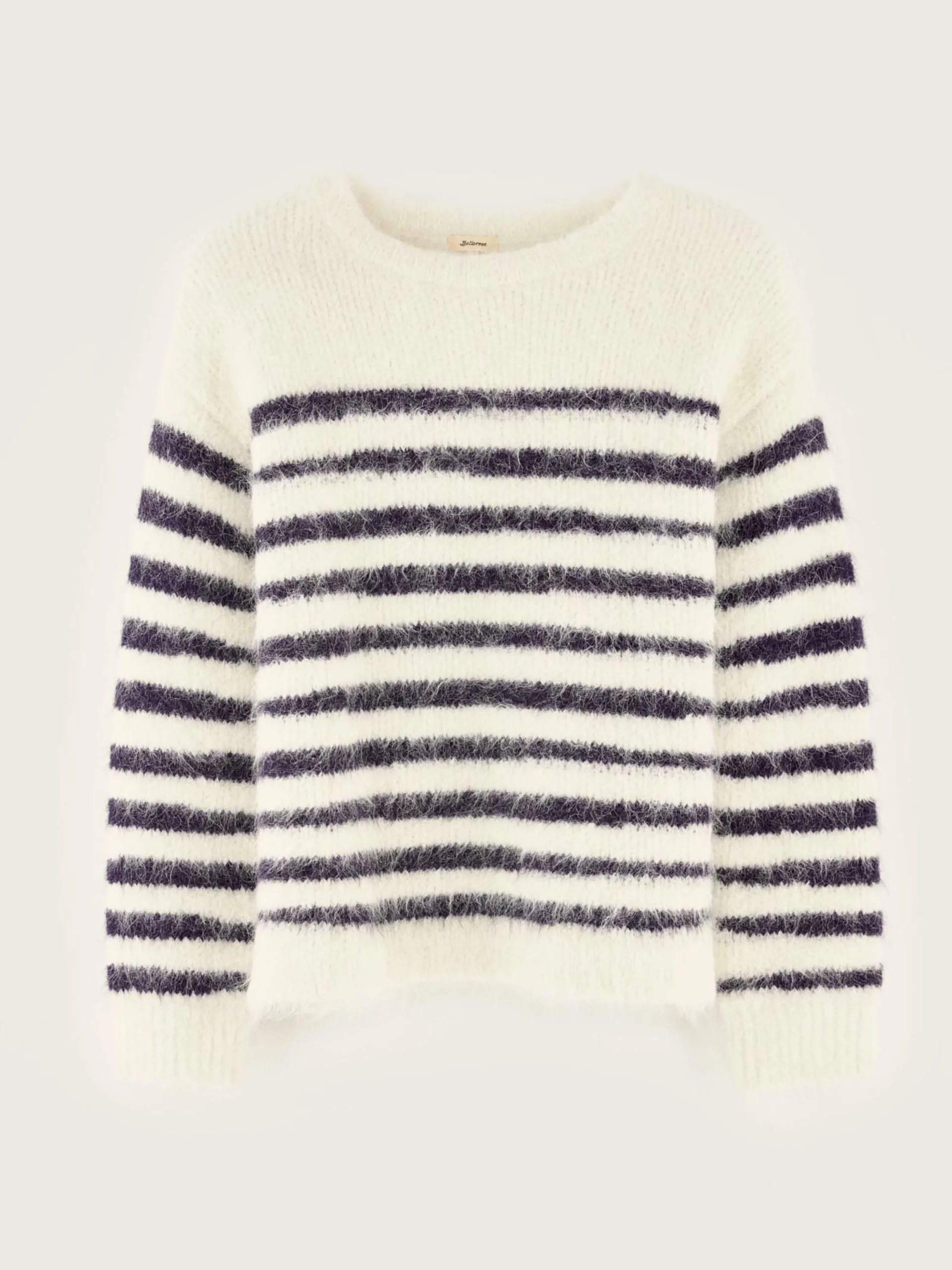 Pull classique à rayures irrégulières bleu marine et blanc ivoire.