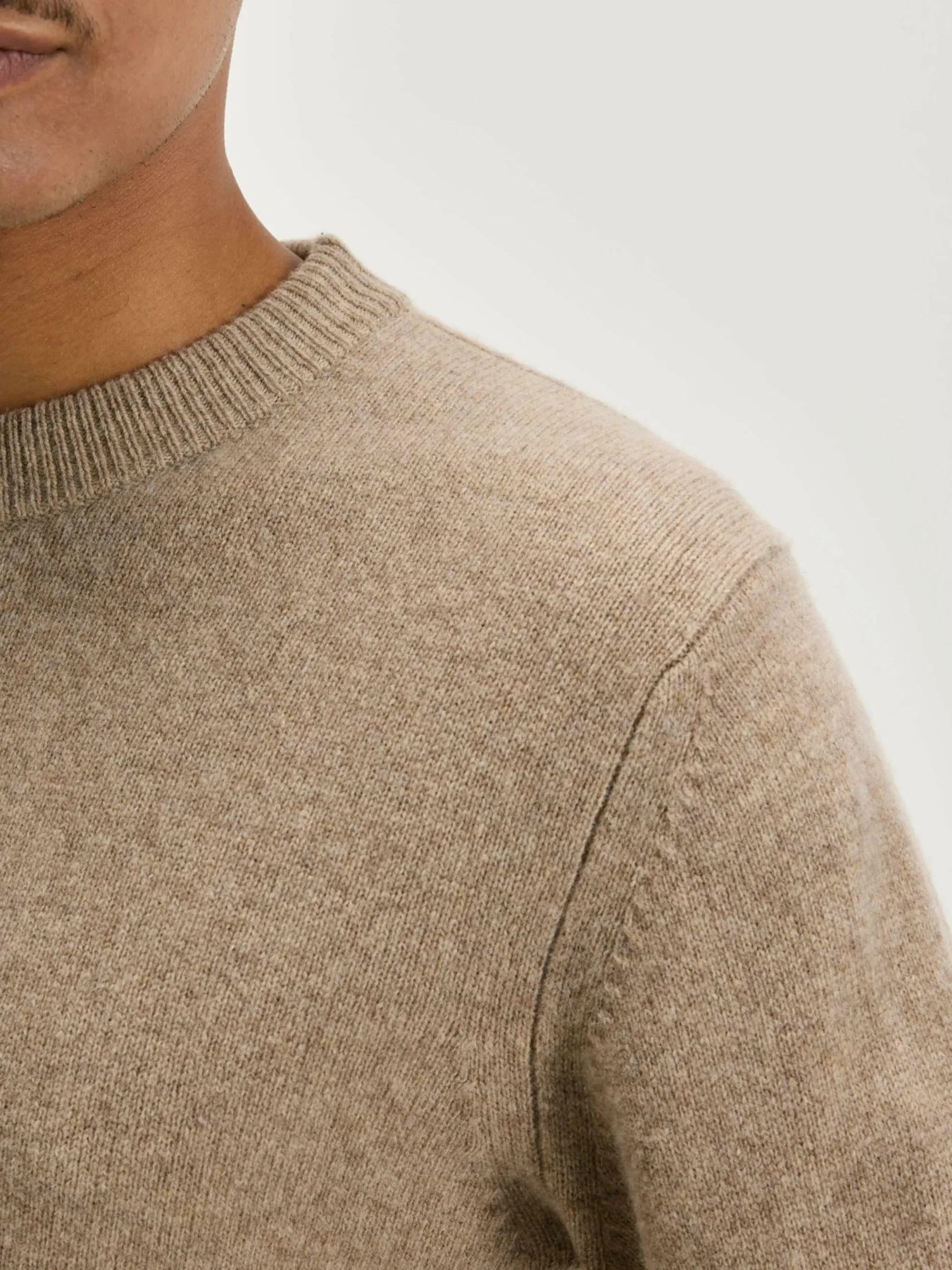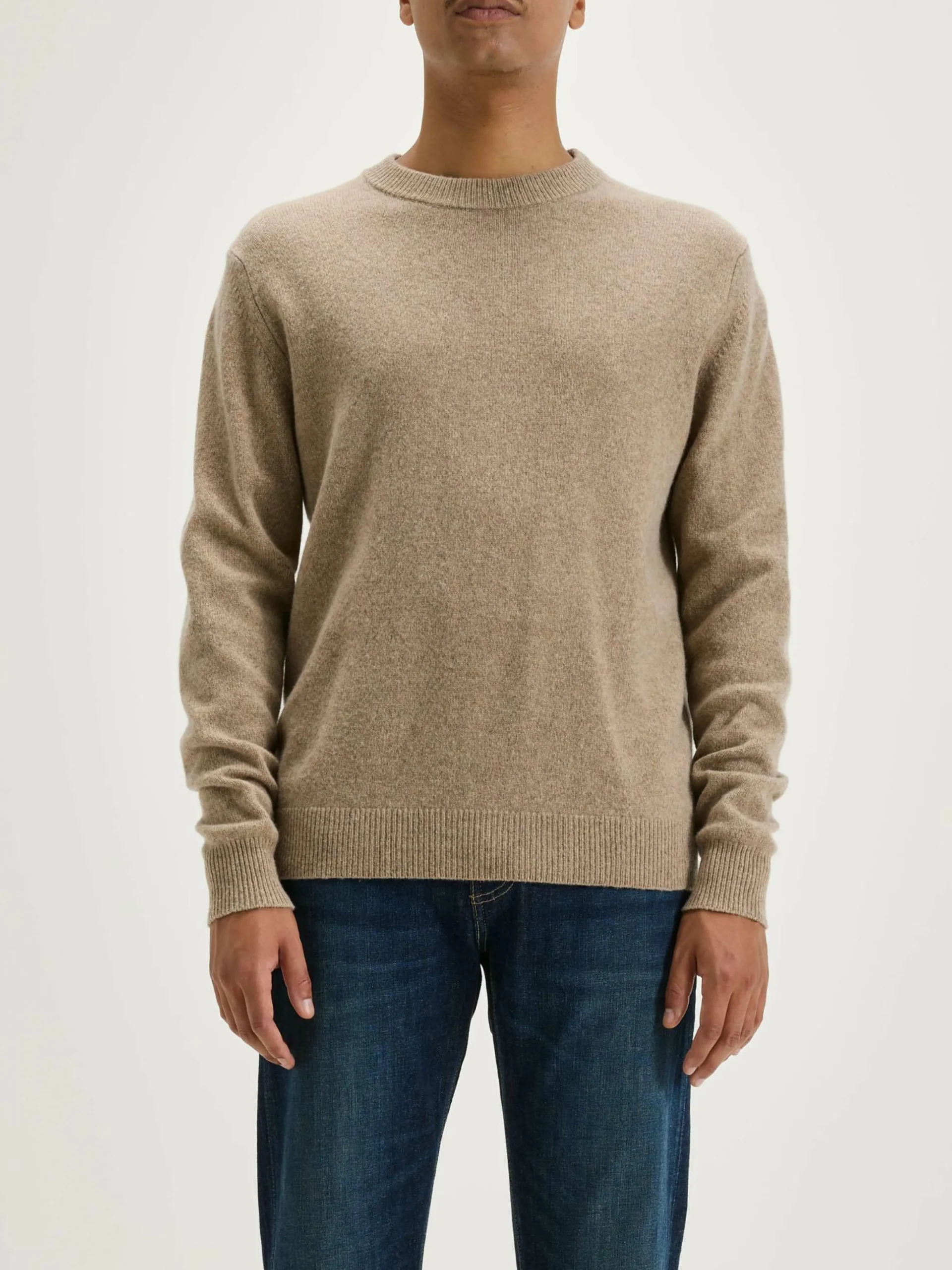 Pull classique à col rond en laine mérinos beige.