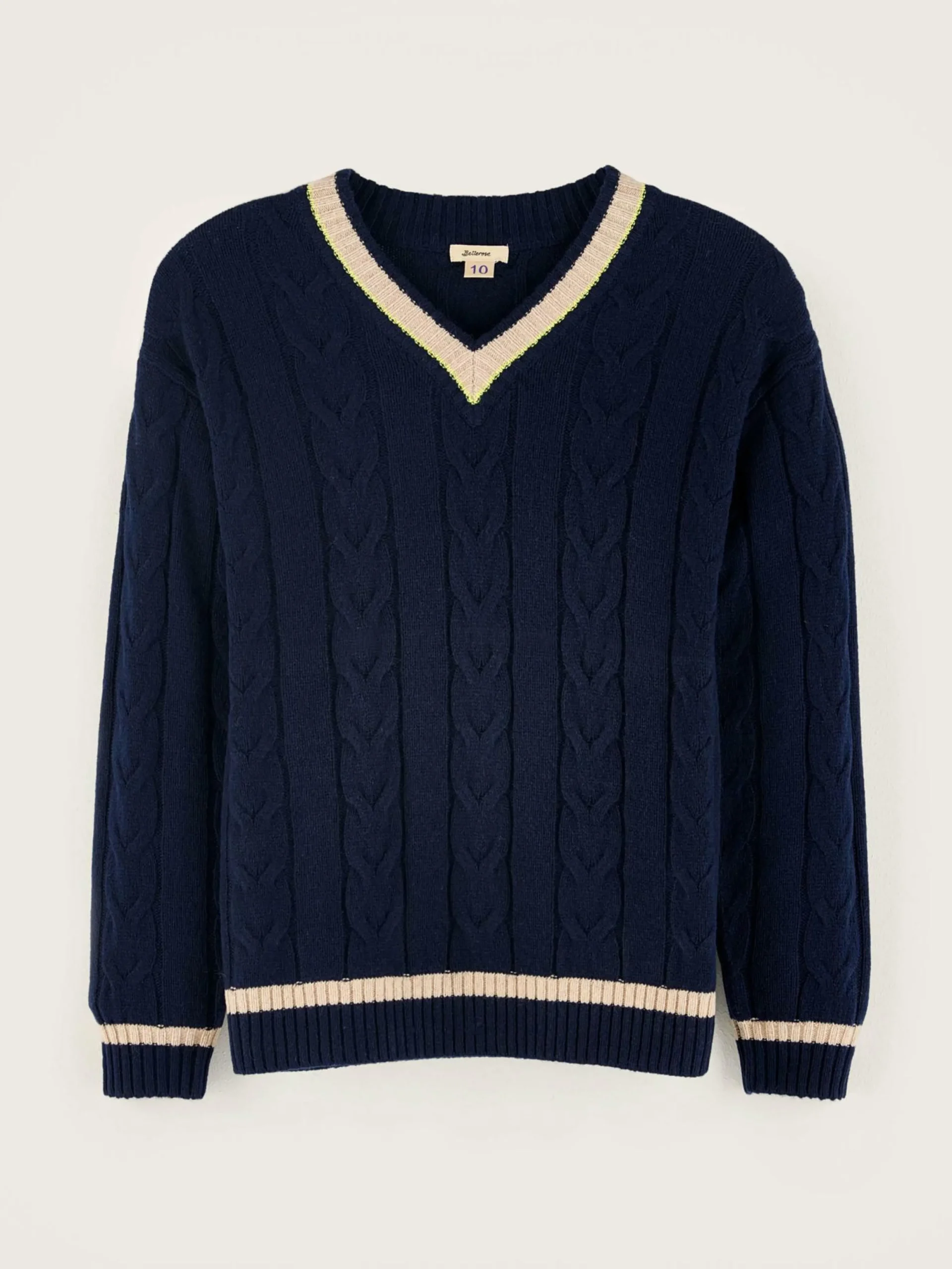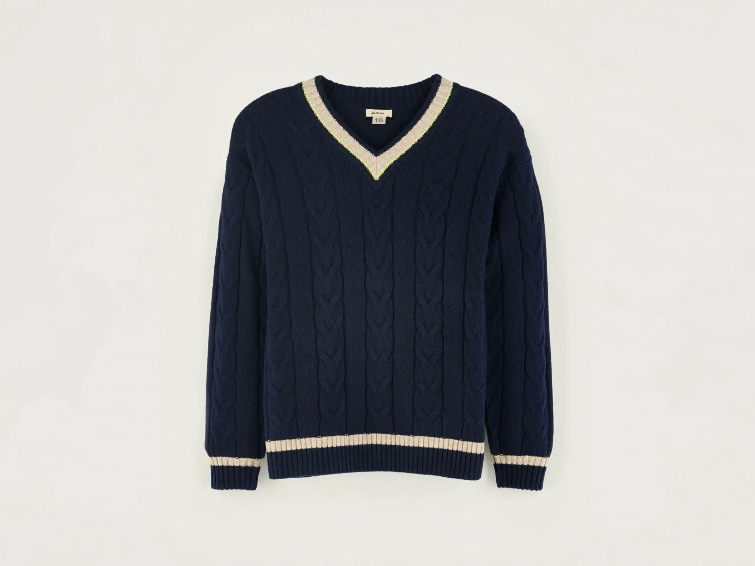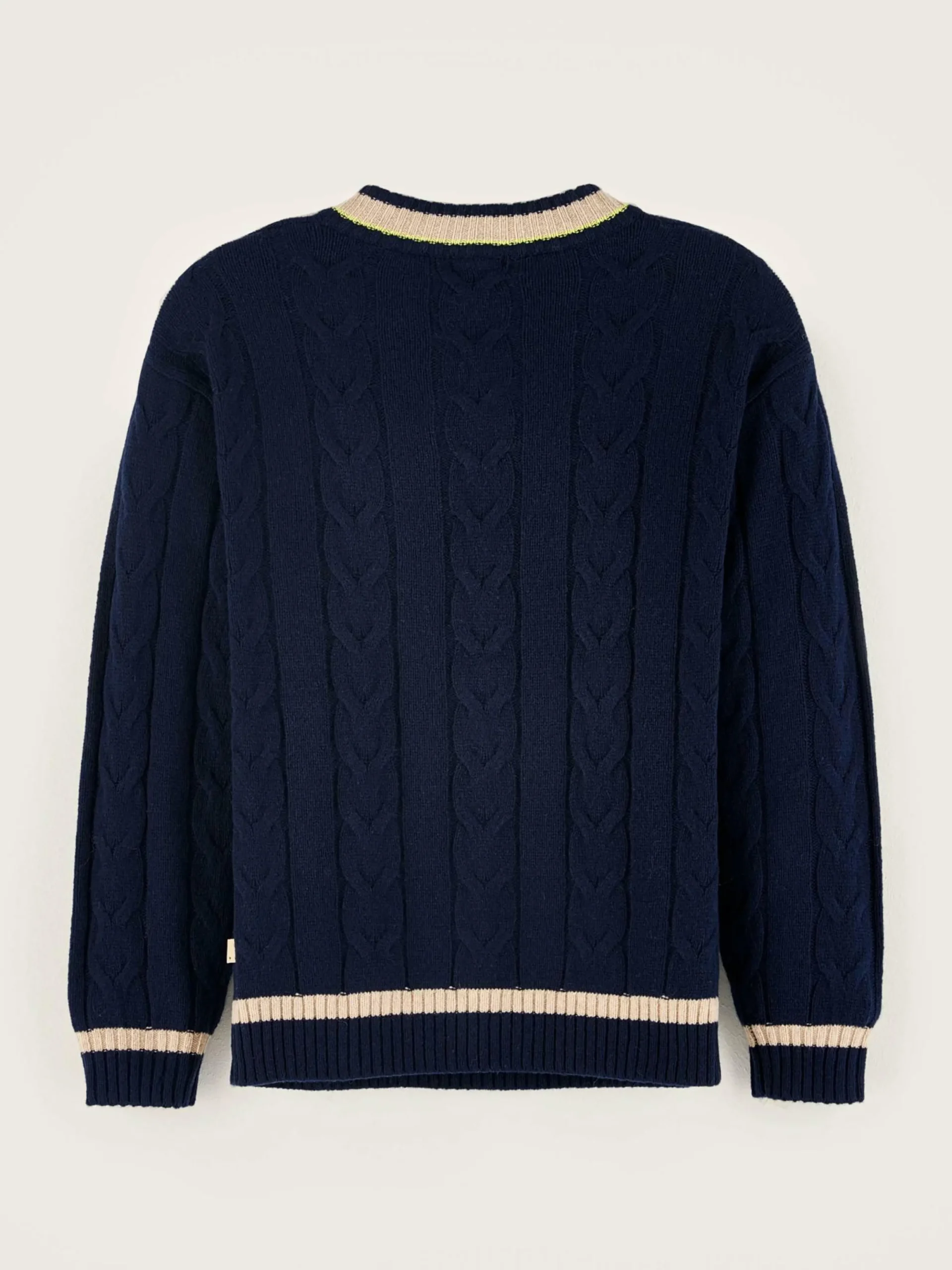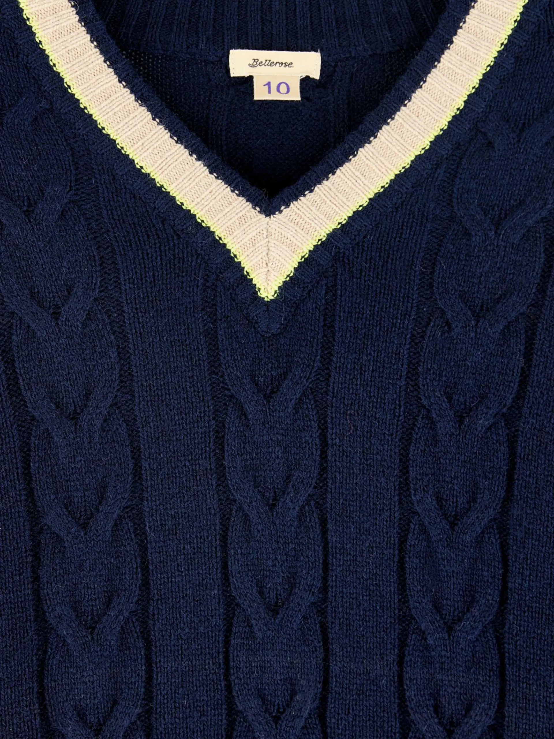 Pull décontracté, maille torsadée, col en V, couleur bleu foncé.