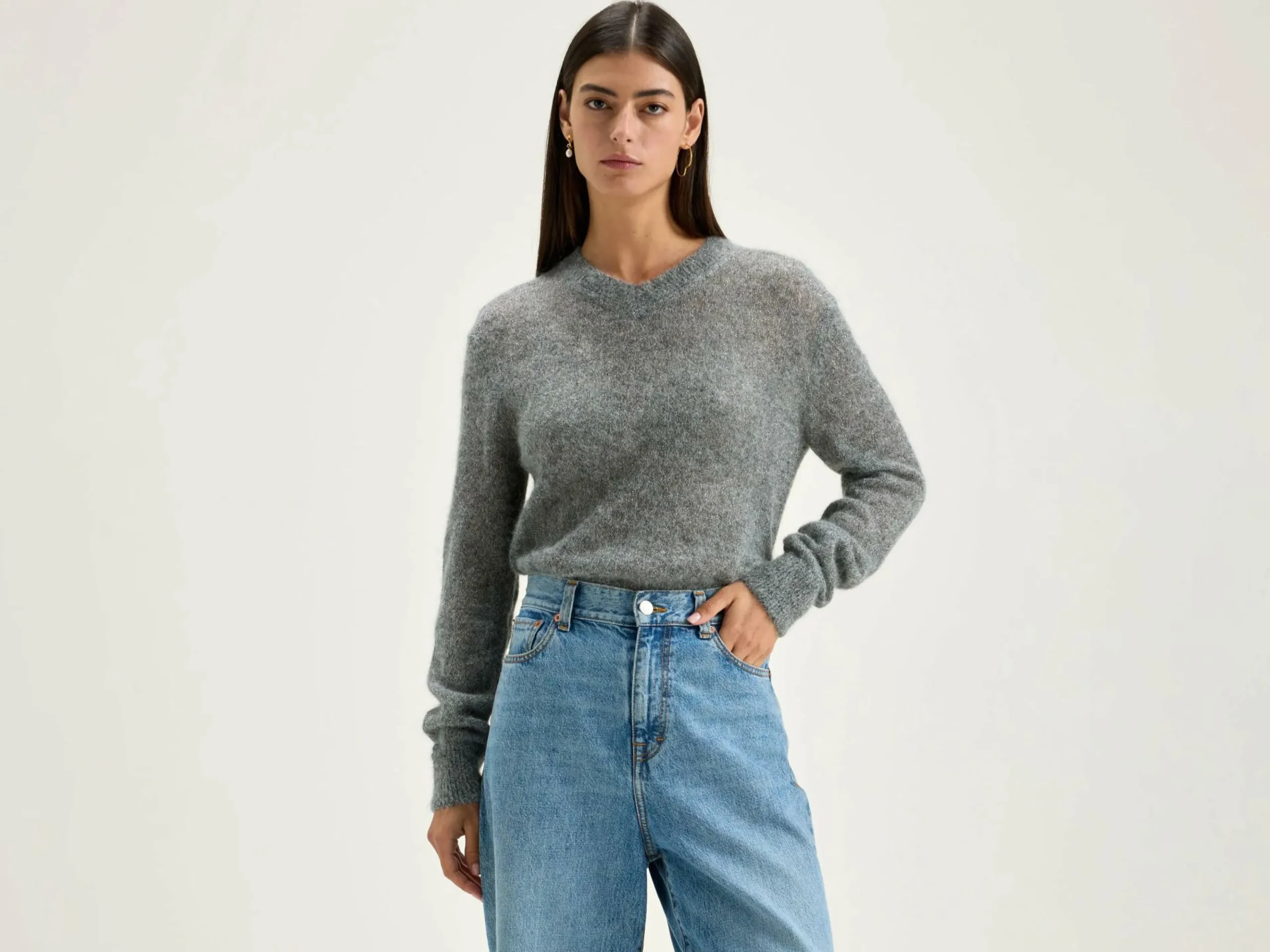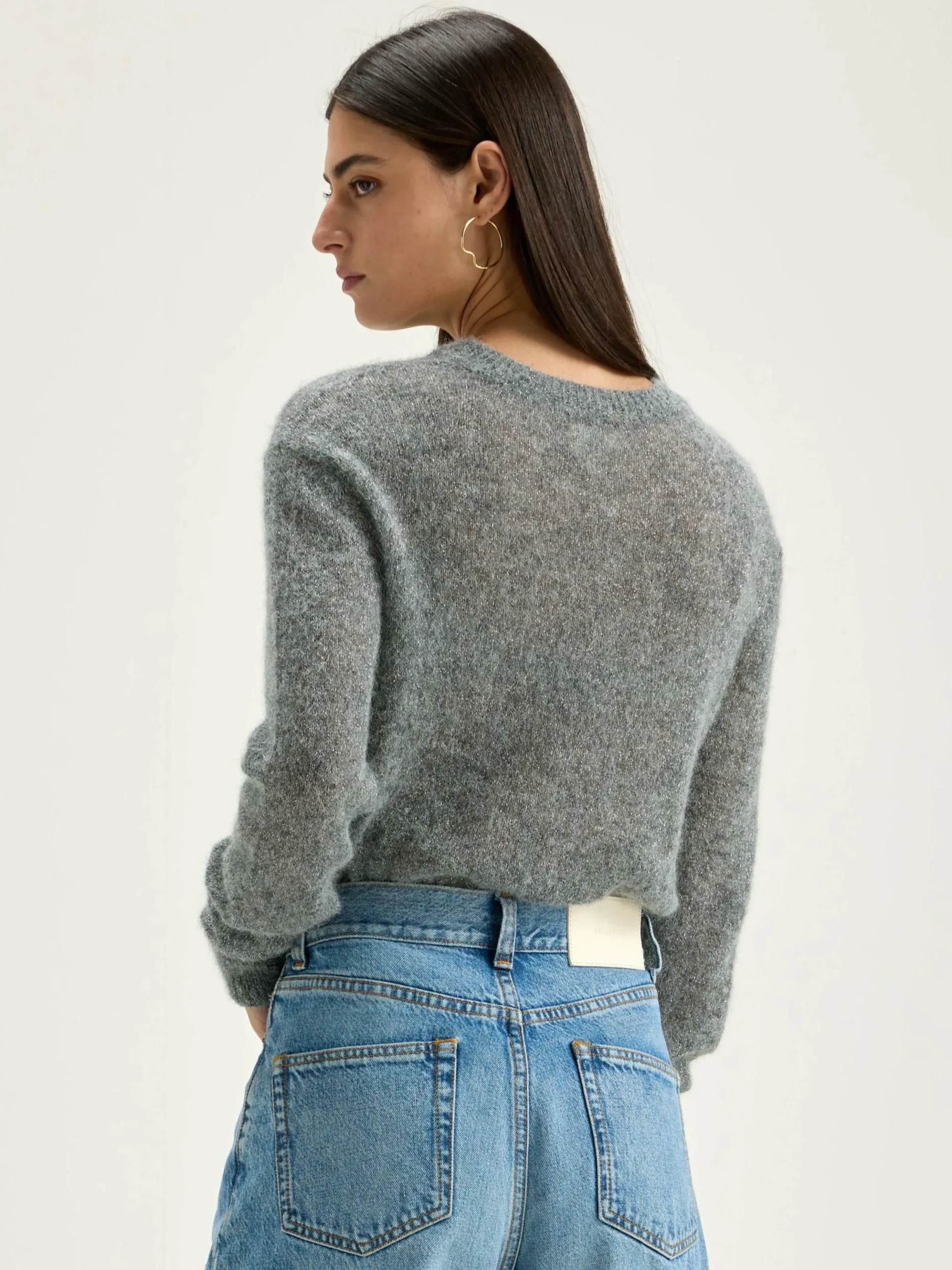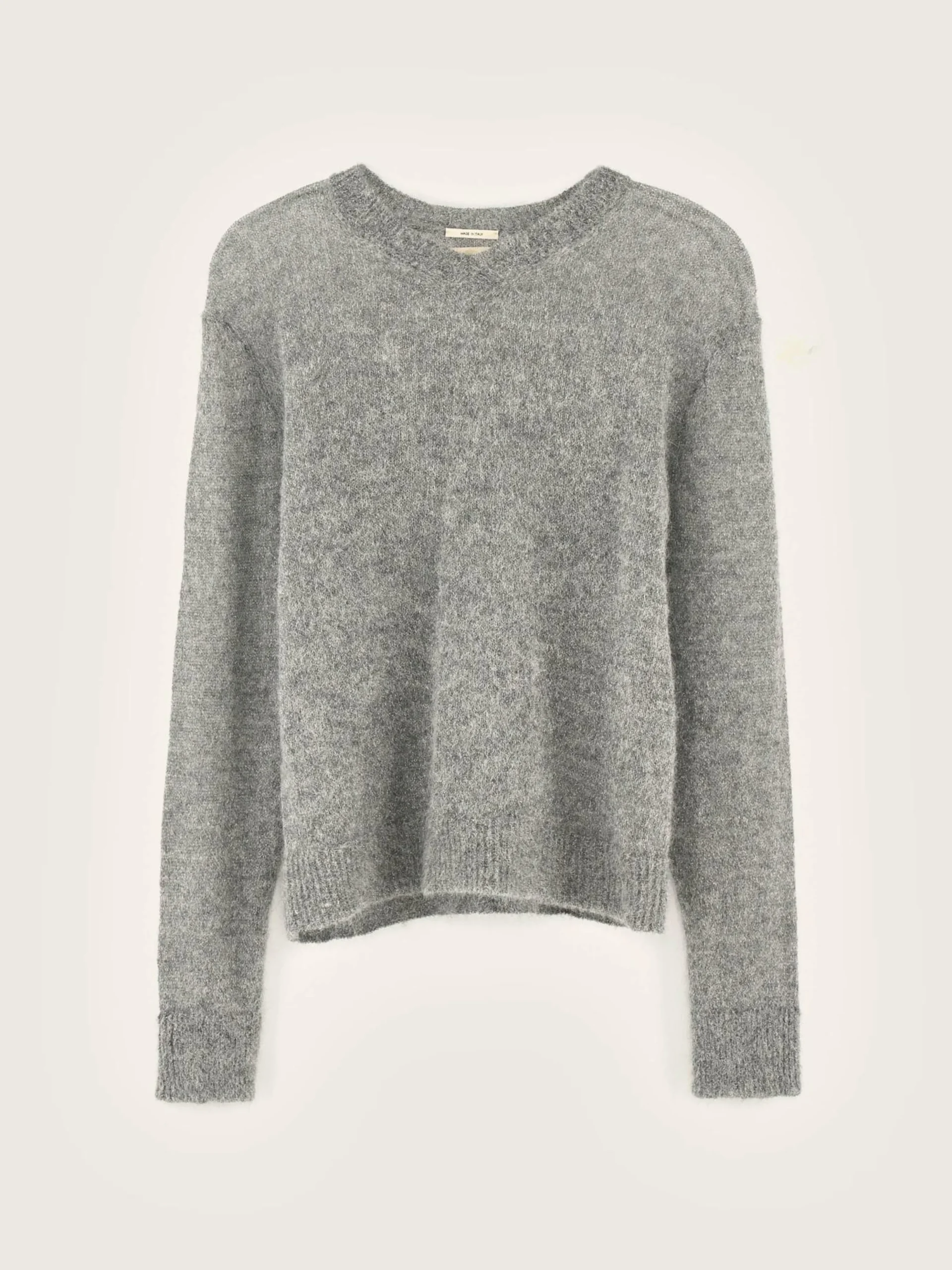 Pull classique à col V tricoté dans un fil italien gris moyen avec lurex et alpaga.