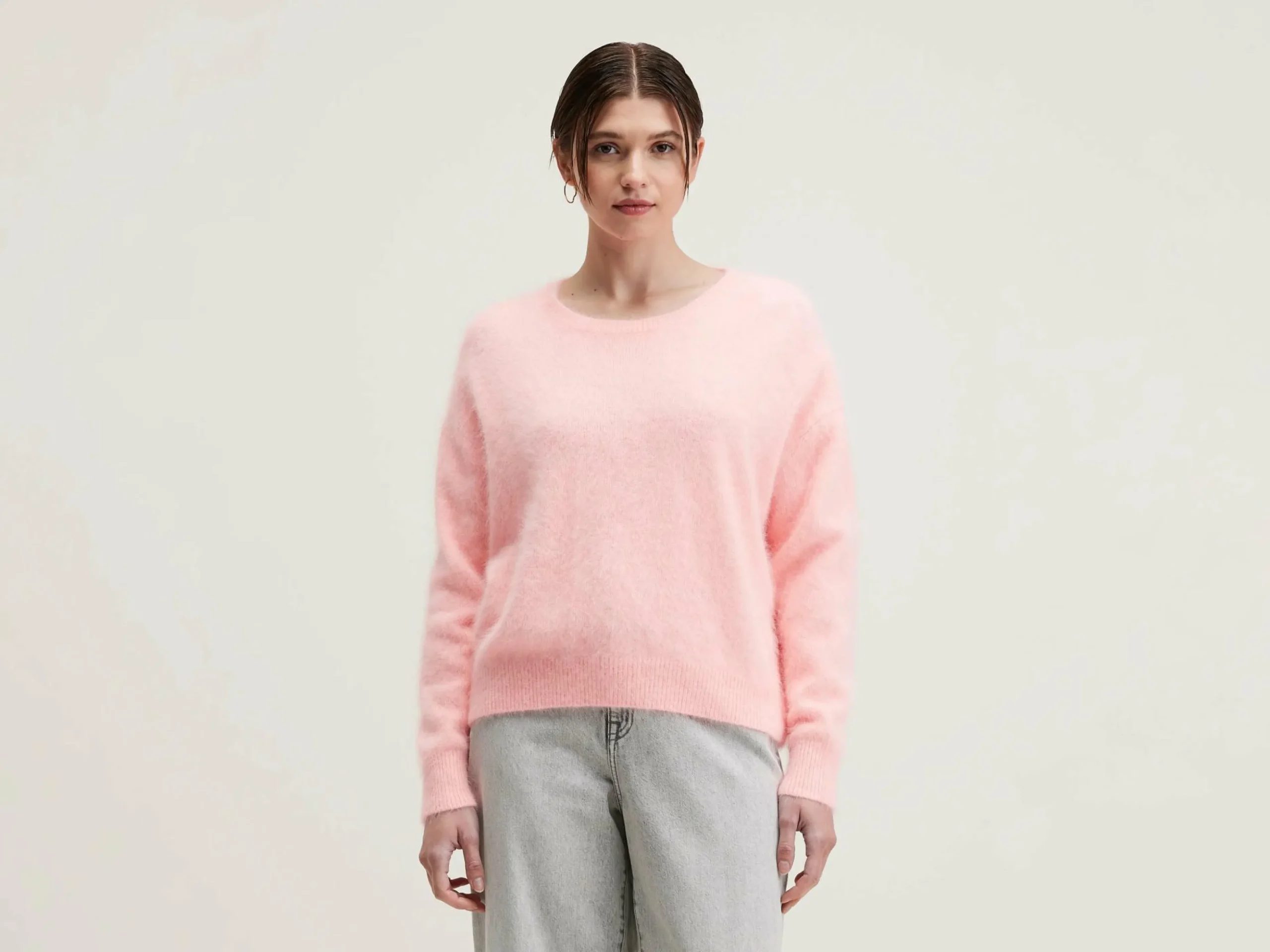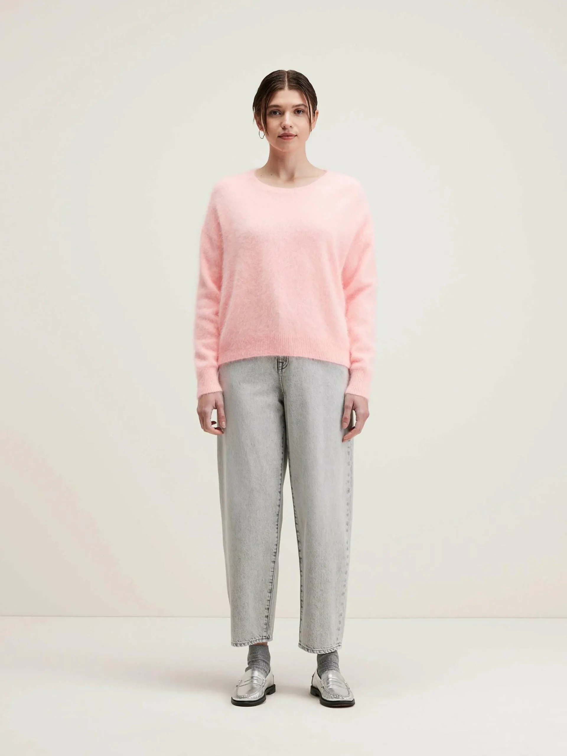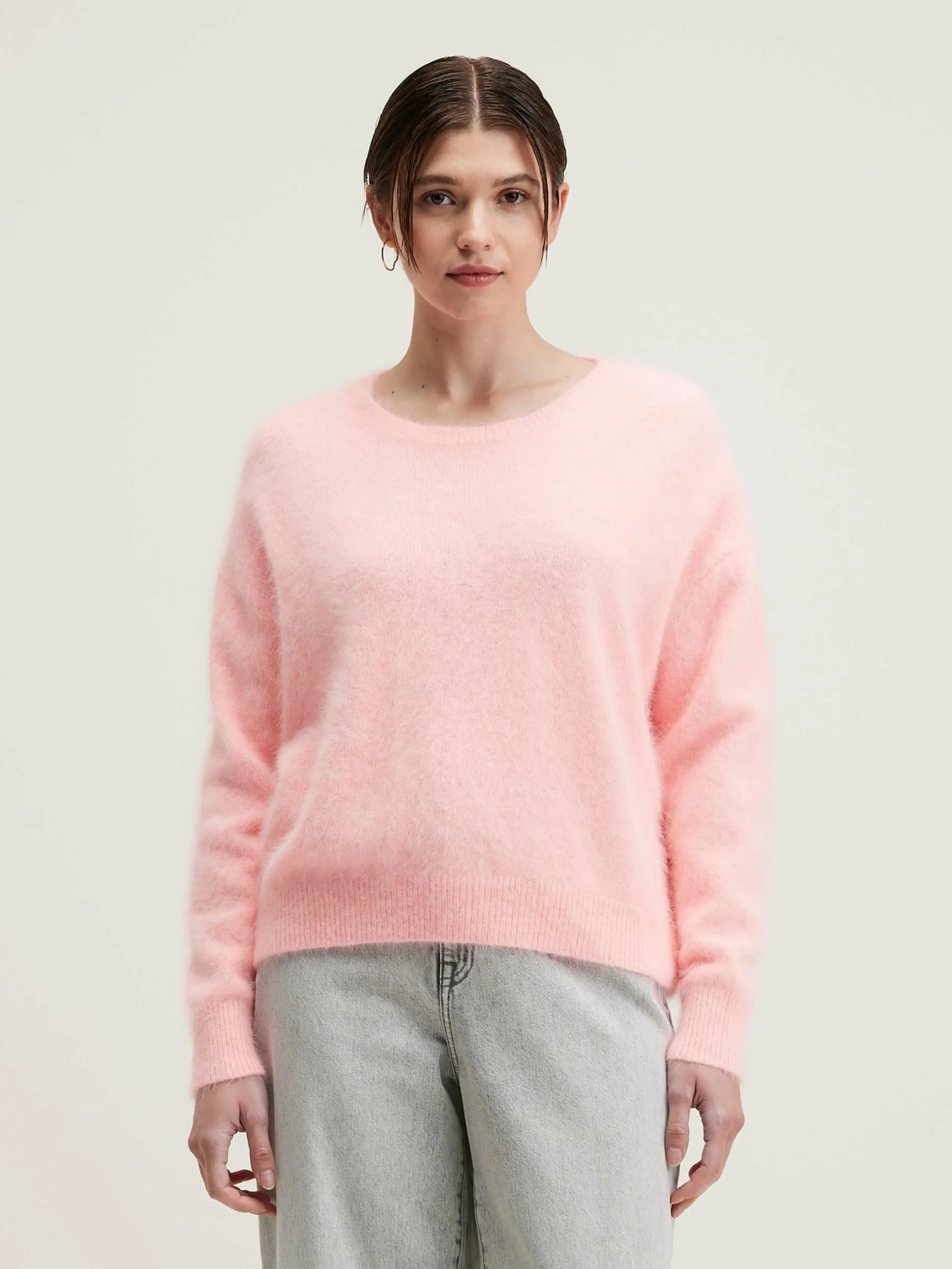 Pull oversize en angora mélangé, col rond, couleur rose tendre.