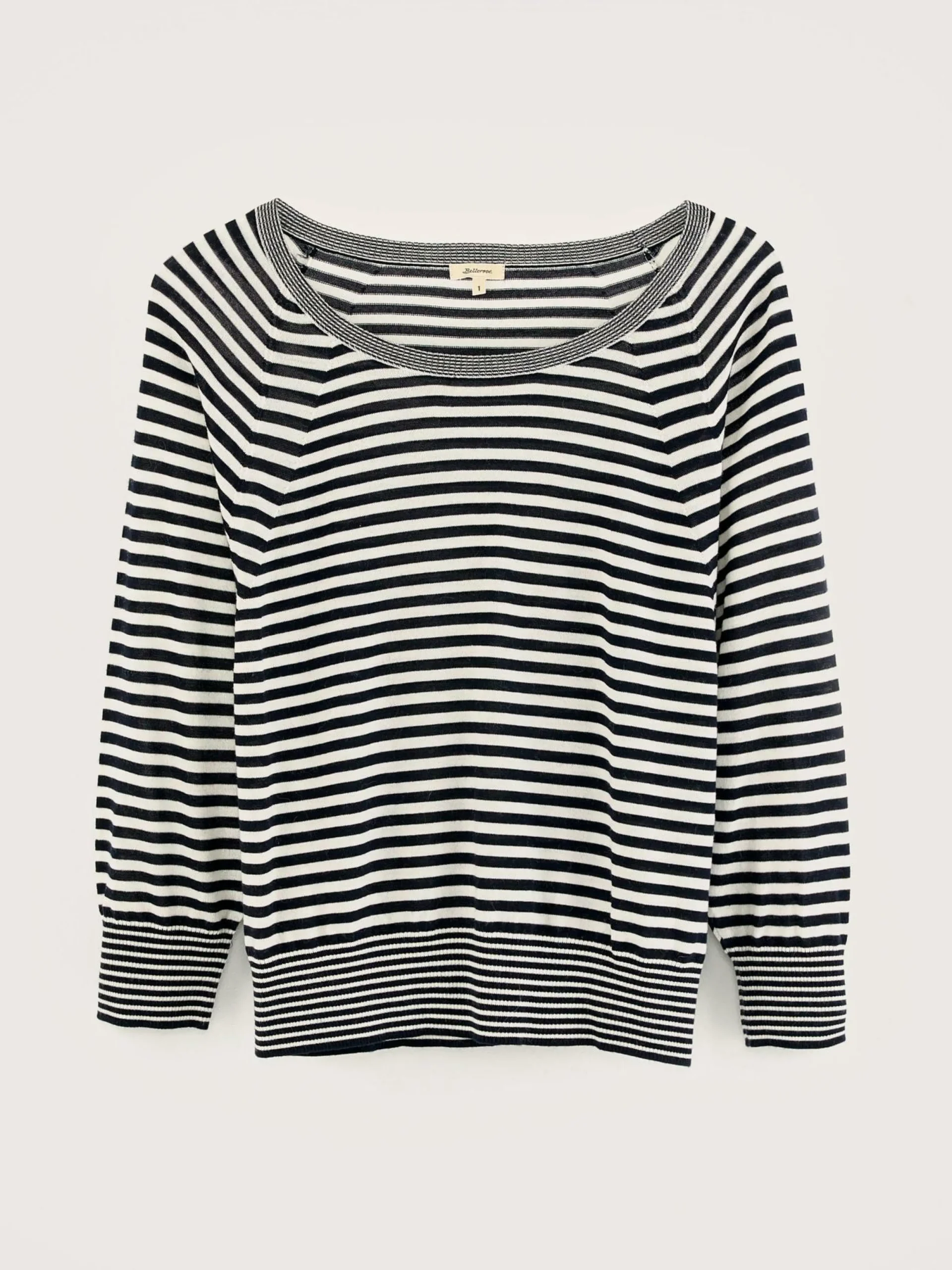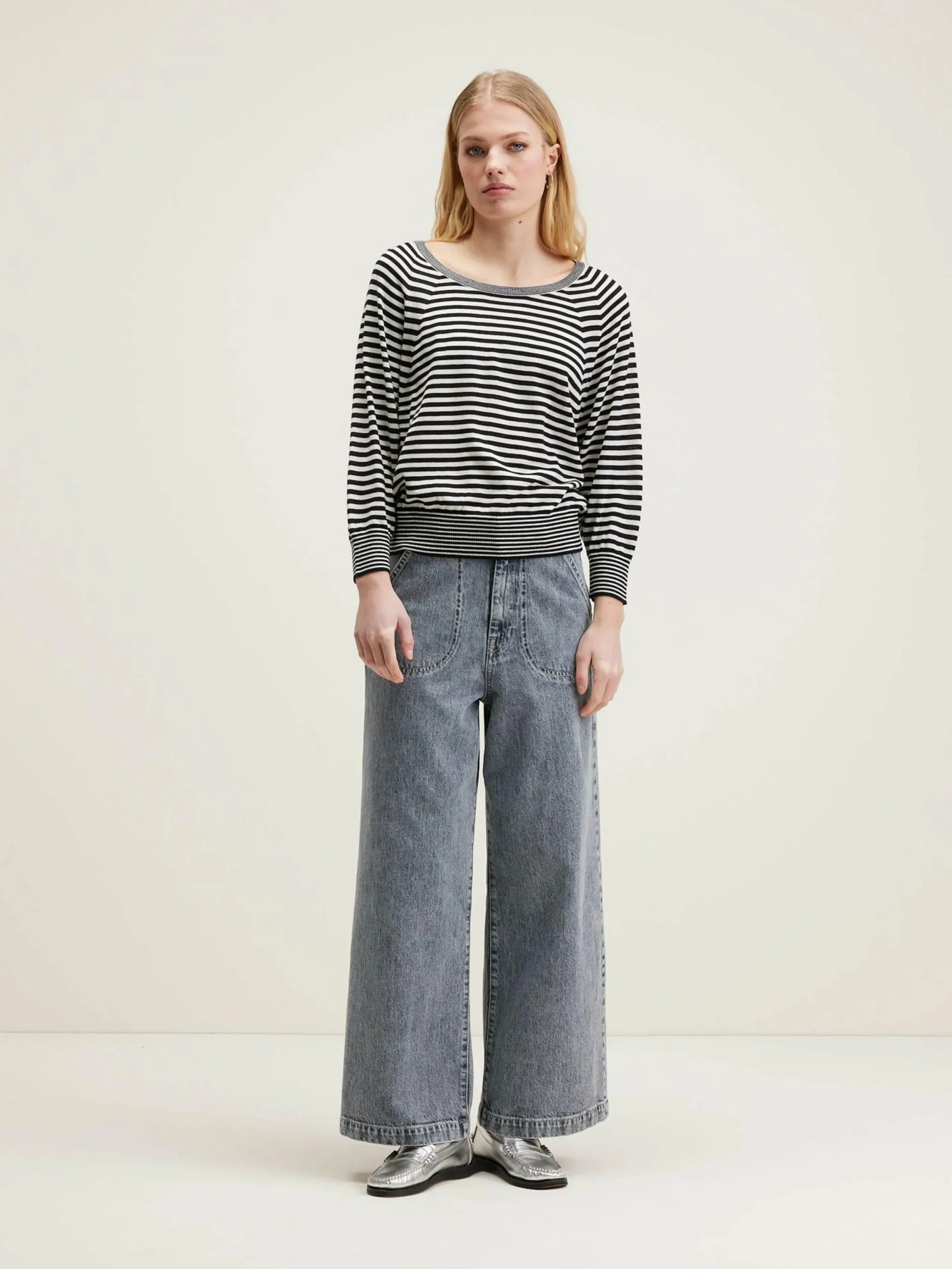 Pull à manches raglan en laine mérinos rayée noir et blanc.