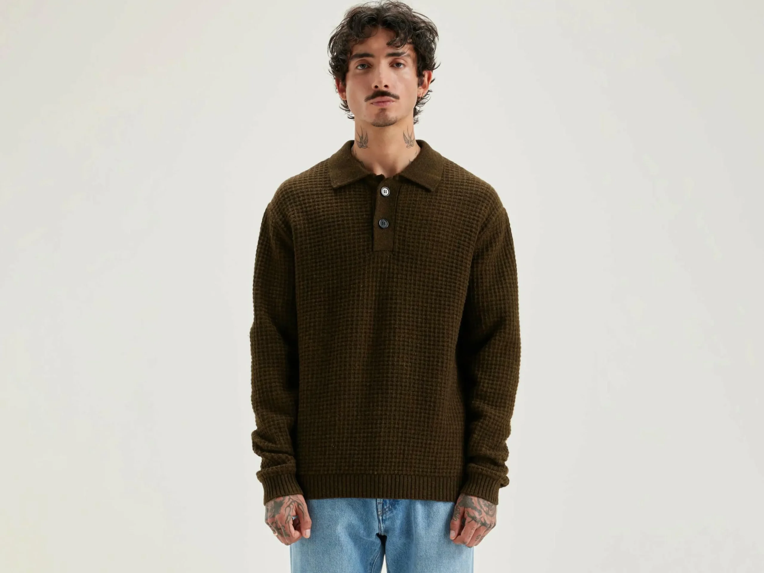 Pull style polo en laine vert olive tricotée en nid d’abeille.