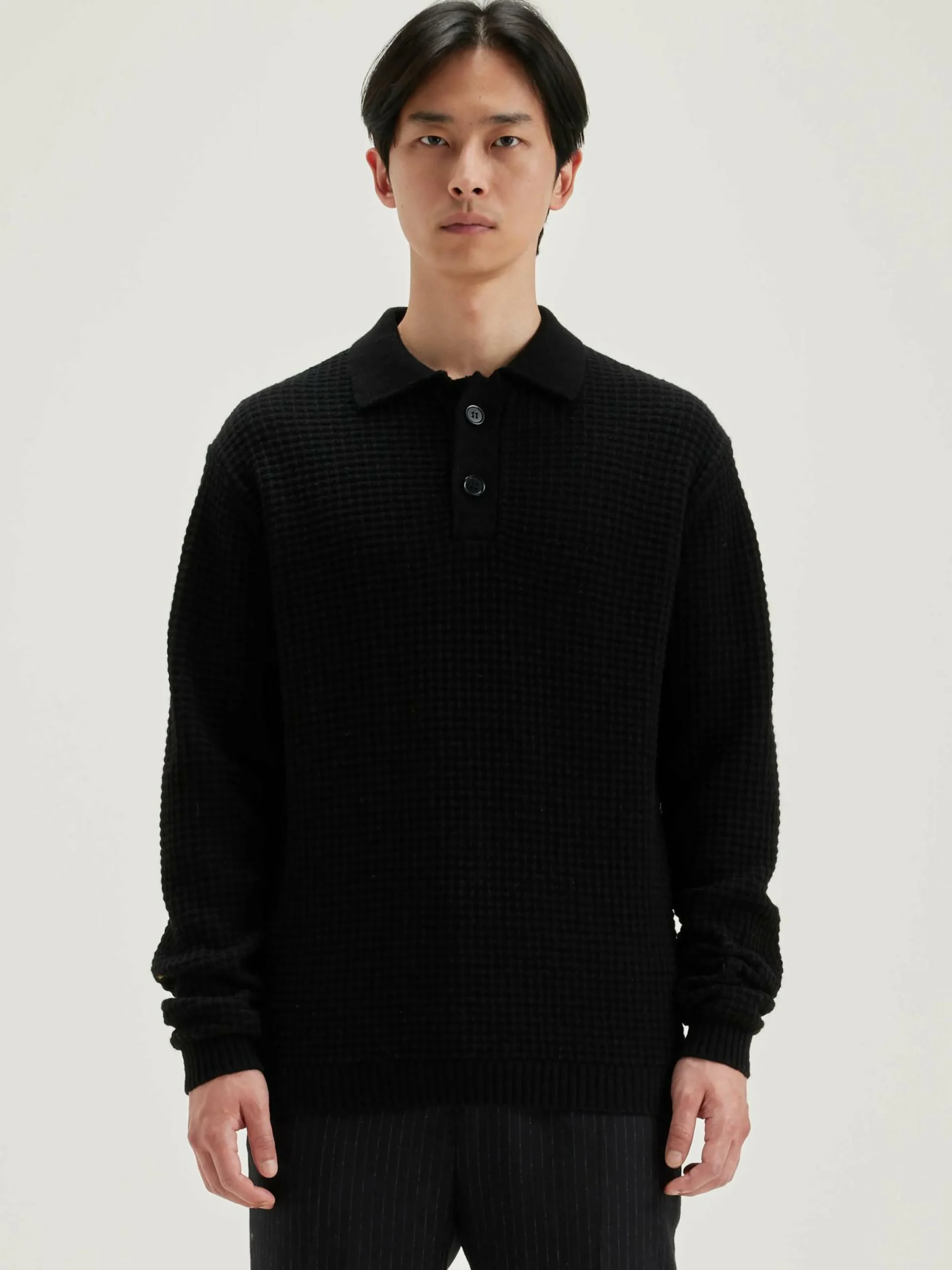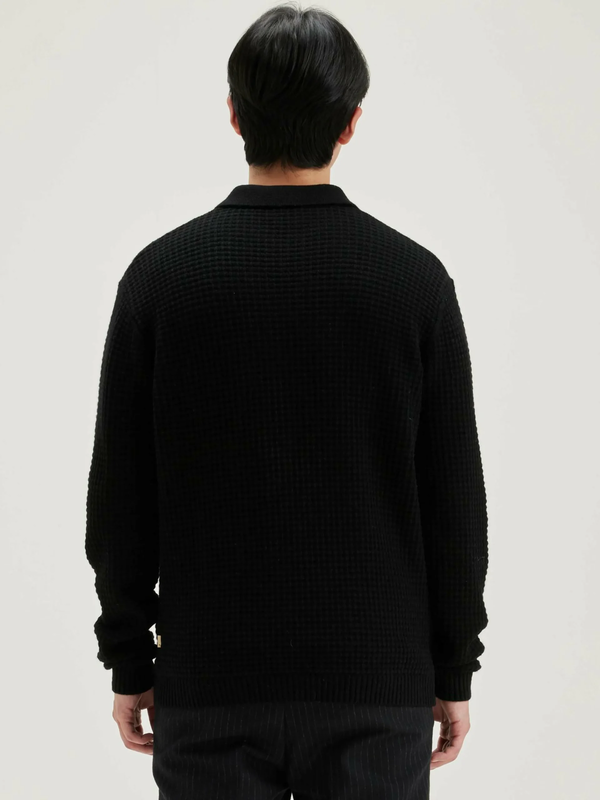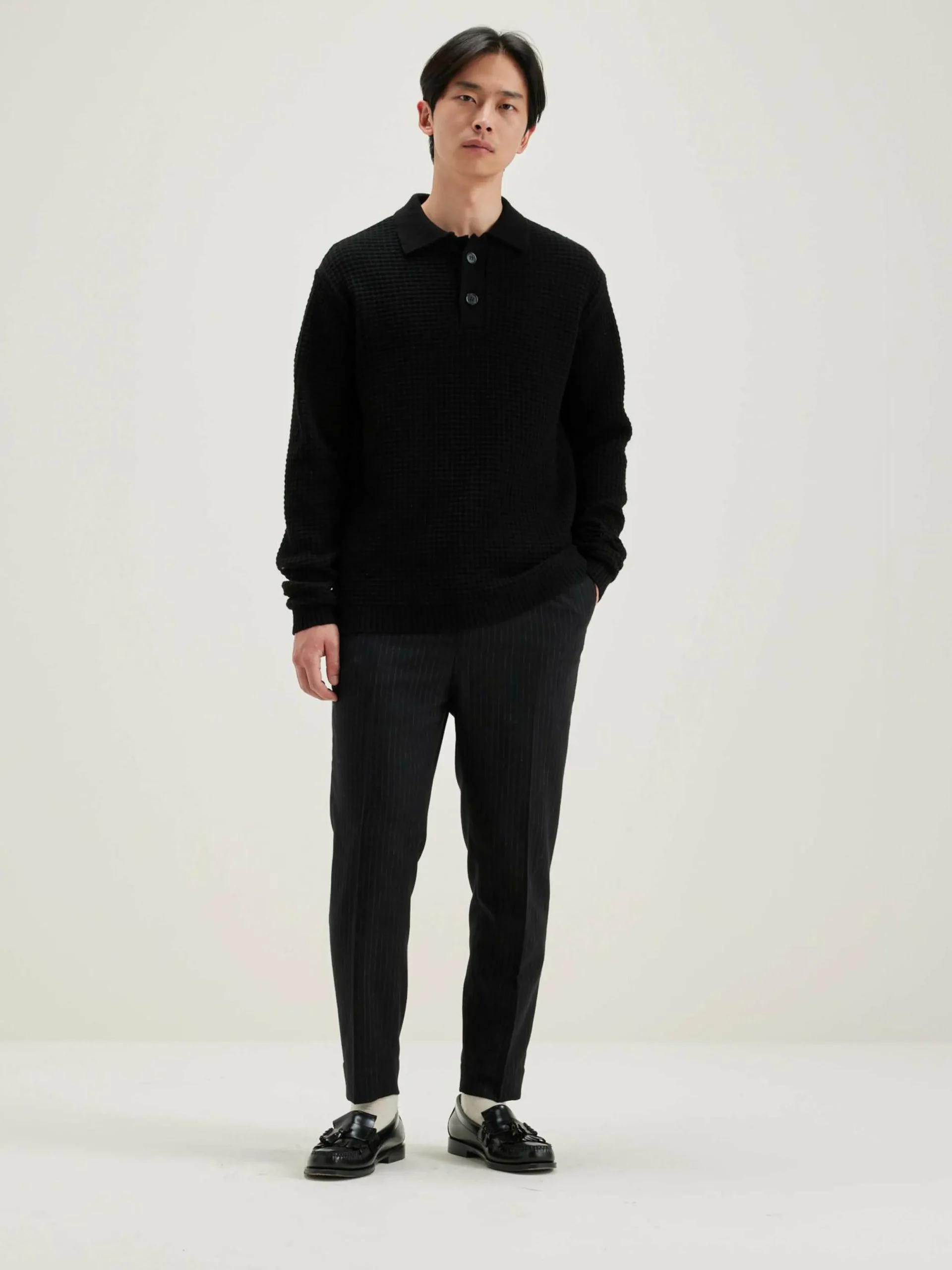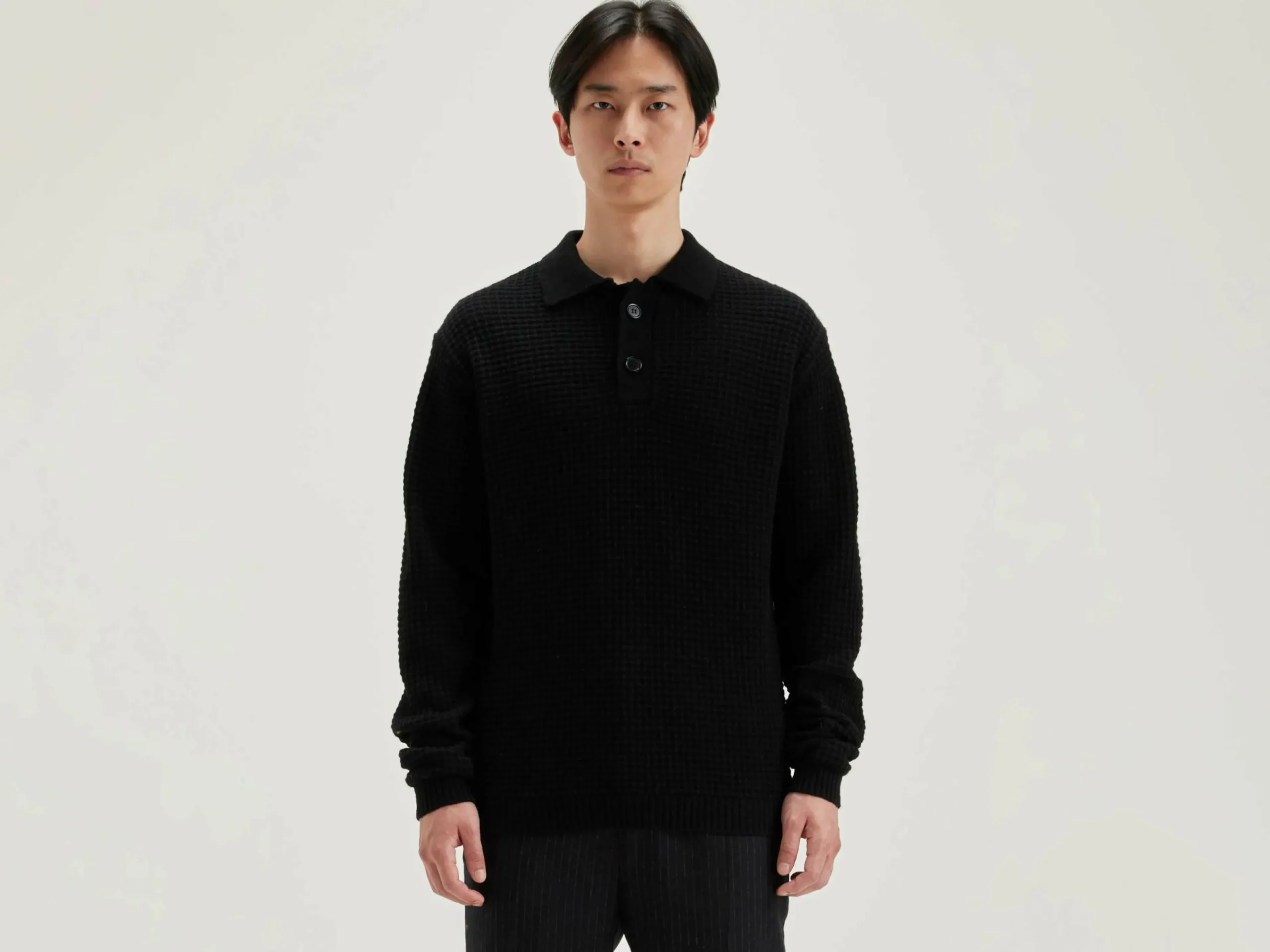 Pull style polo en laine noire tricotée en nid d’abeille.
