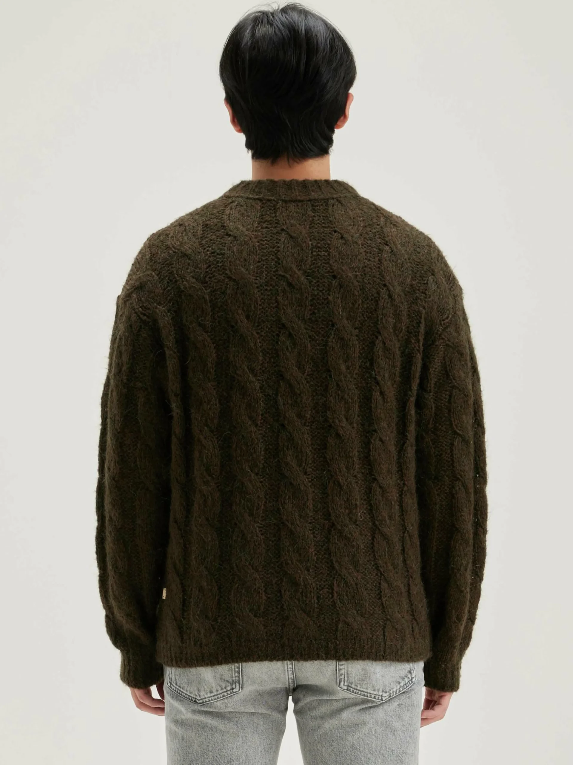 Pull à torsades, forme classique et col montant, couleur kaki chiné.