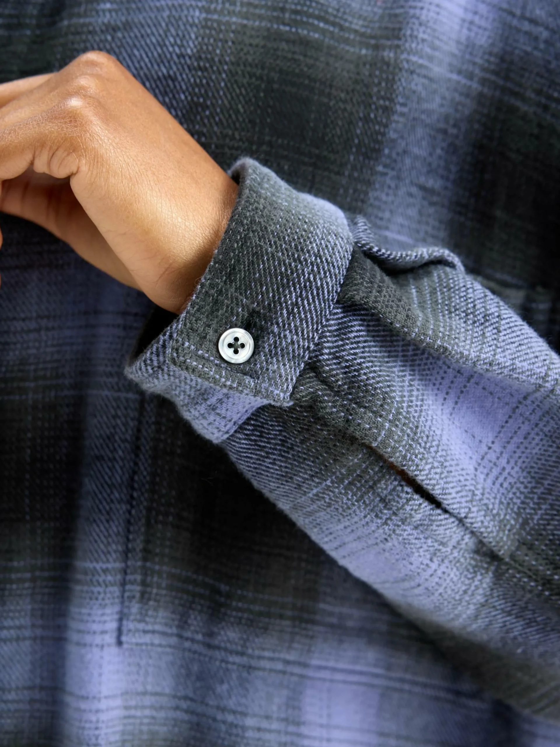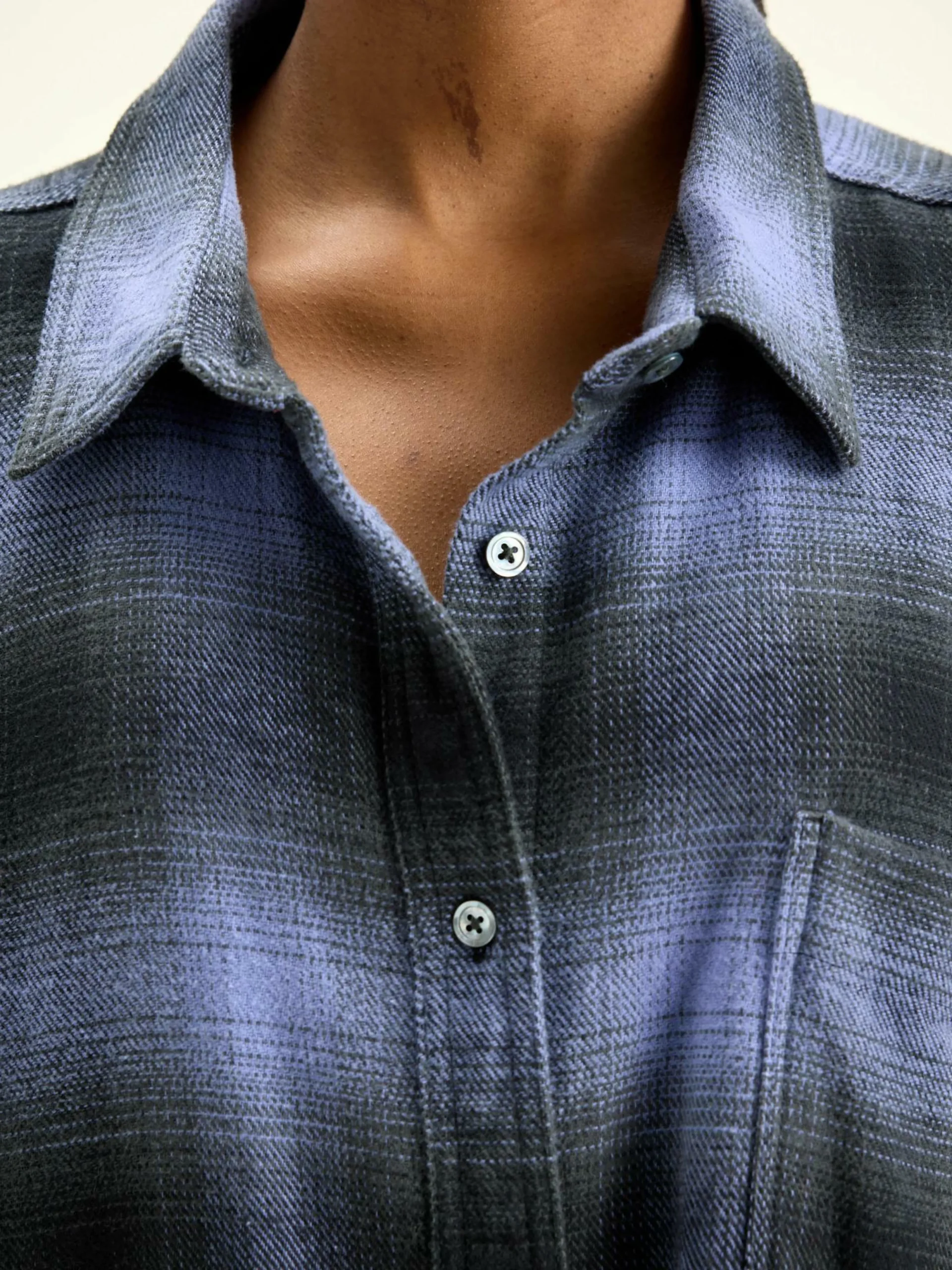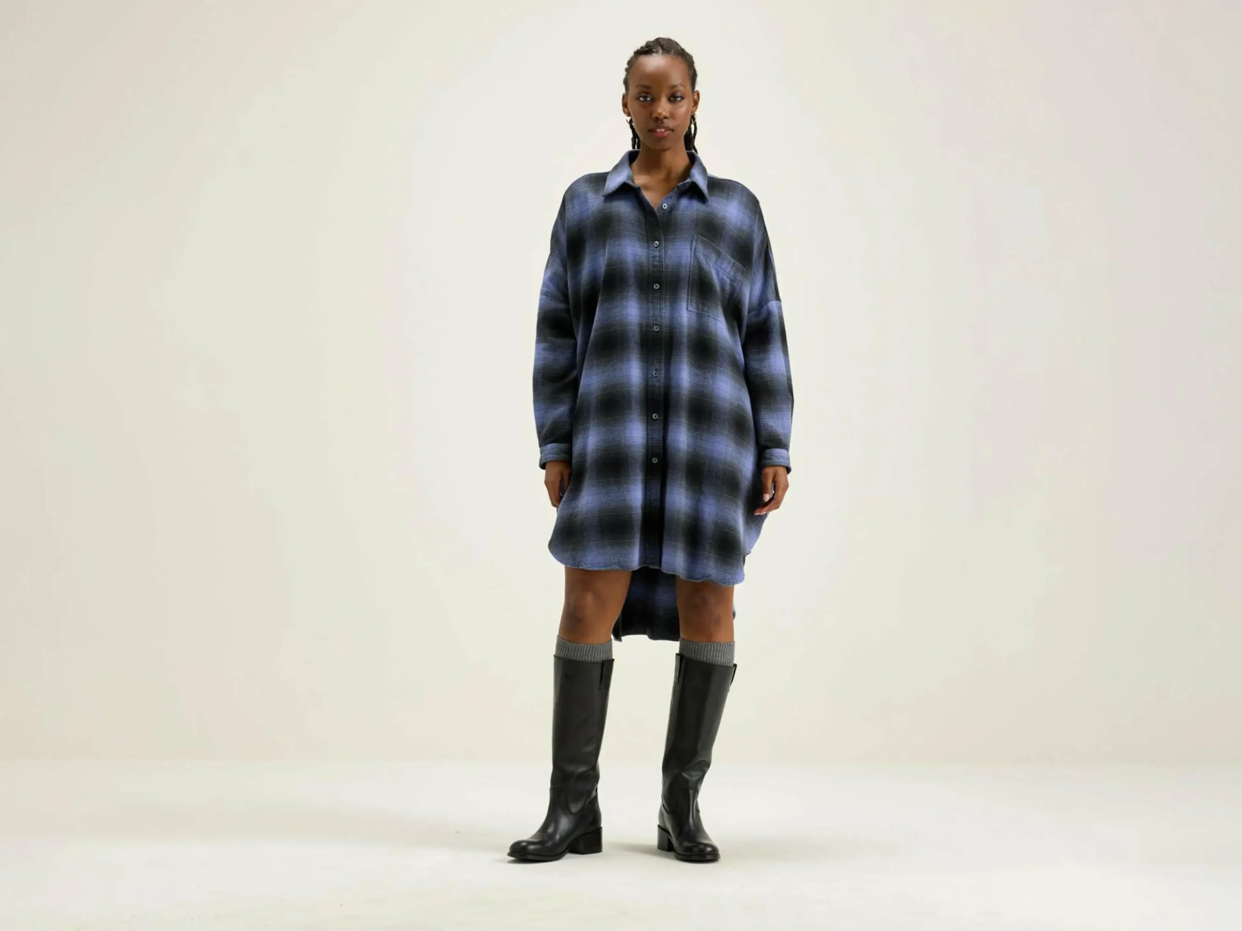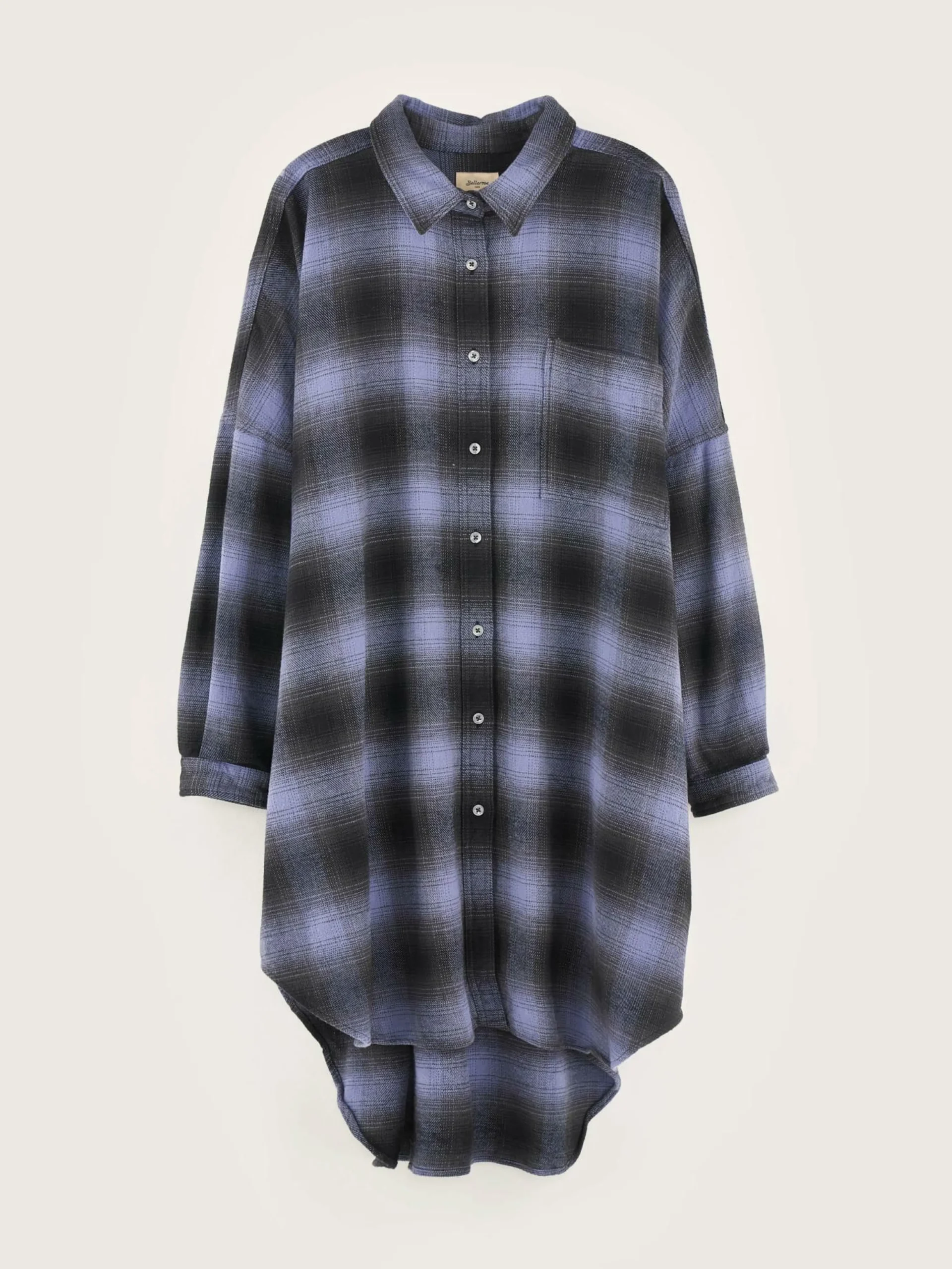 Robe chemise à manches longues, coupe oversize fabriquée en coton brossé à carreaux violets en ton sur ton.
