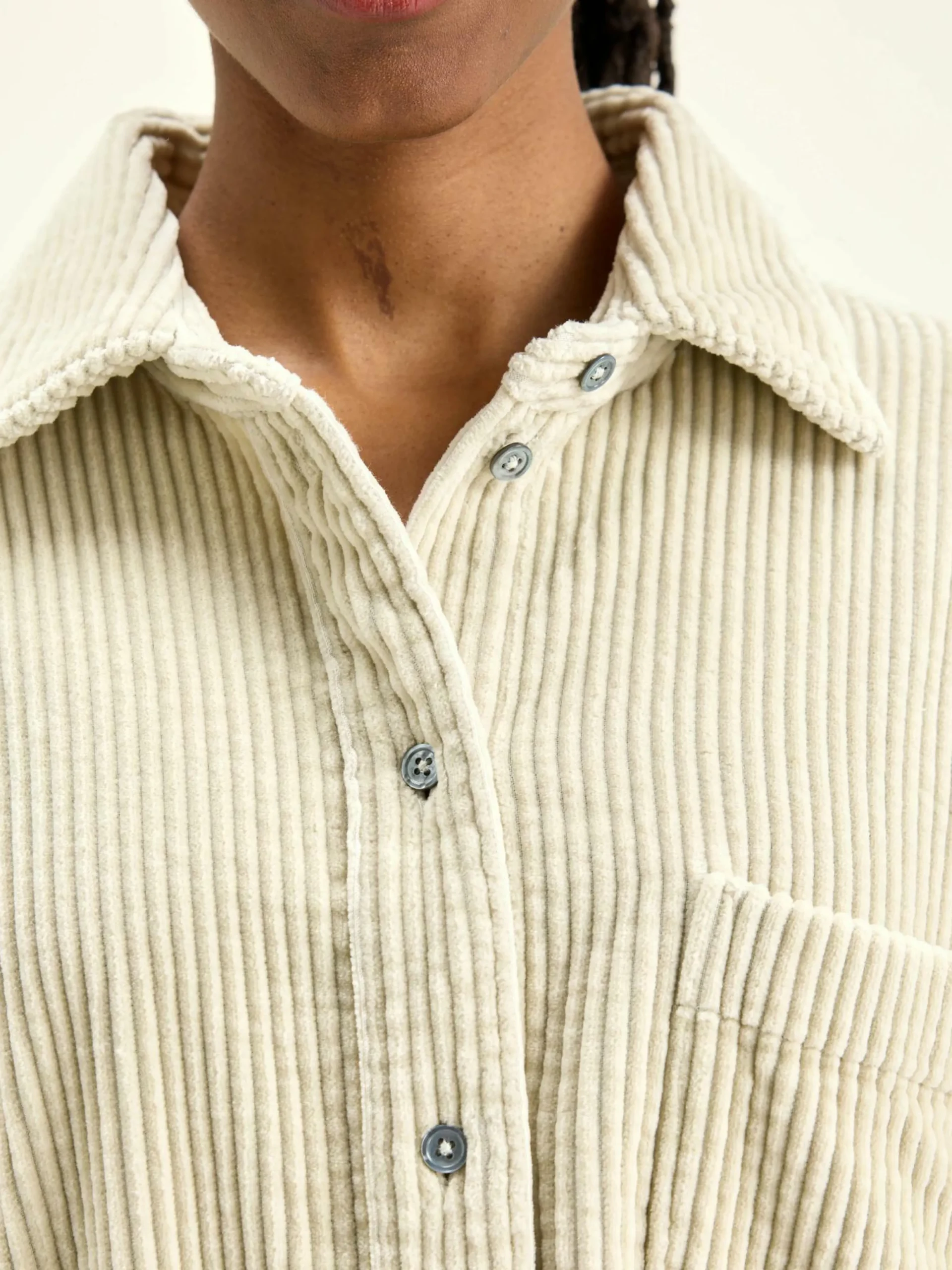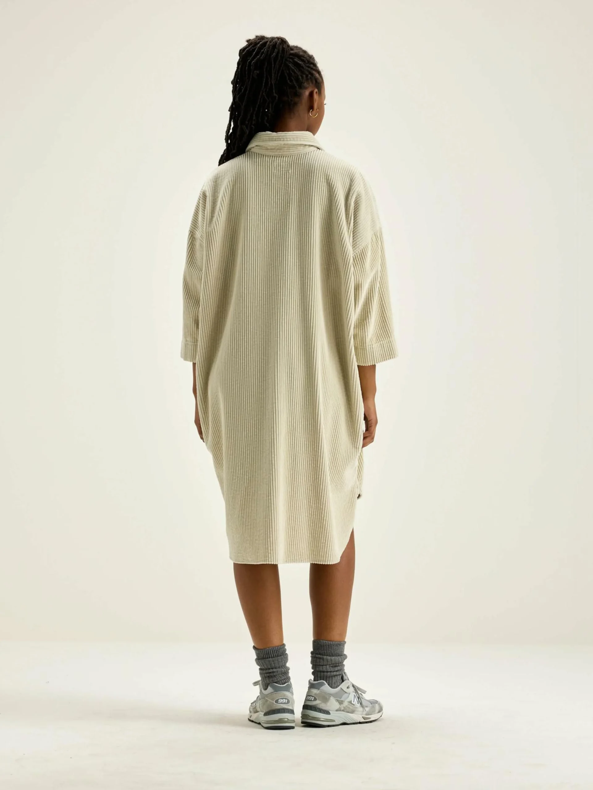 Robe-chemise oversize en velours de coton écru à côtes larges.