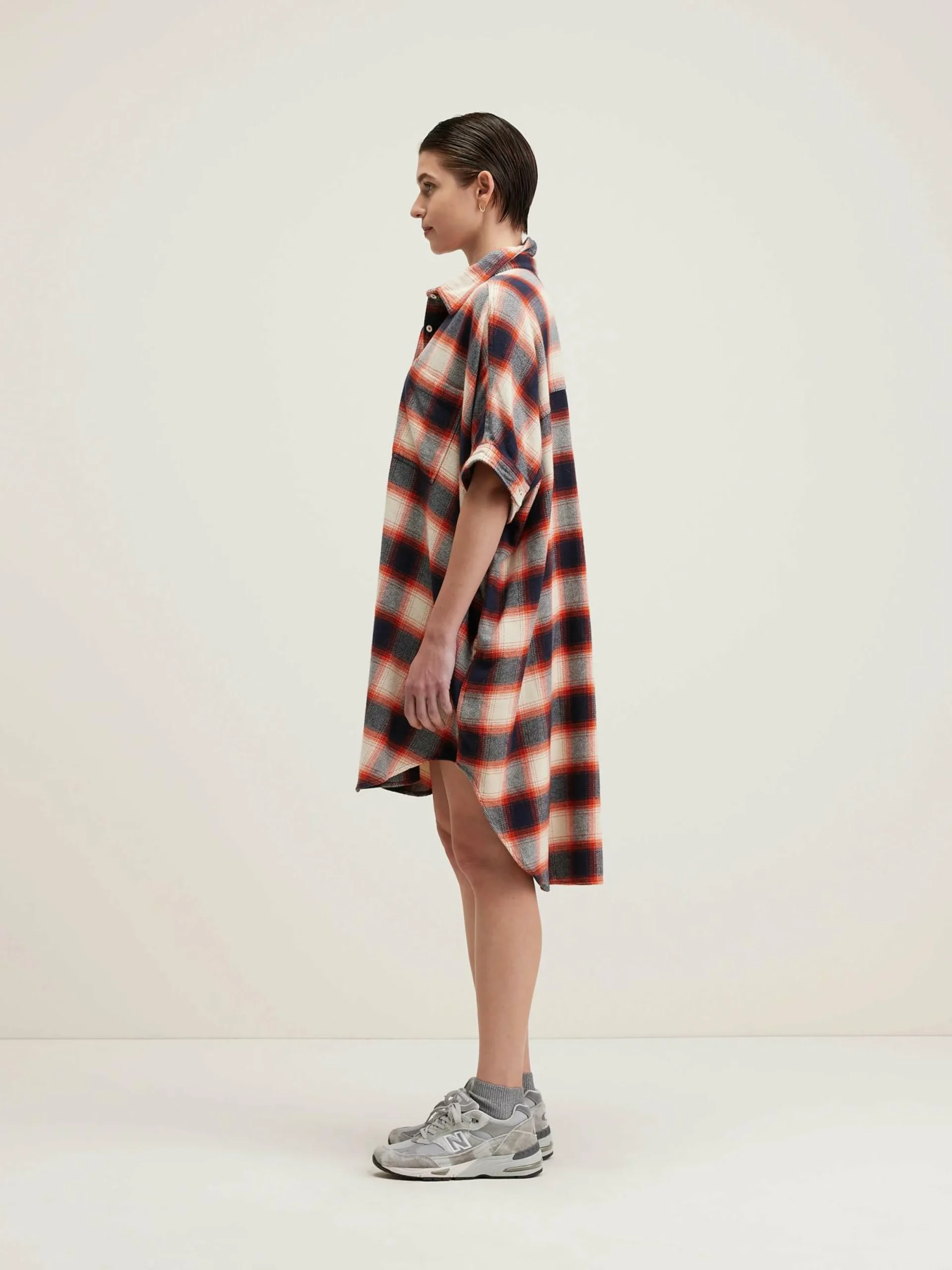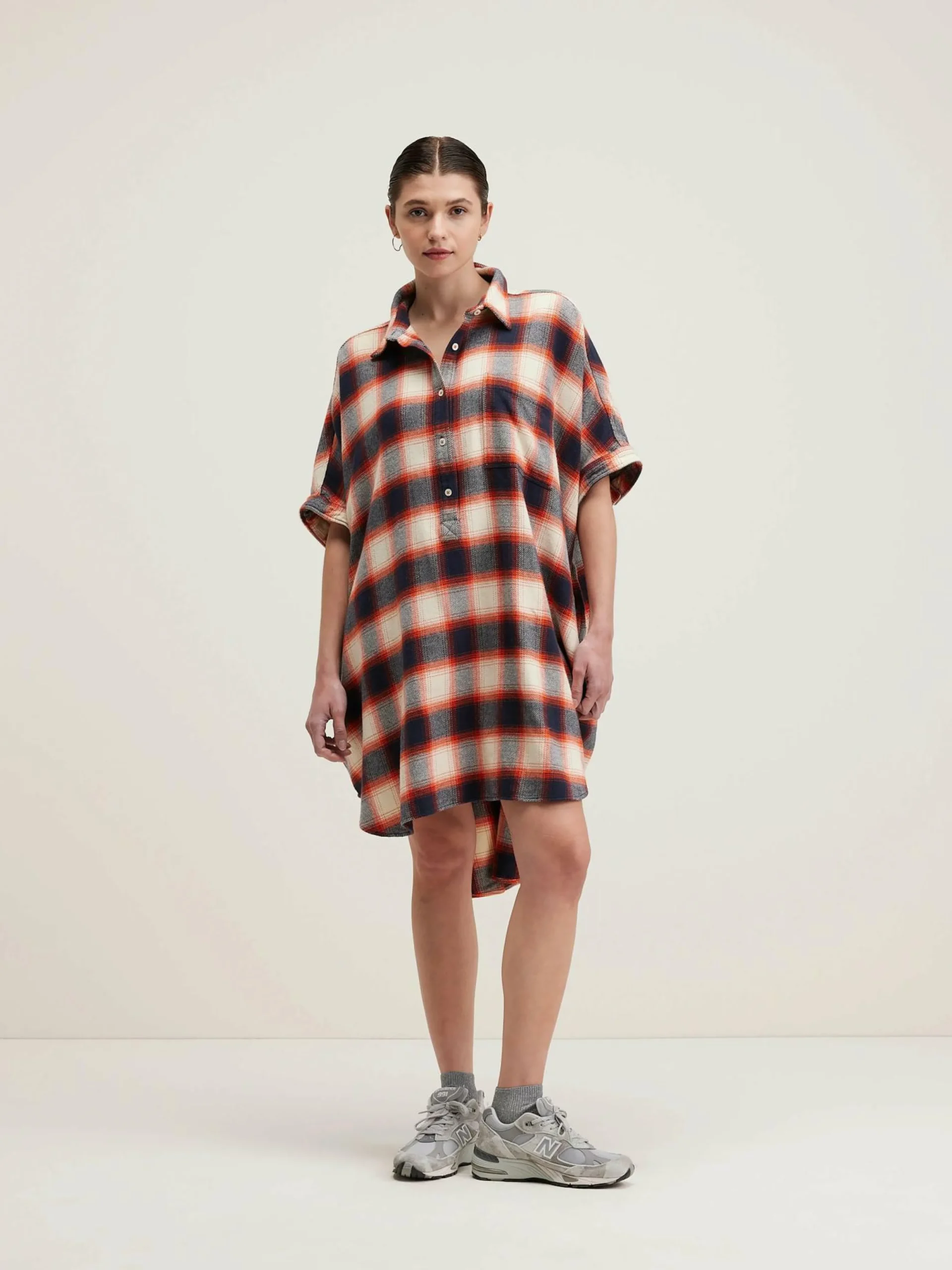 Robe chemise oversize en coton brossé à carreaux bleu marine et rouge.