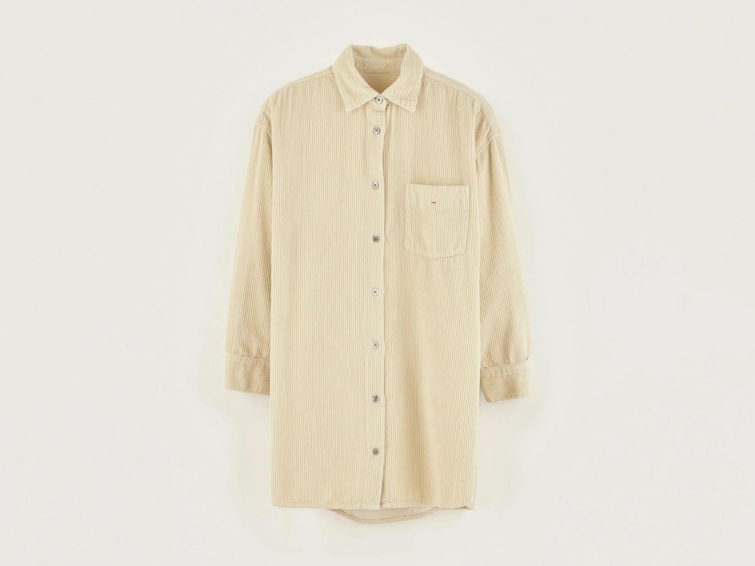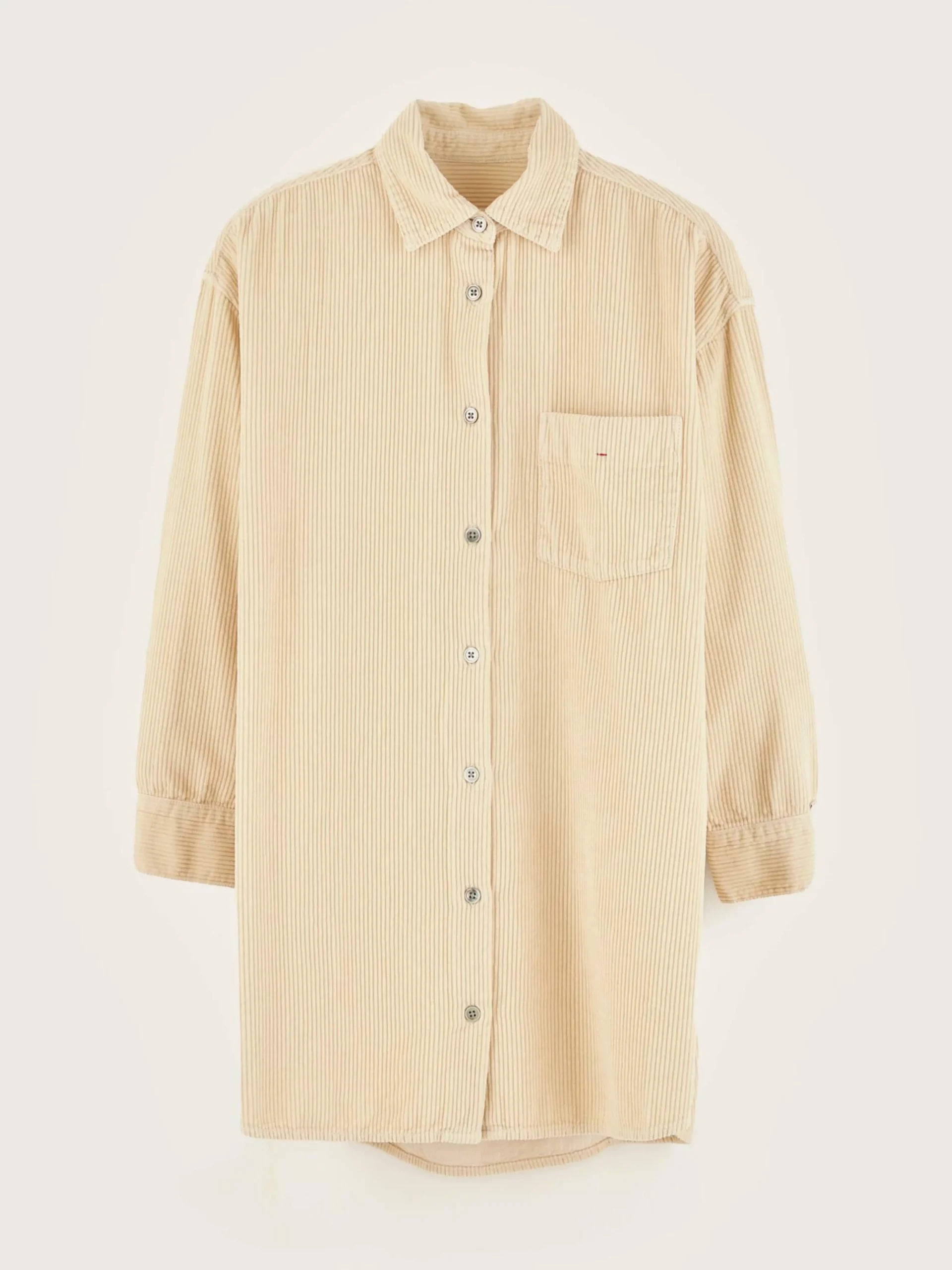 Robe chemise courte en velours de coton côtelé beige, manches longues ajustées et col de chemise.