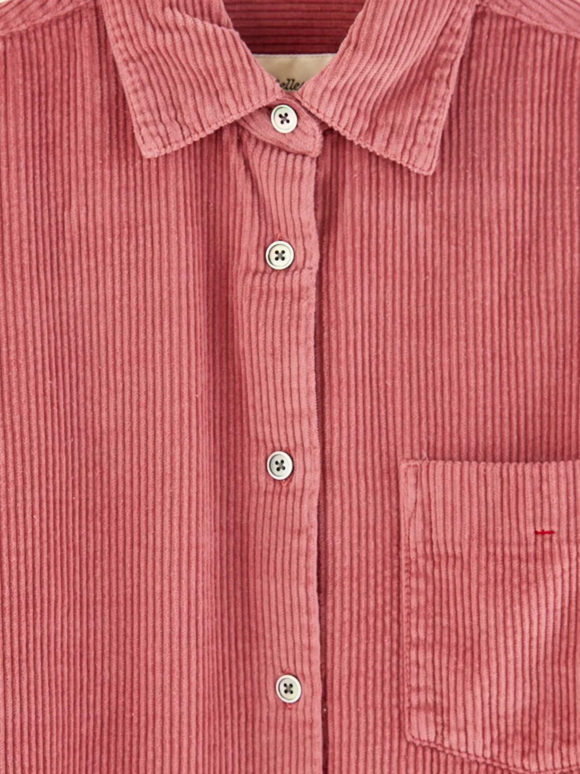 Robe courte, style chemise, en velours de coton côtelé couleur rose framboise, manches longues ajustées et col de chemise.