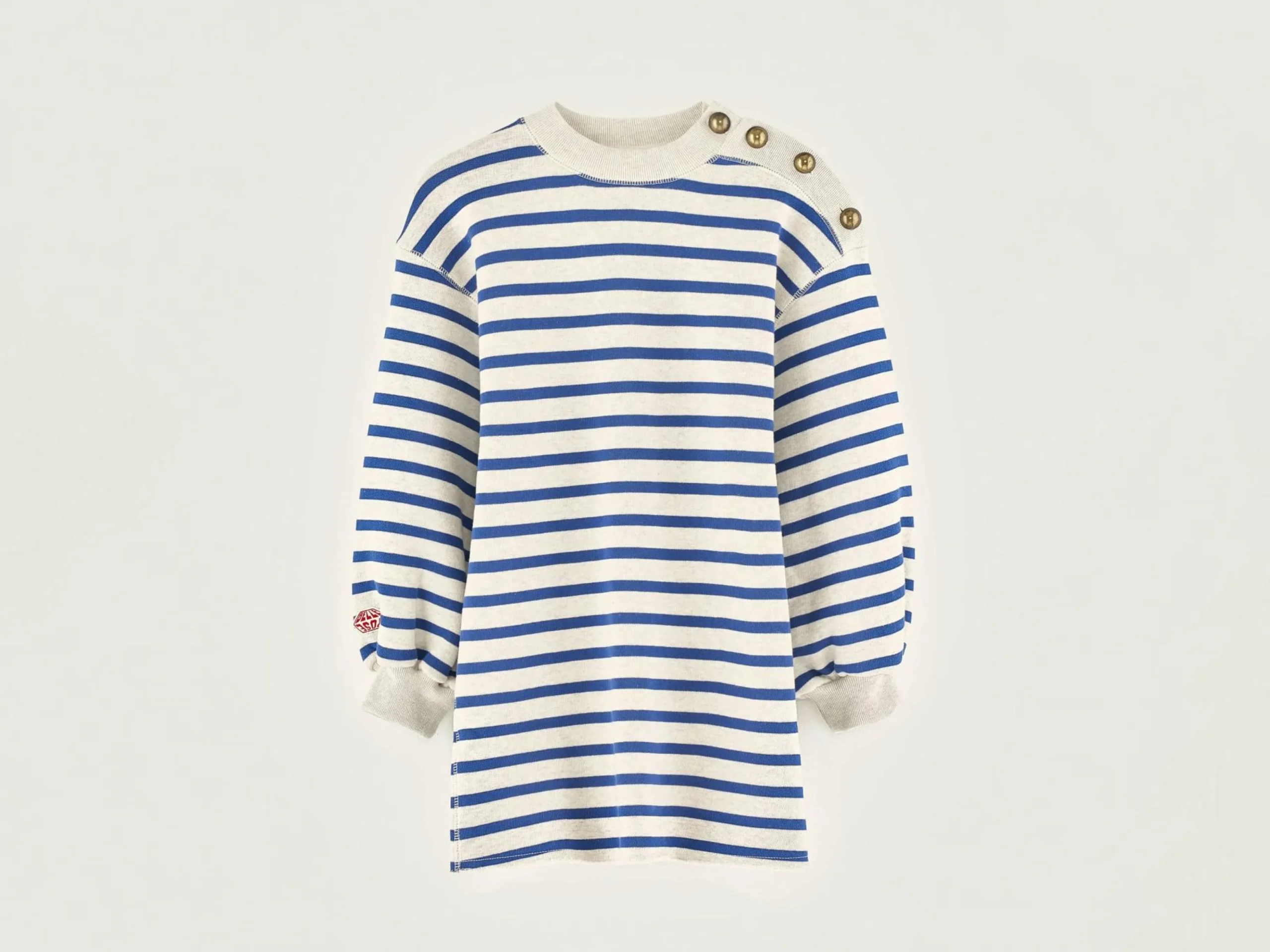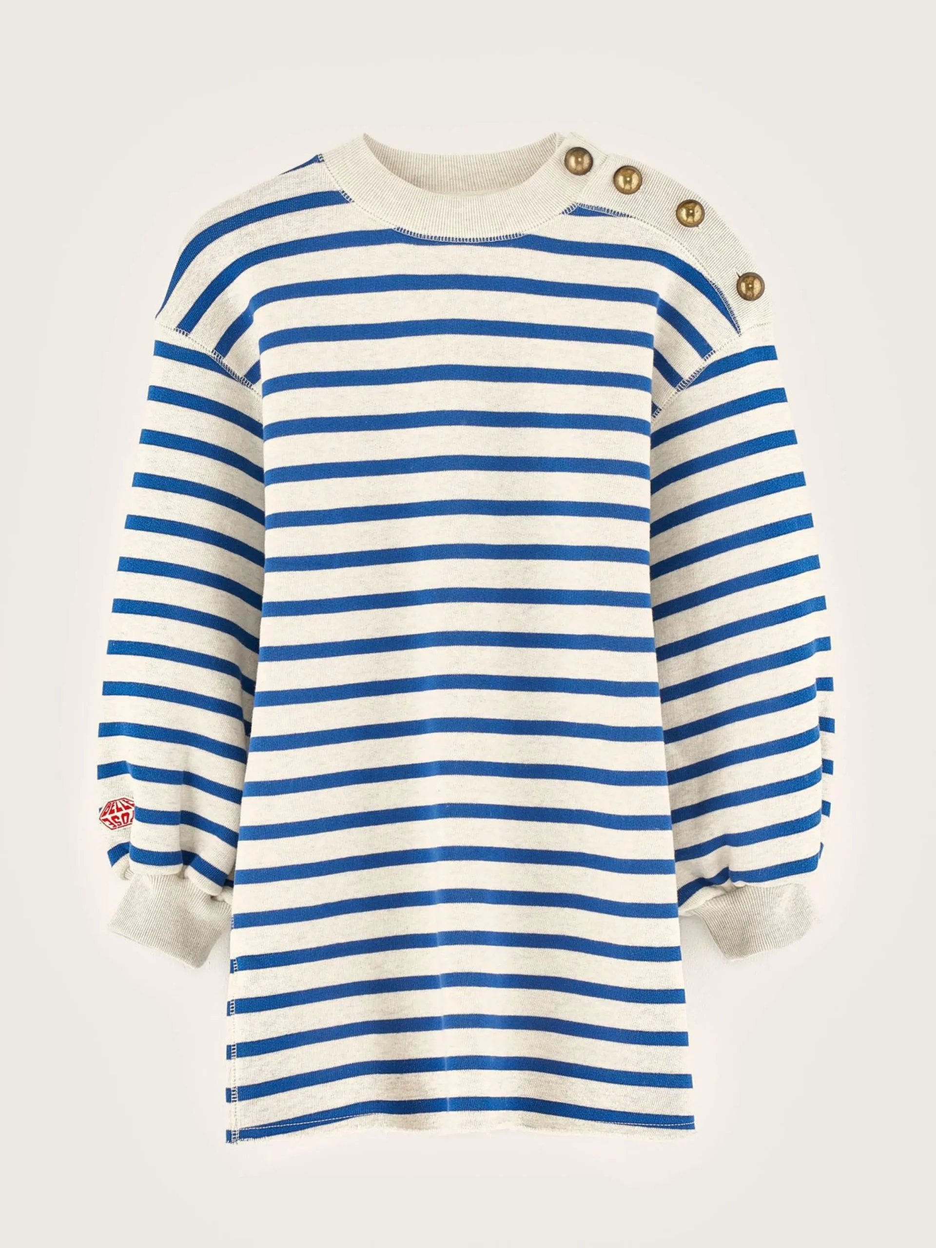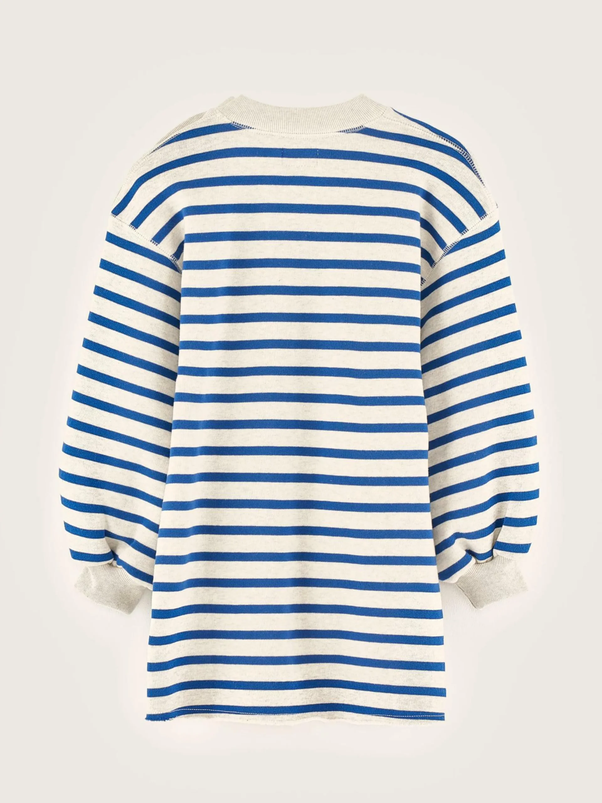 Robe sweat en jersey à rayures nautiques, col rond et manches ballon aux poignets ajustés.