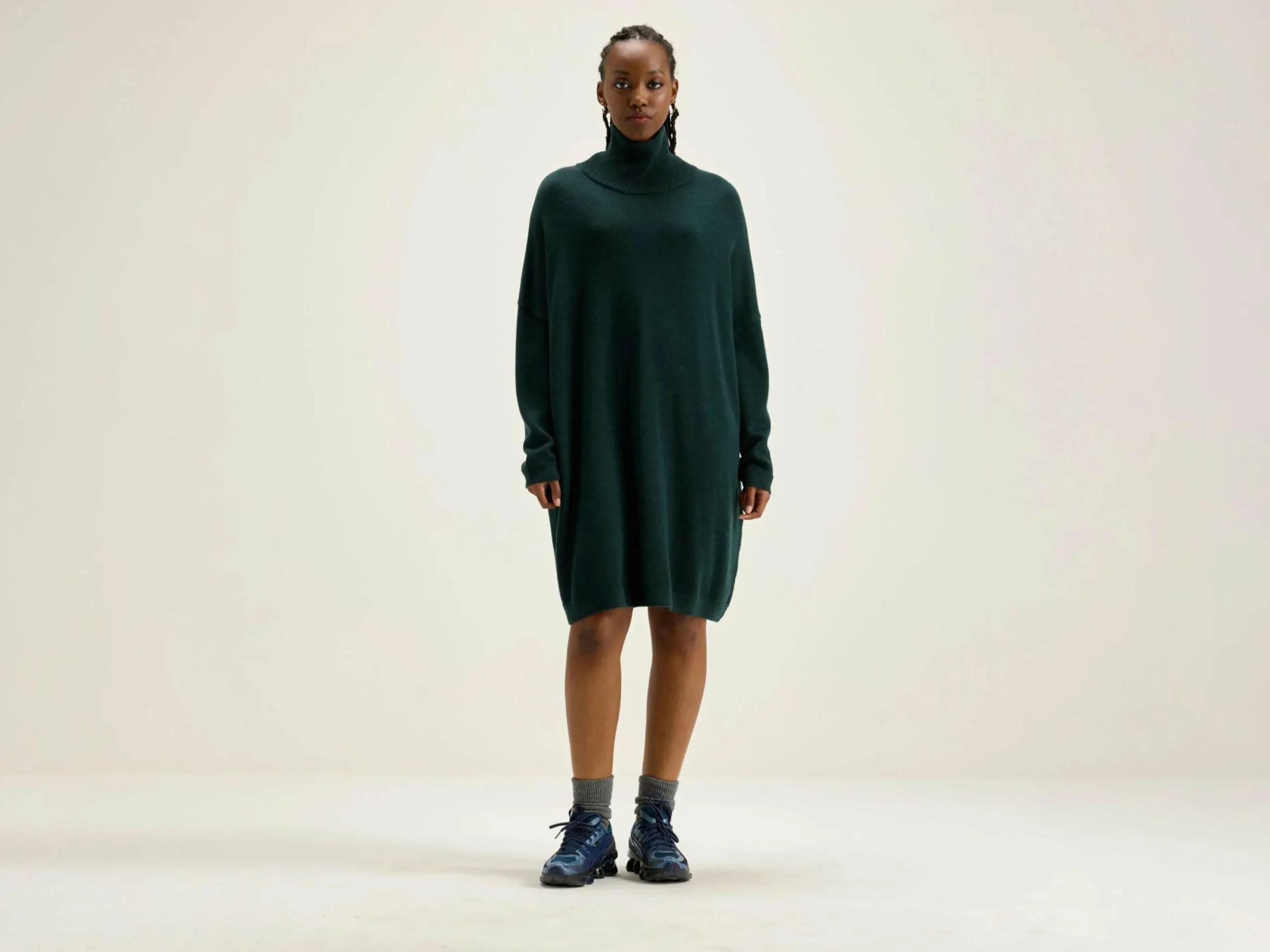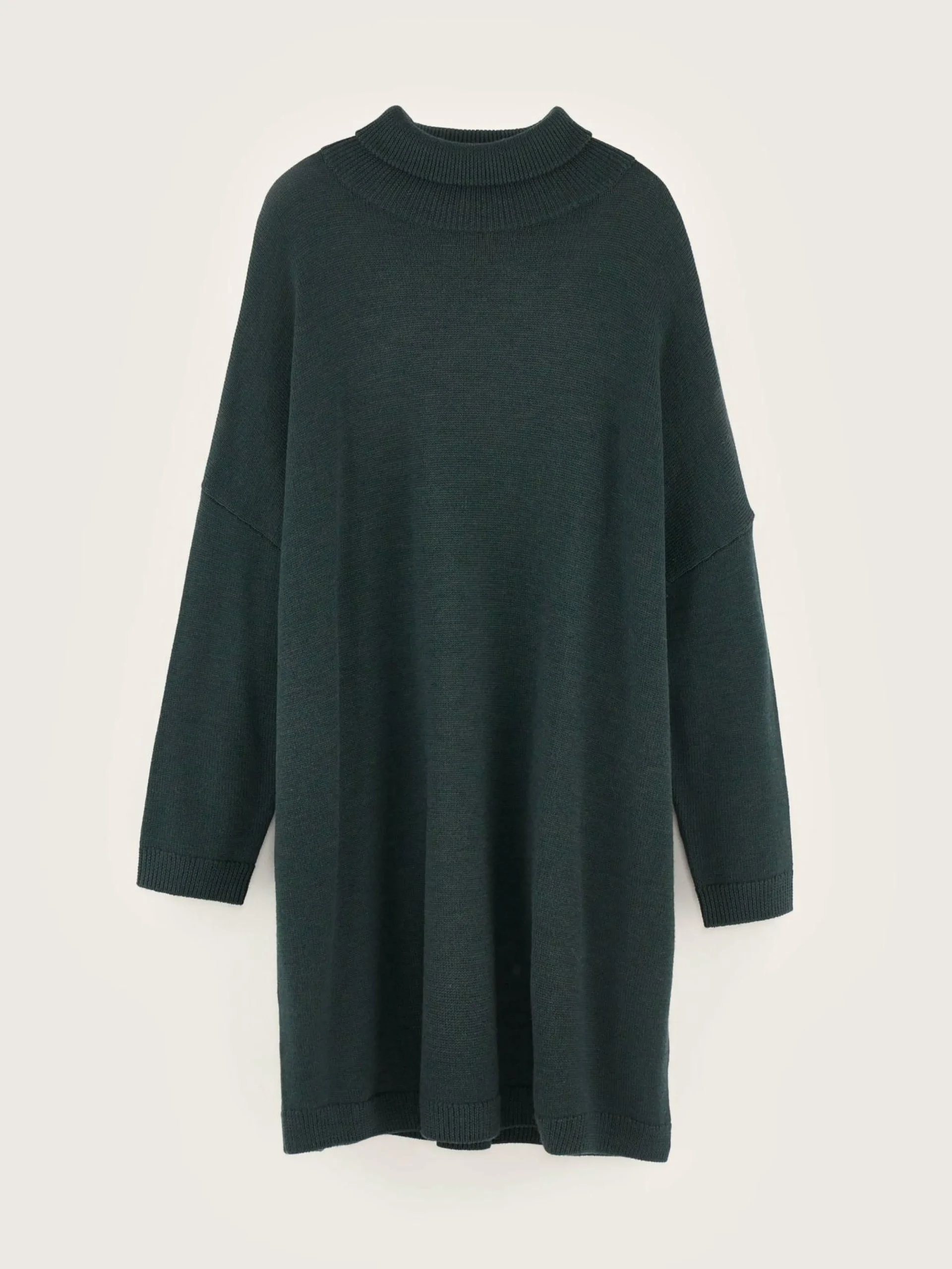 Robe pull oversize en mérinos extra fin couleur vert bouteille, col roulé en maille côtelée tricoté double.