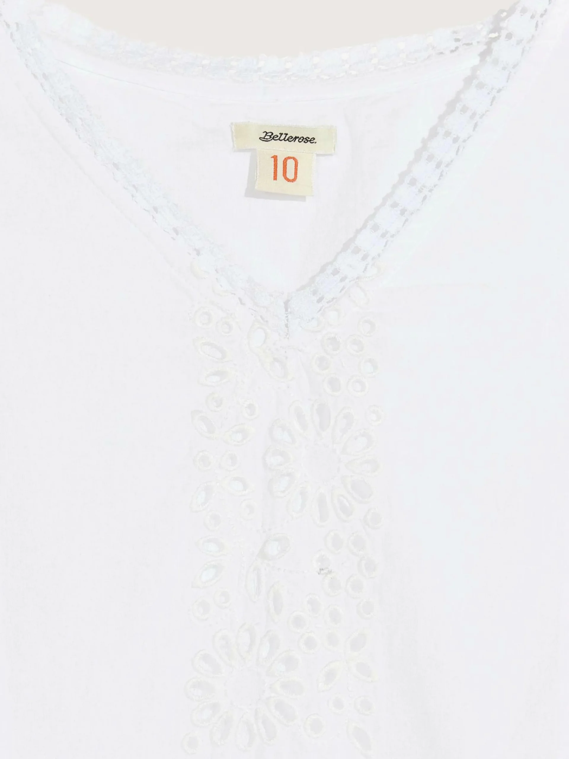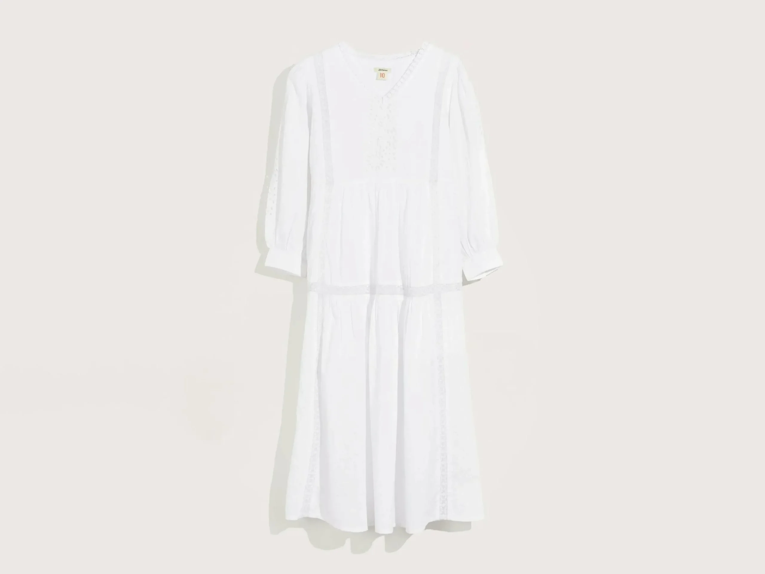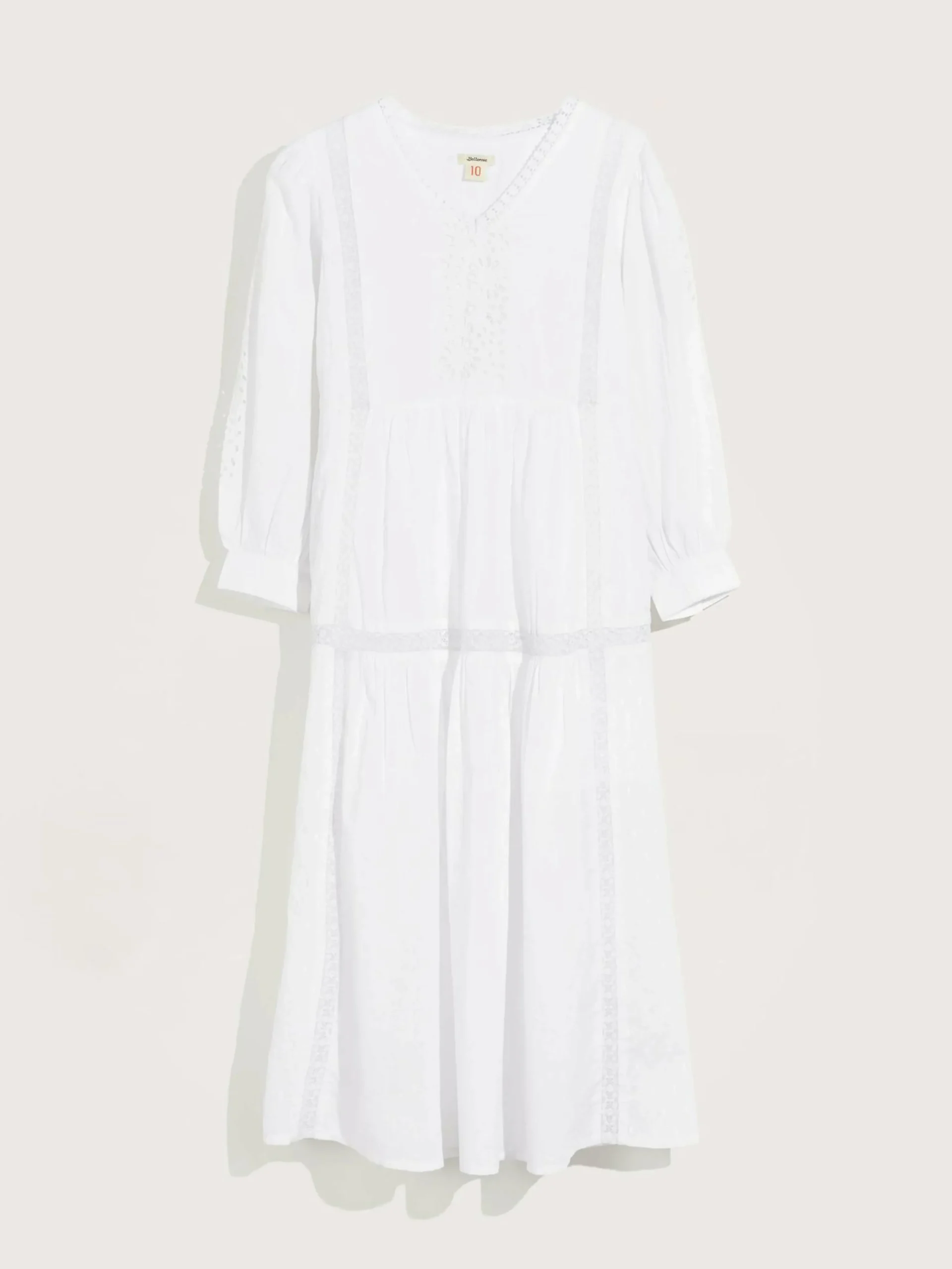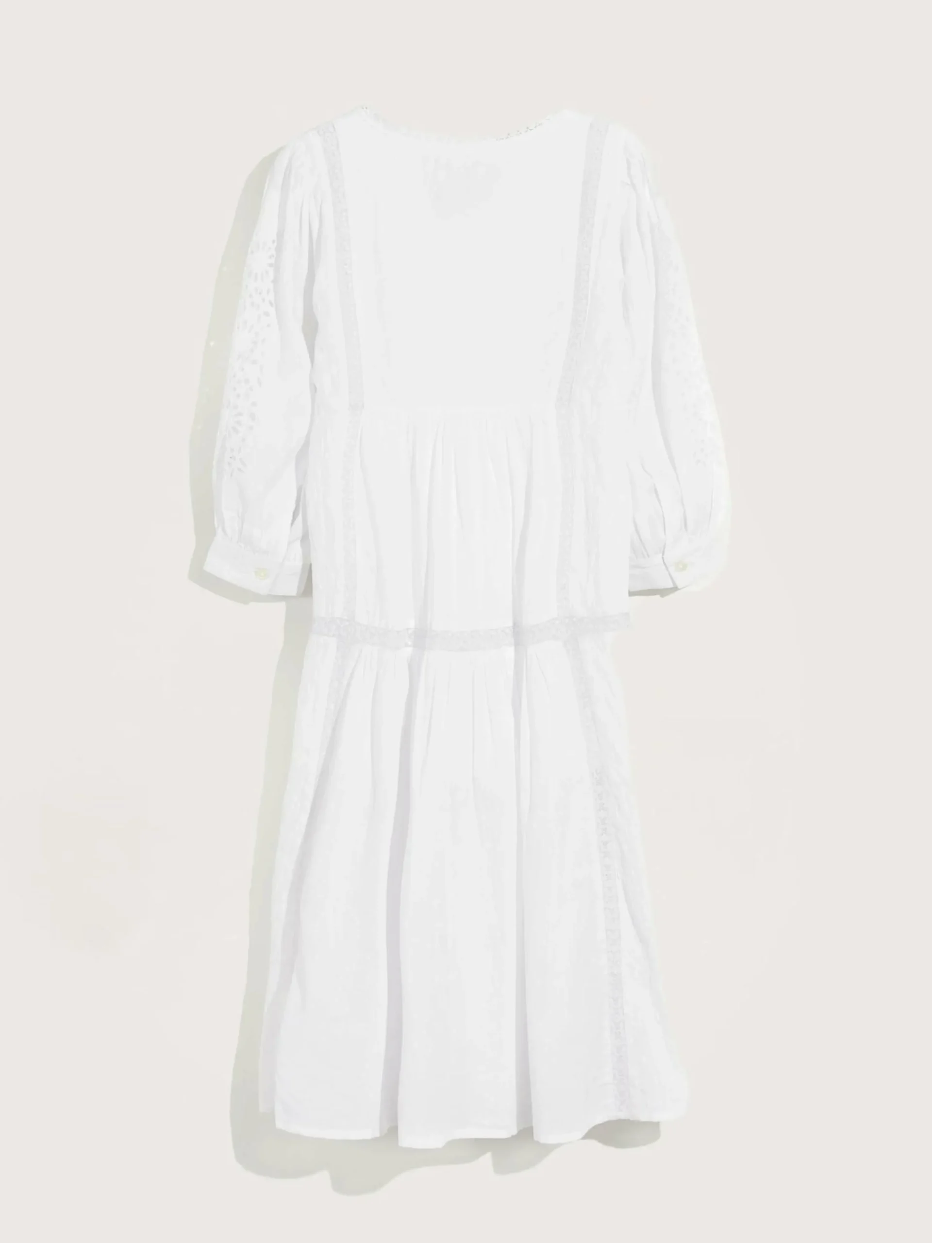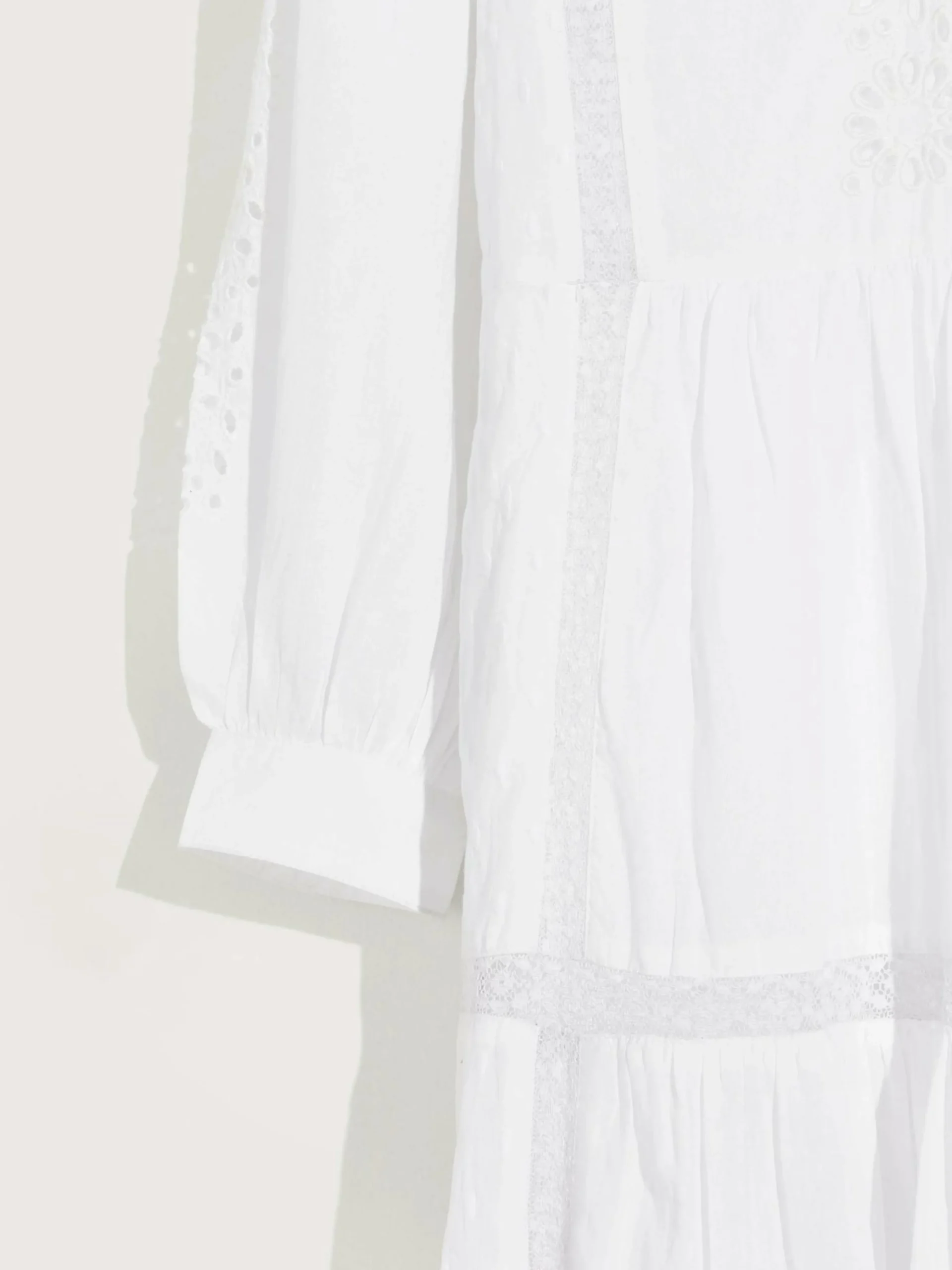Long dress featuring a romantic cut with lace trims and embroideries, made from airy cotton.