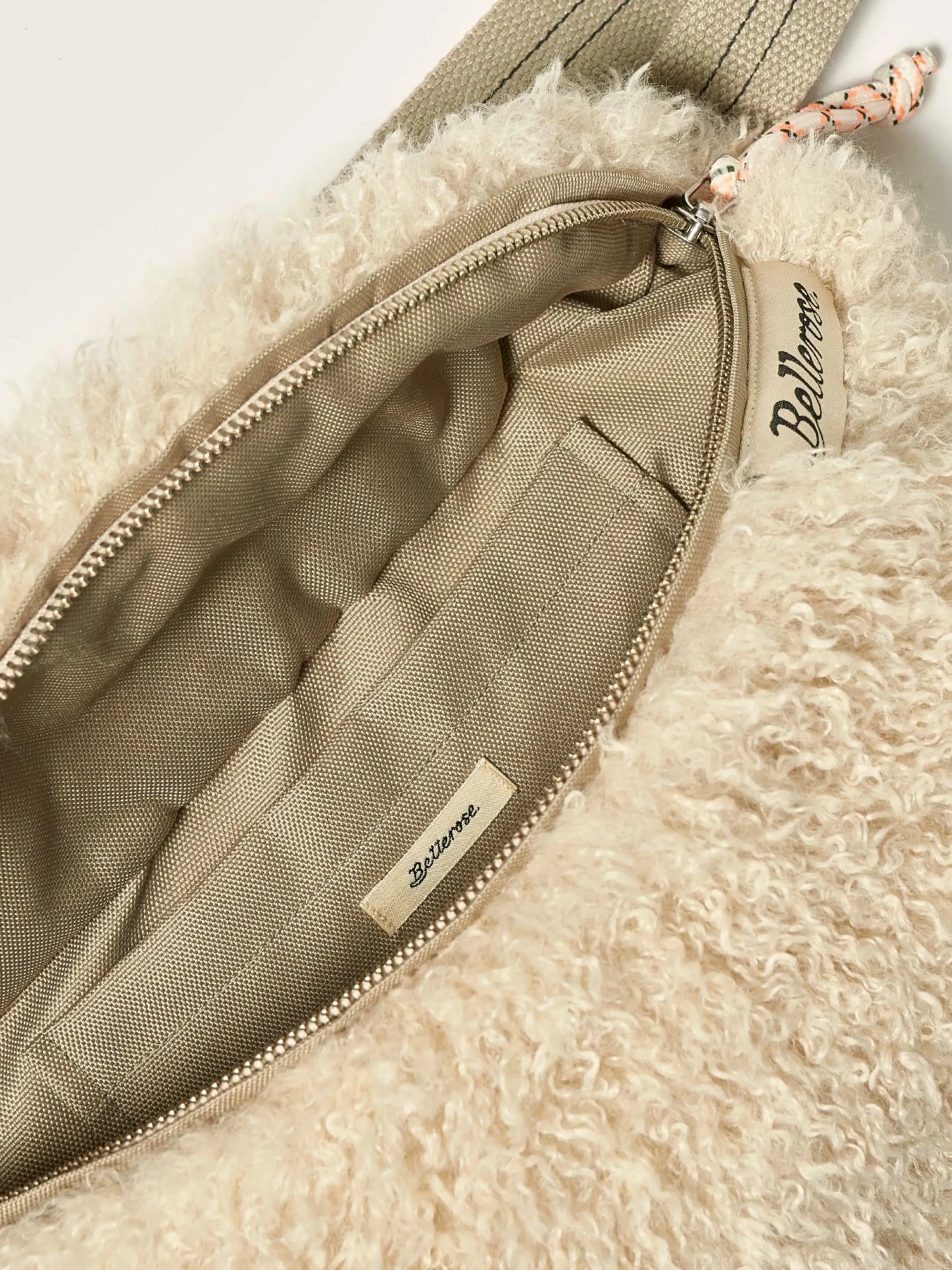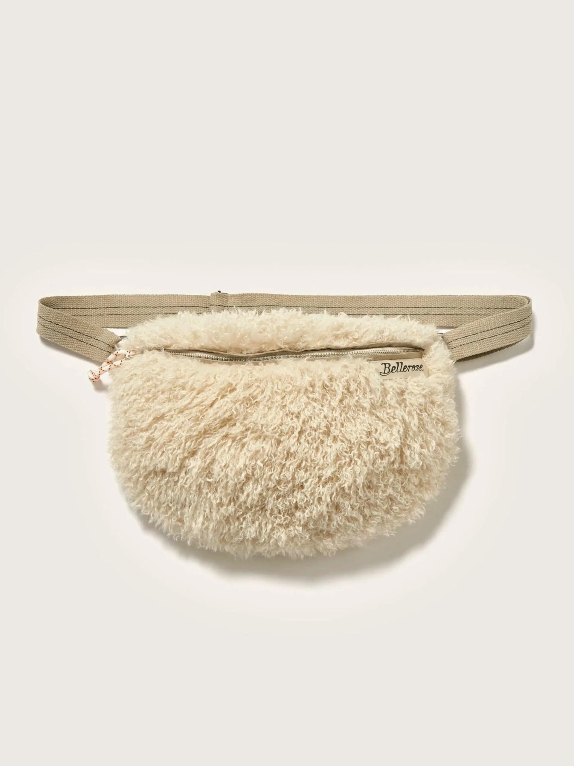 Sac banane zippé en fausse fourrure écrue.