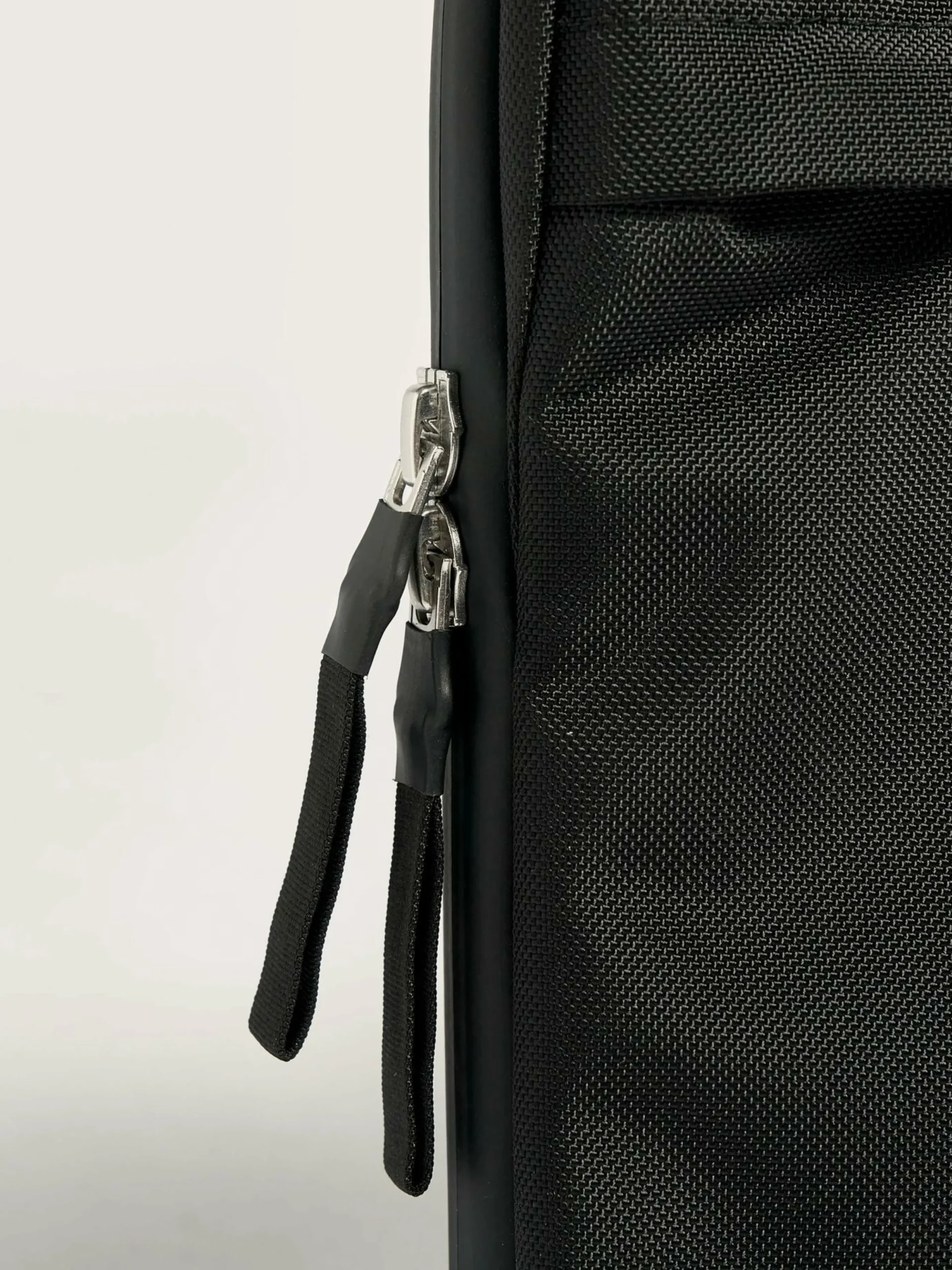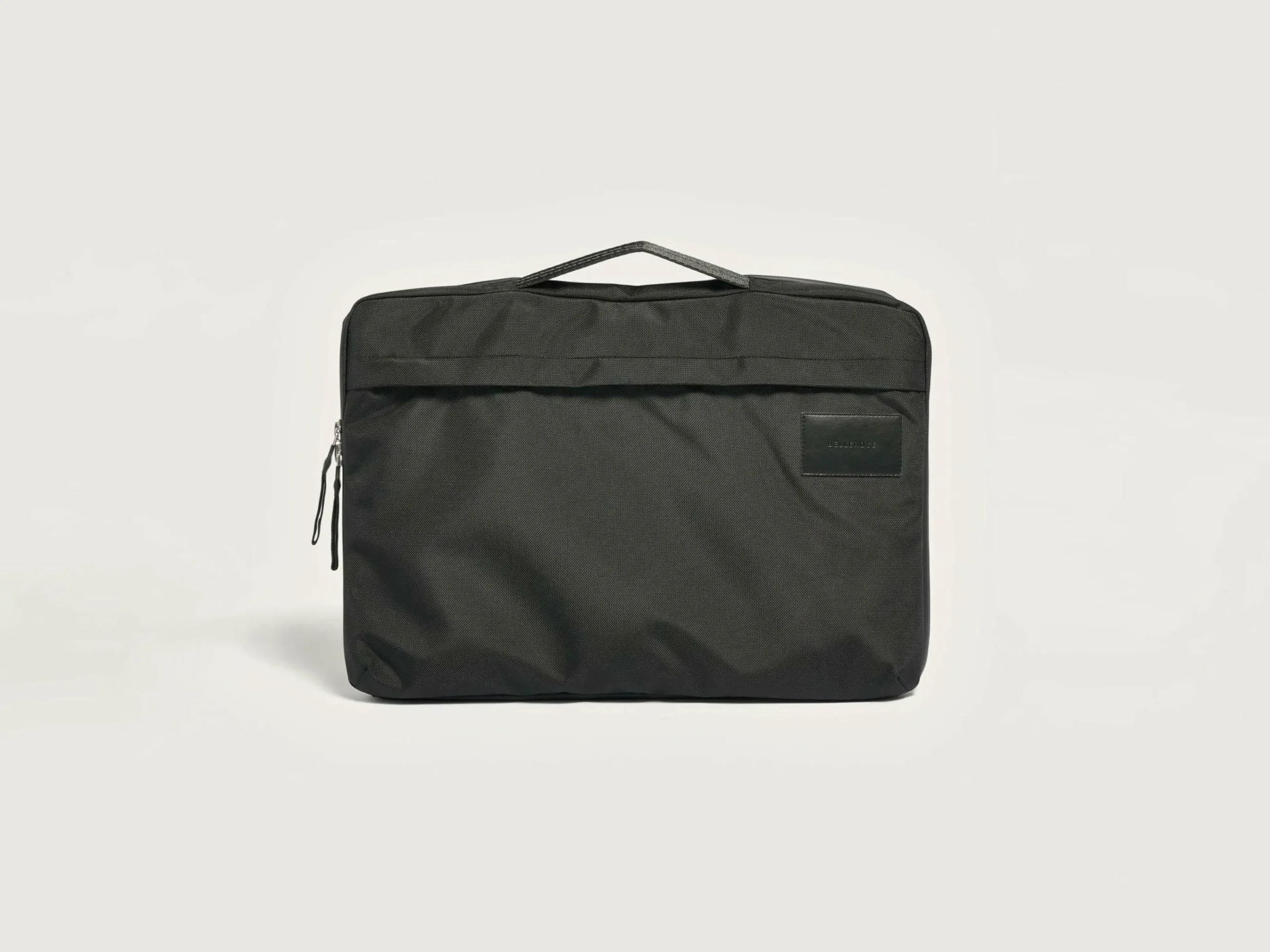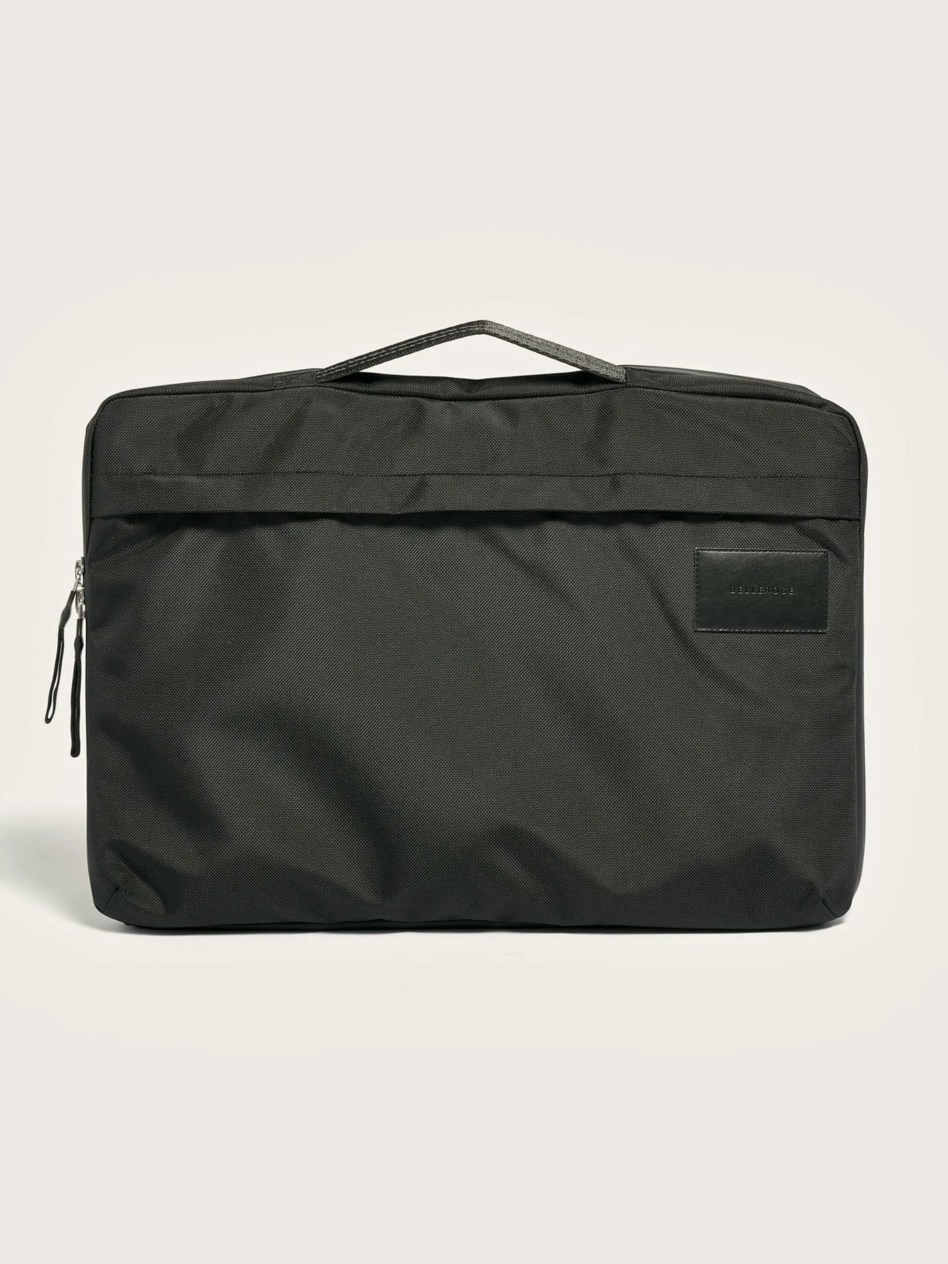 Sacoche pour ordinateur portable en toile enduite noire, fermeture par zip et poche externe pour chargeur.