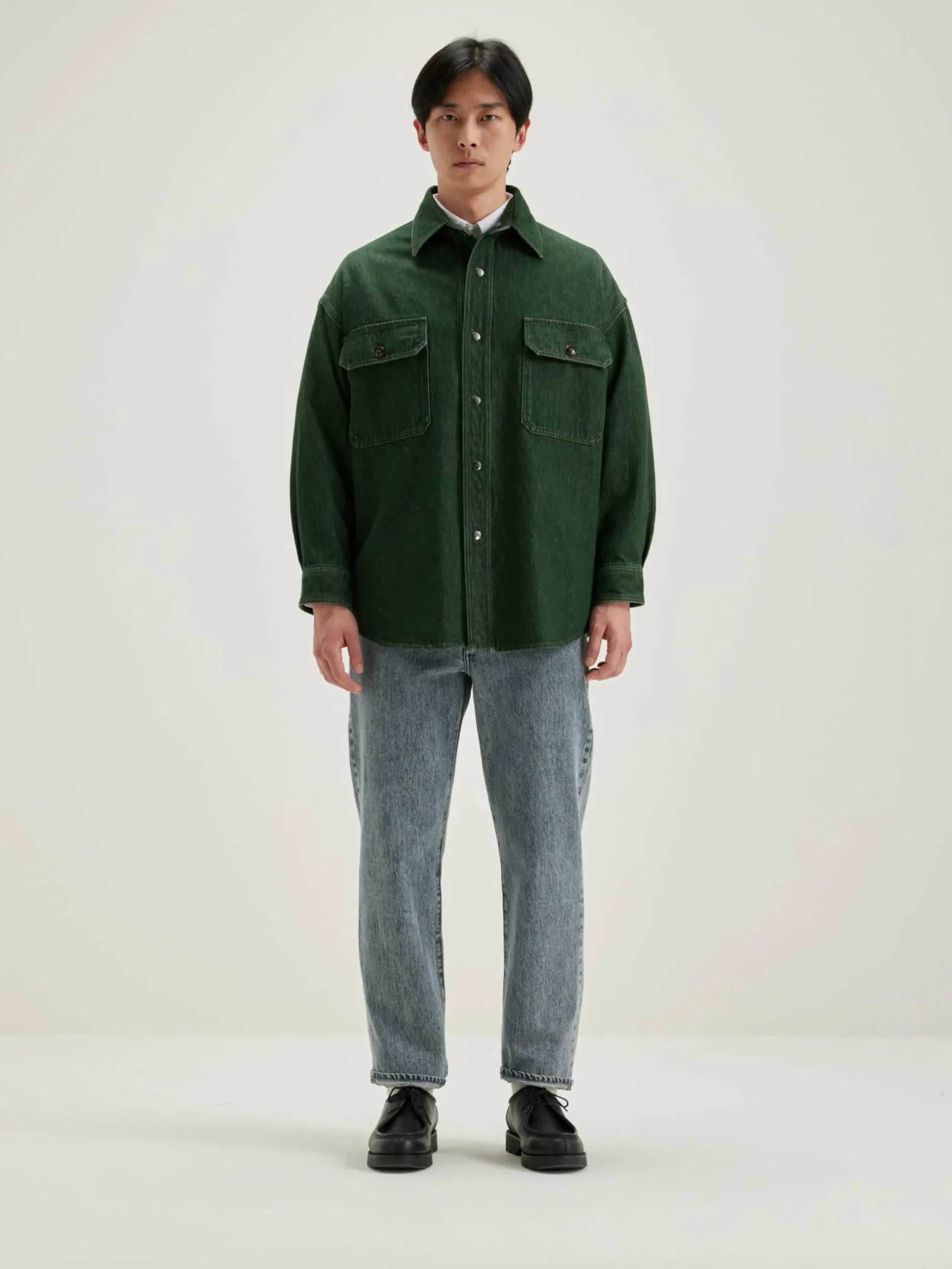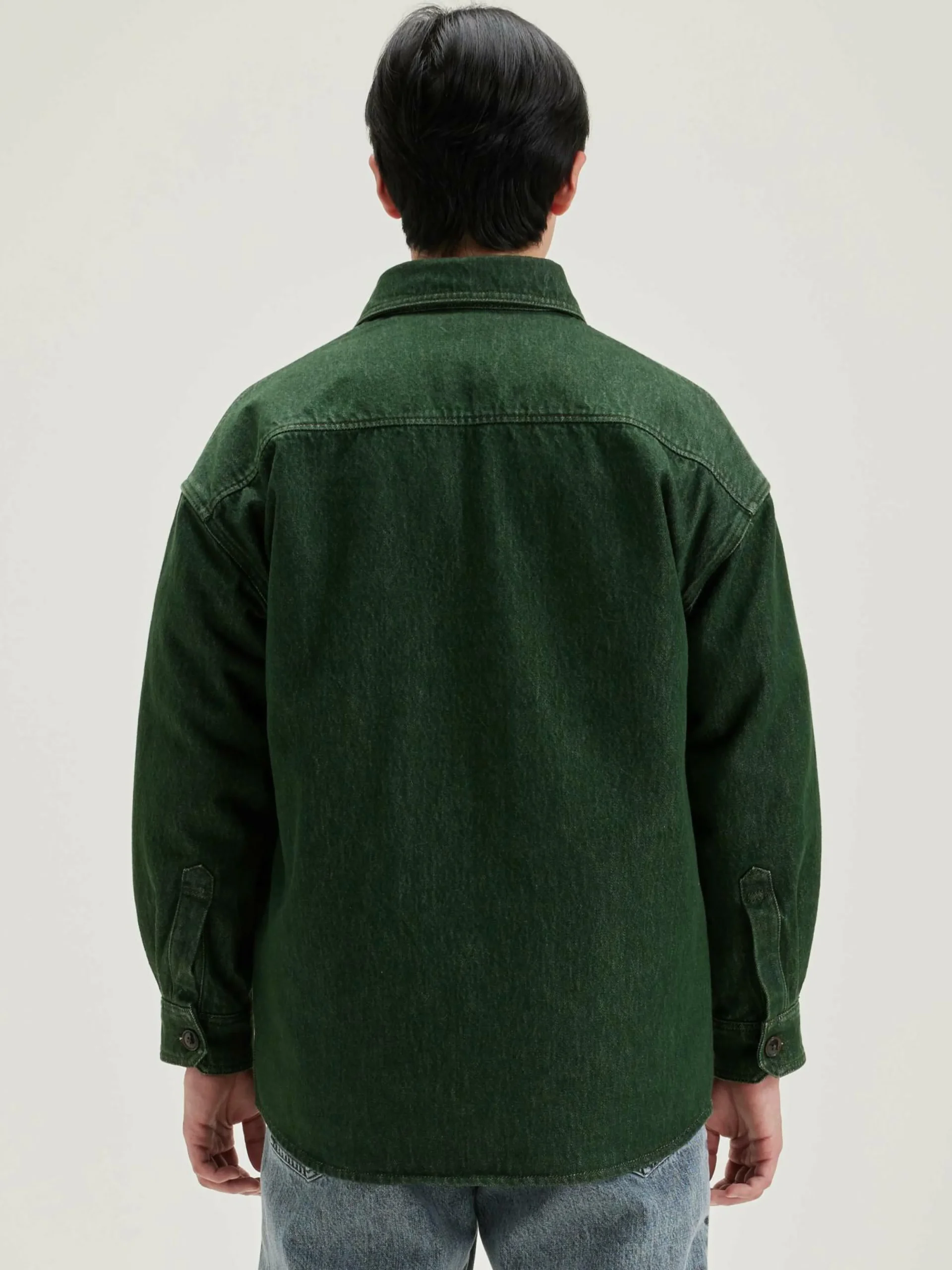 Surchemise en denim de coton vert, coupe oversize et poche plaquée à l’avant.