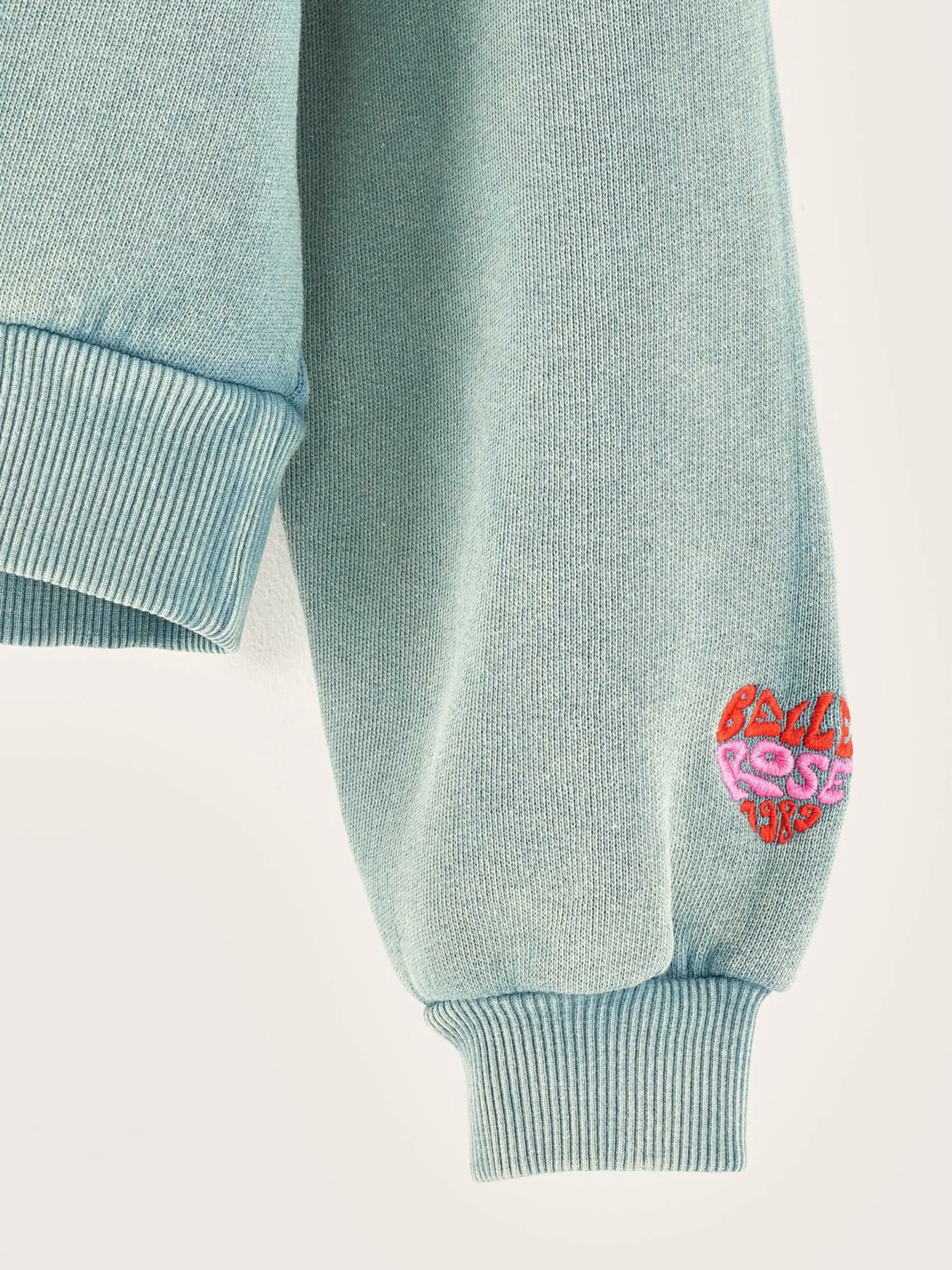 Sweatshirt décontracté à col V, en jersey bleu et imprimé « Unity » sur l’arrière.