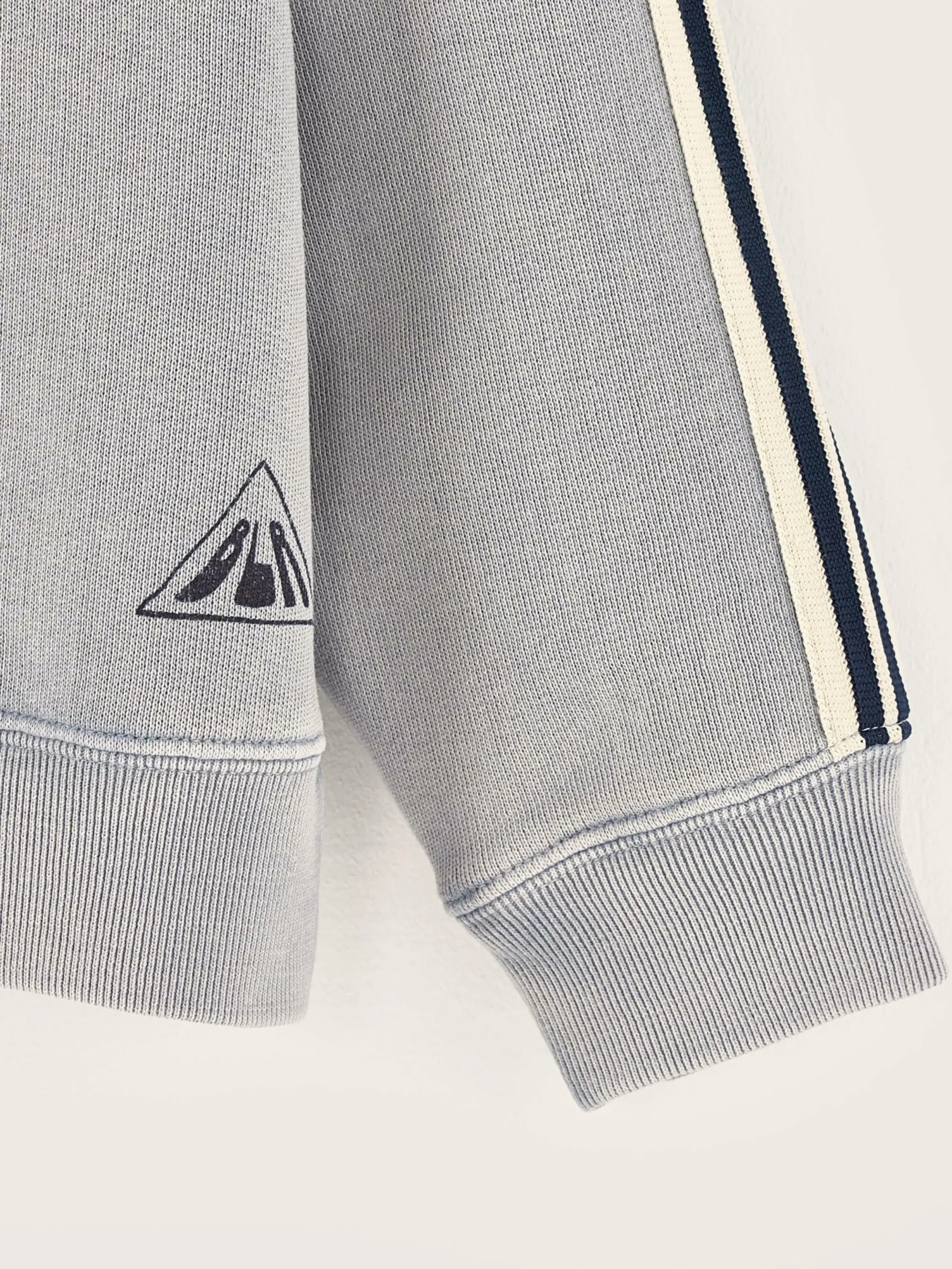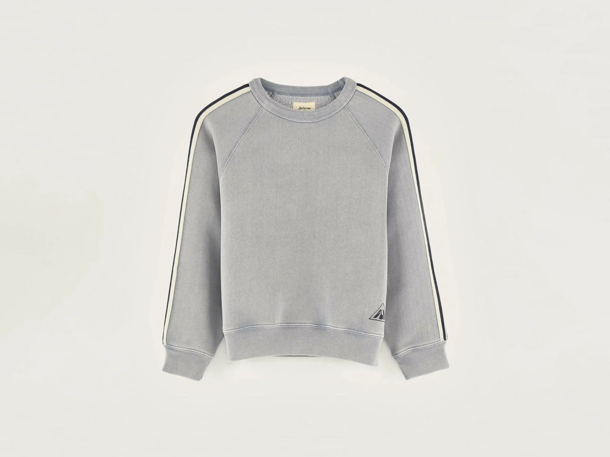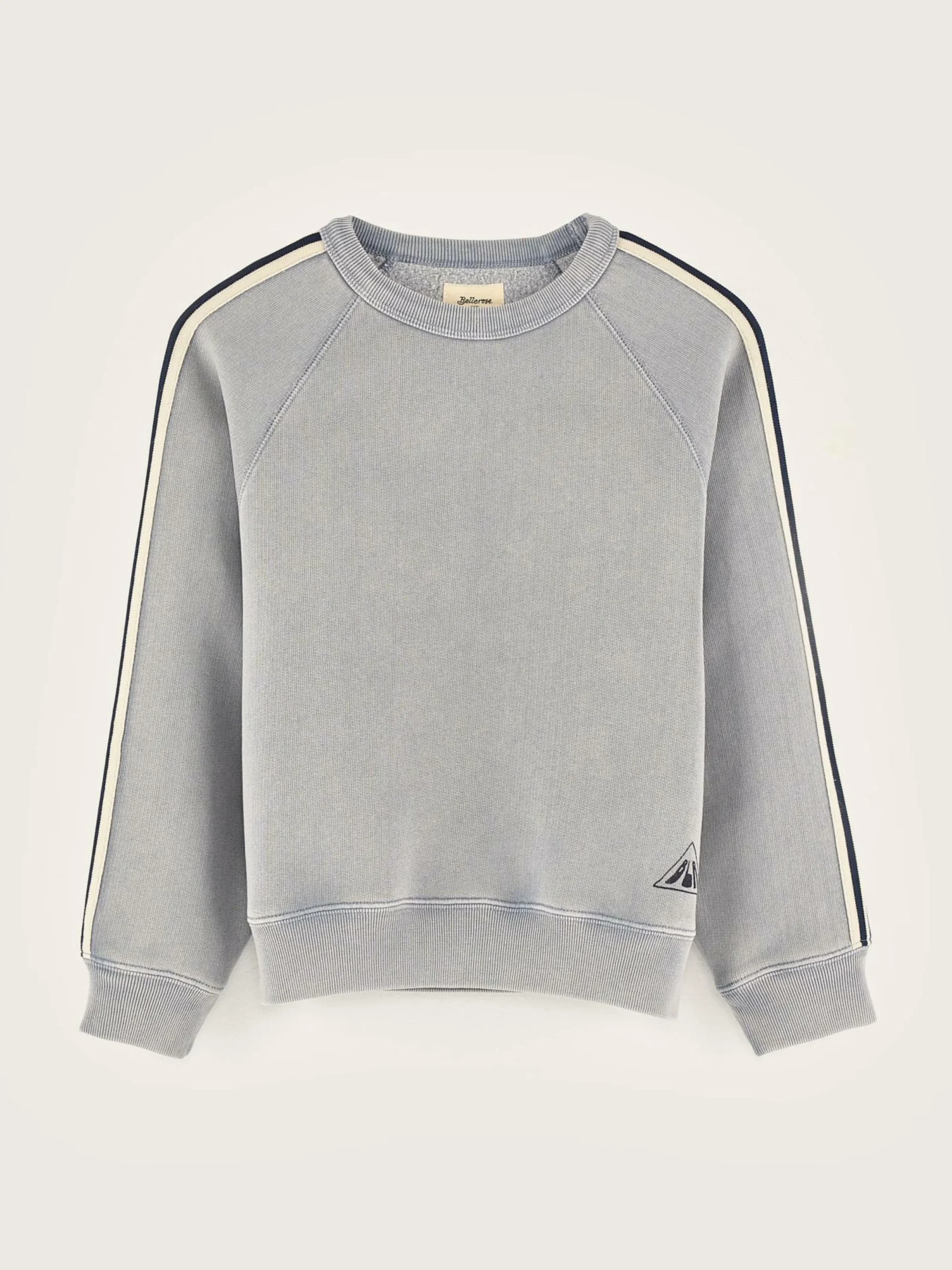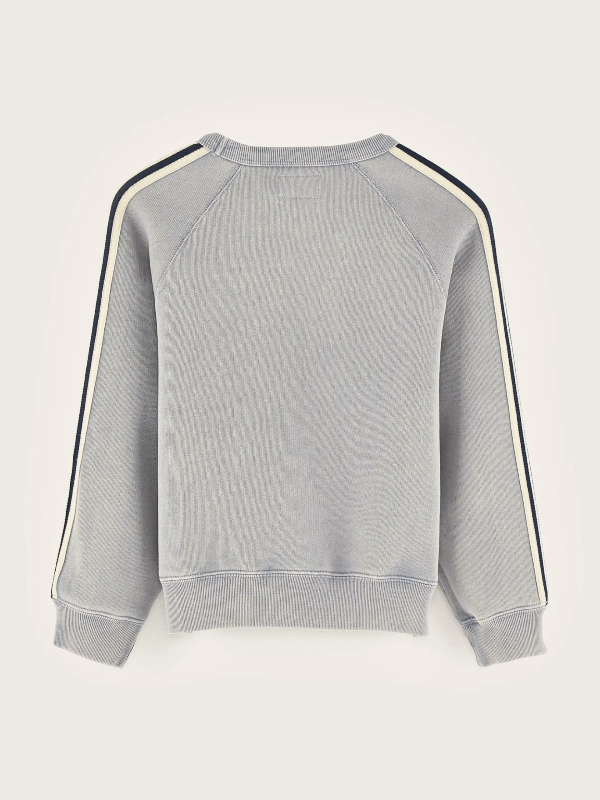 Sweatshirt col rond, coupe classique de couleur bleu clair et rayures contrastes le long des manches.