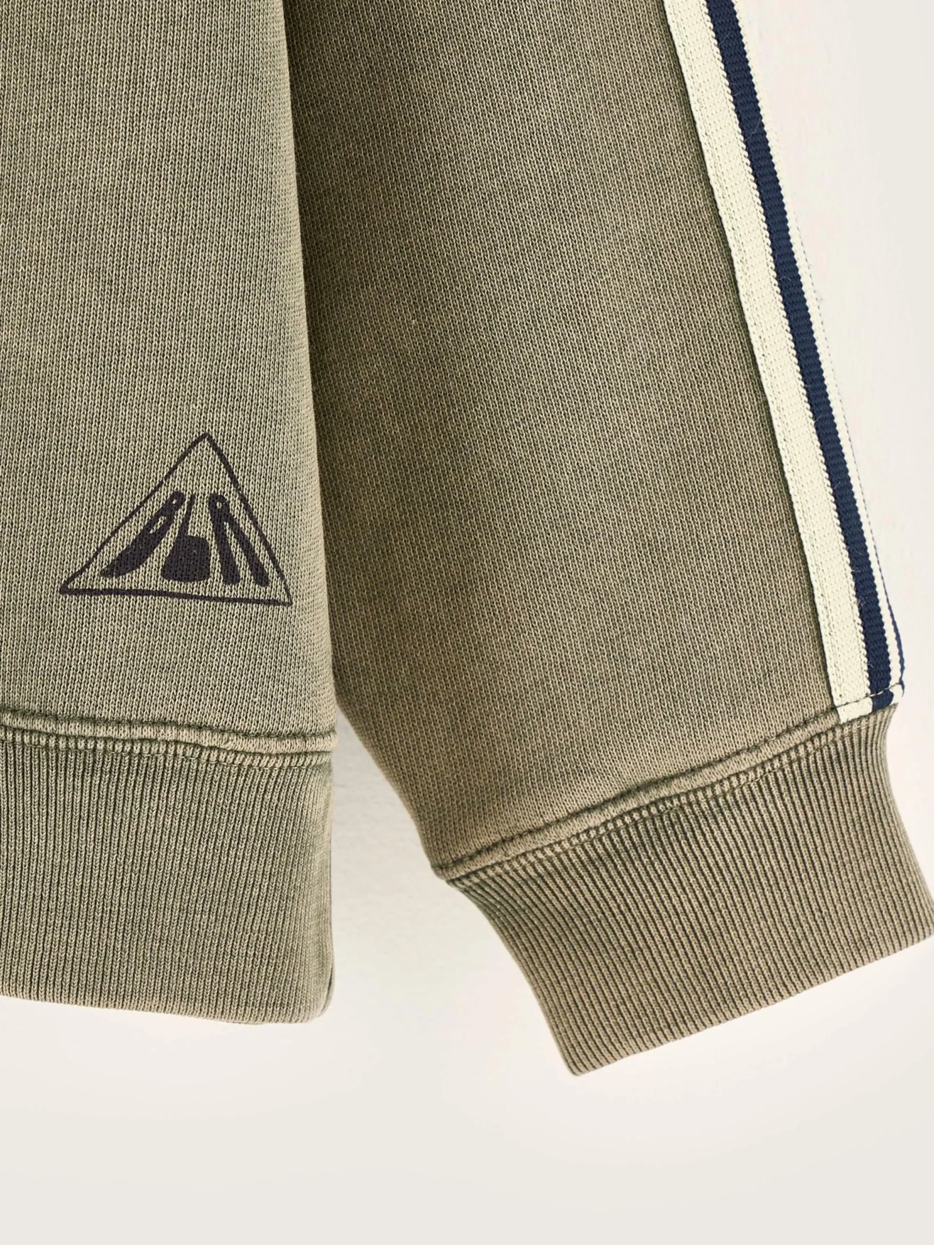 Sweatshirt à col rond, coupe classique, couleur vert mousse et bandes contrastes le long des manches.