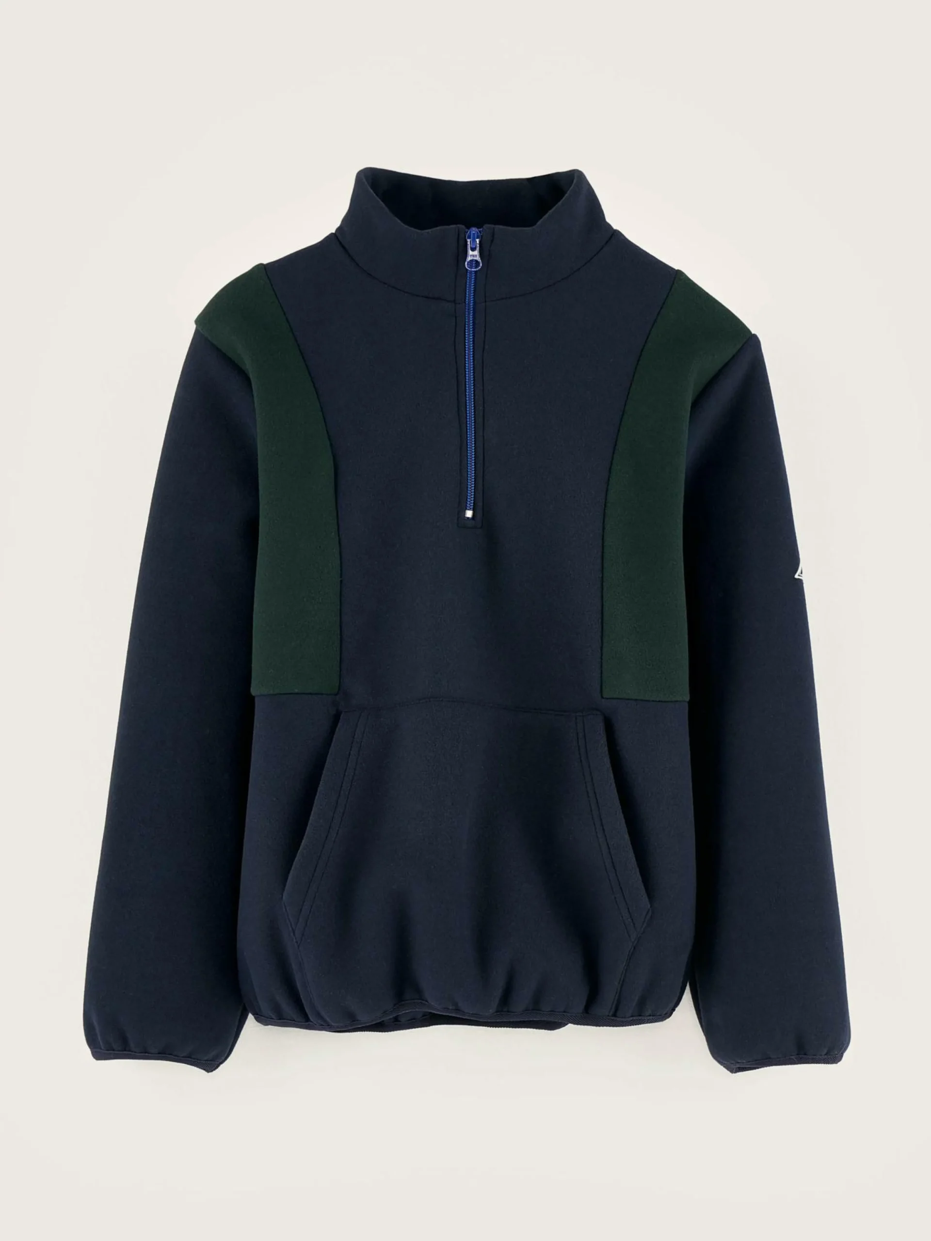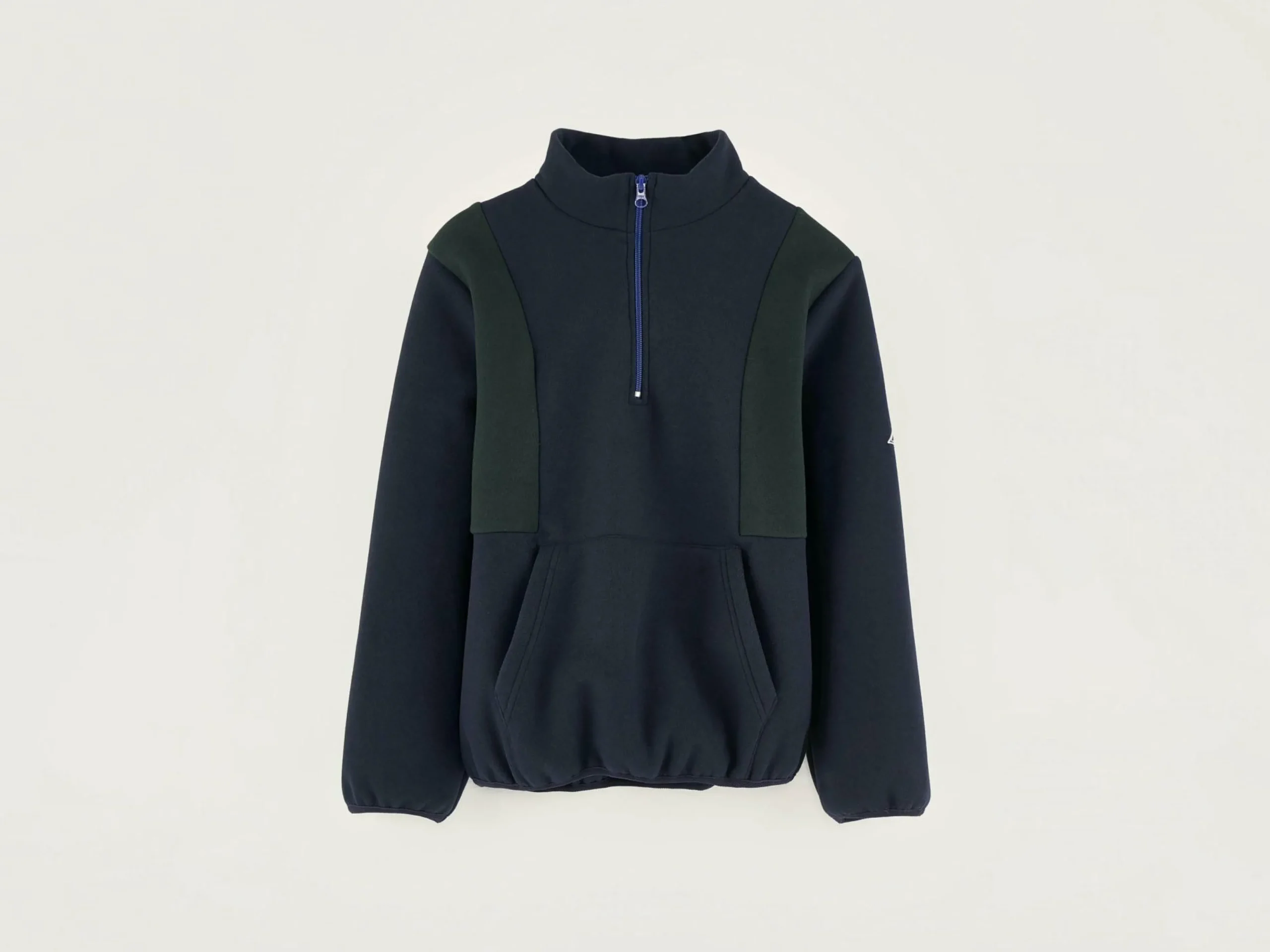 Sweatshirt coupe classique, couleur bleu foncé et col montant zippé.