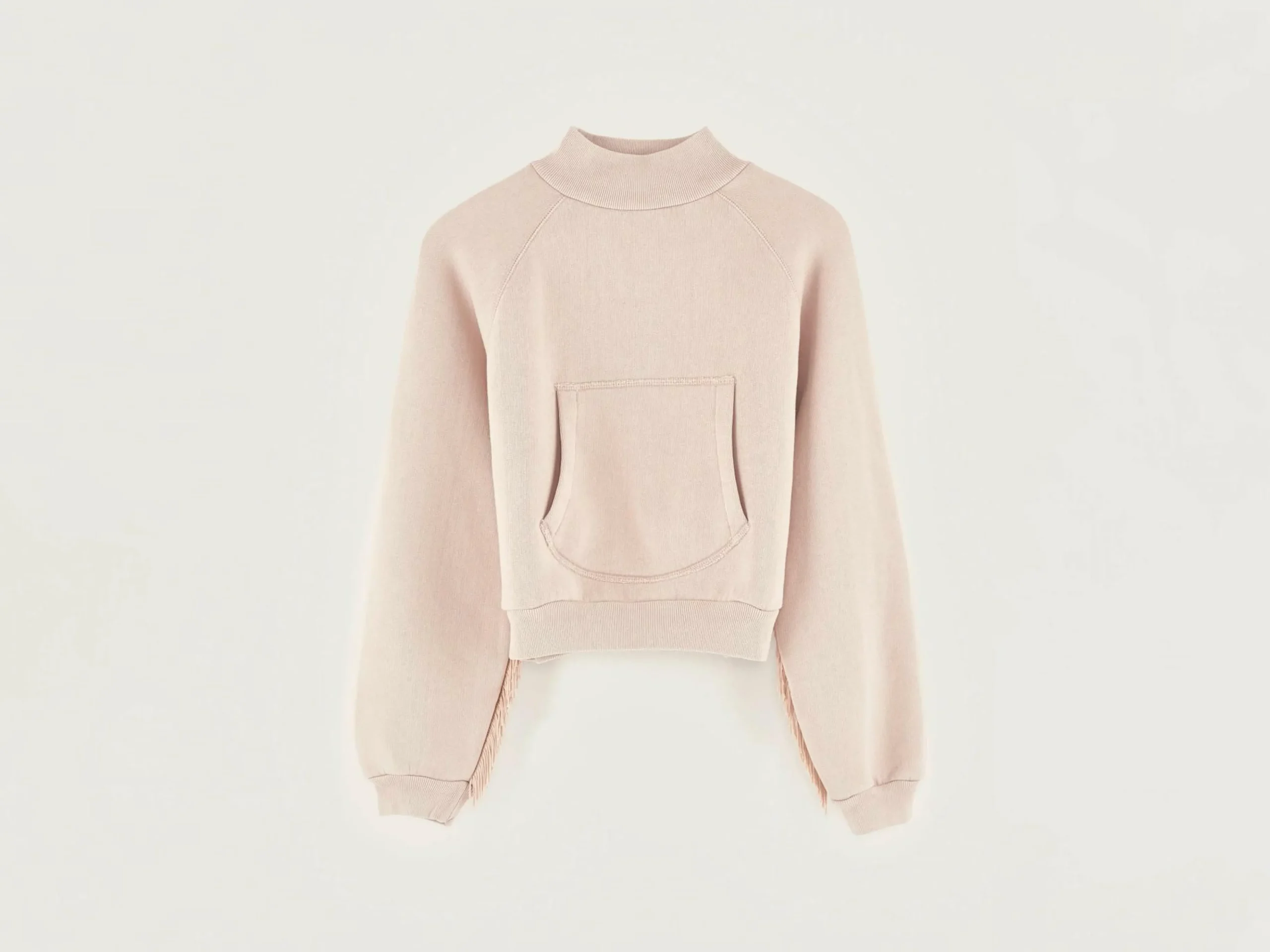 Sweatshirt en jersey rose poudré, coupe décontracté, col relevé et franges le long des manches.