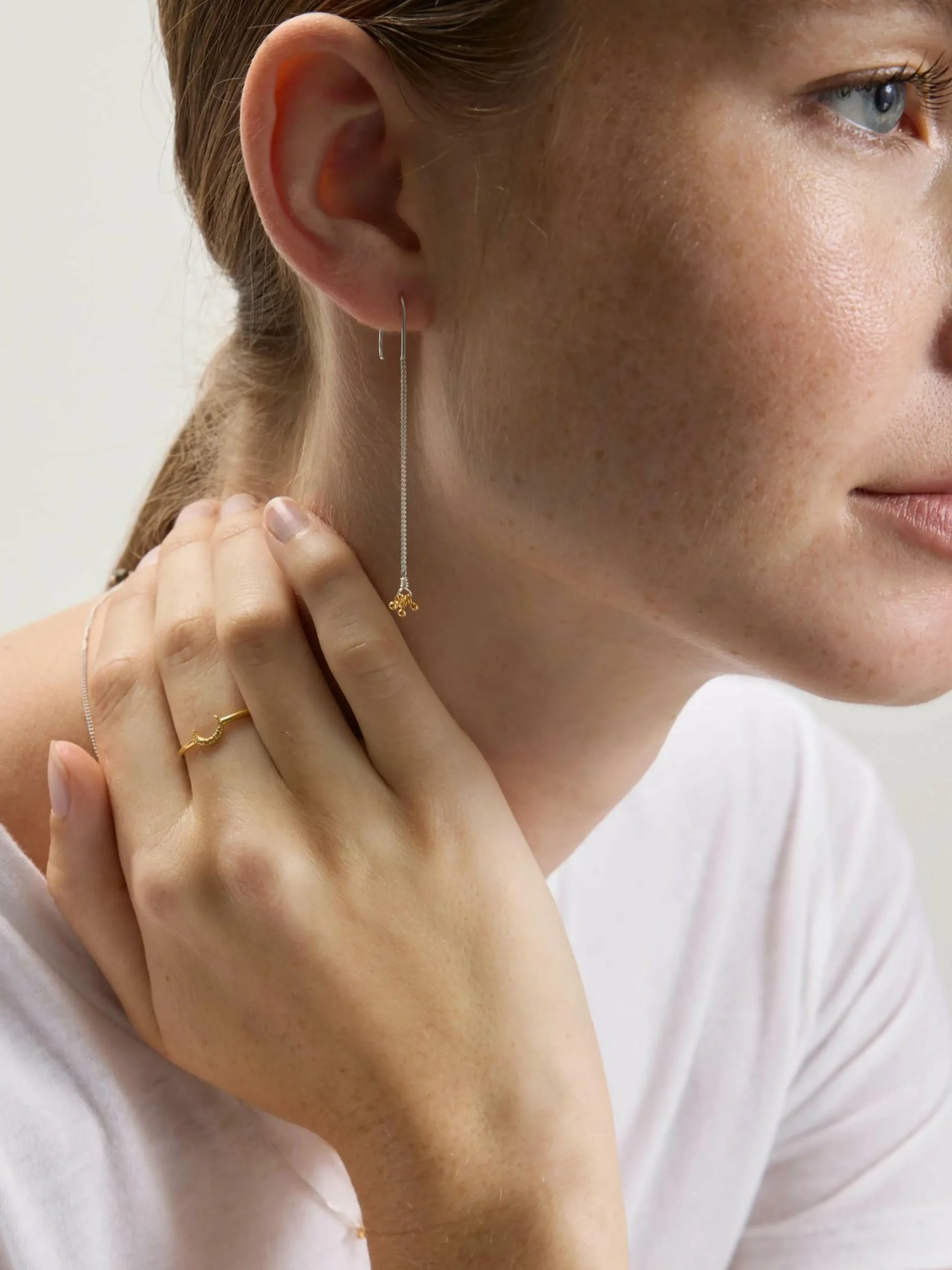 The GilbertGilbert Bubble earrings feature mini golden ball pendants suspended from silver chain links.