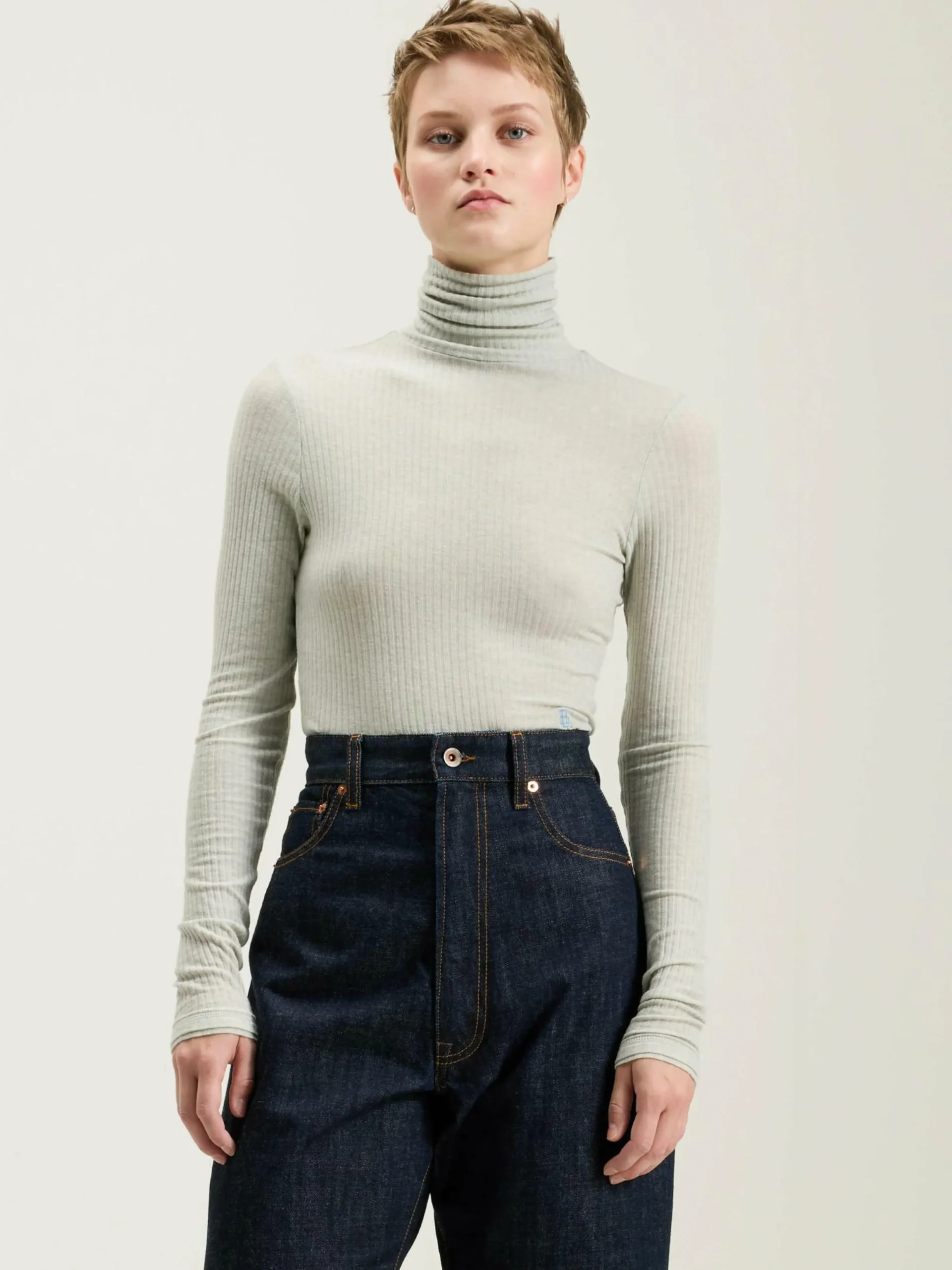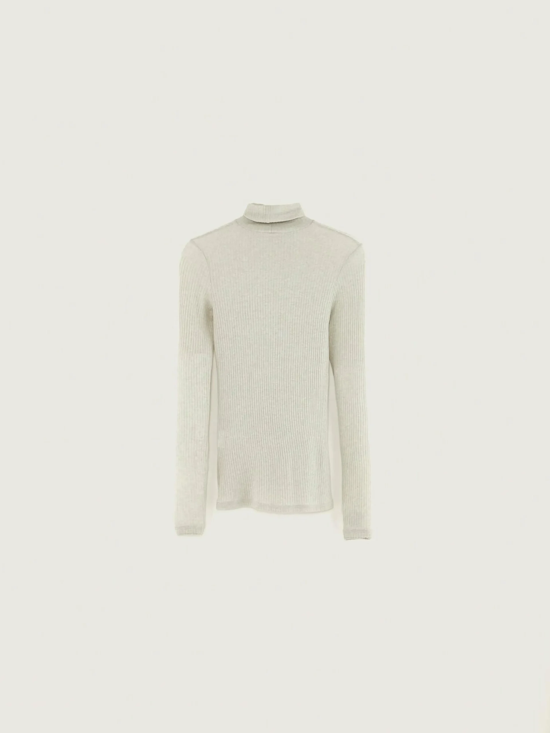 T-shirt en jersey côtelé gris clair, coupe slim et col montant twisté.