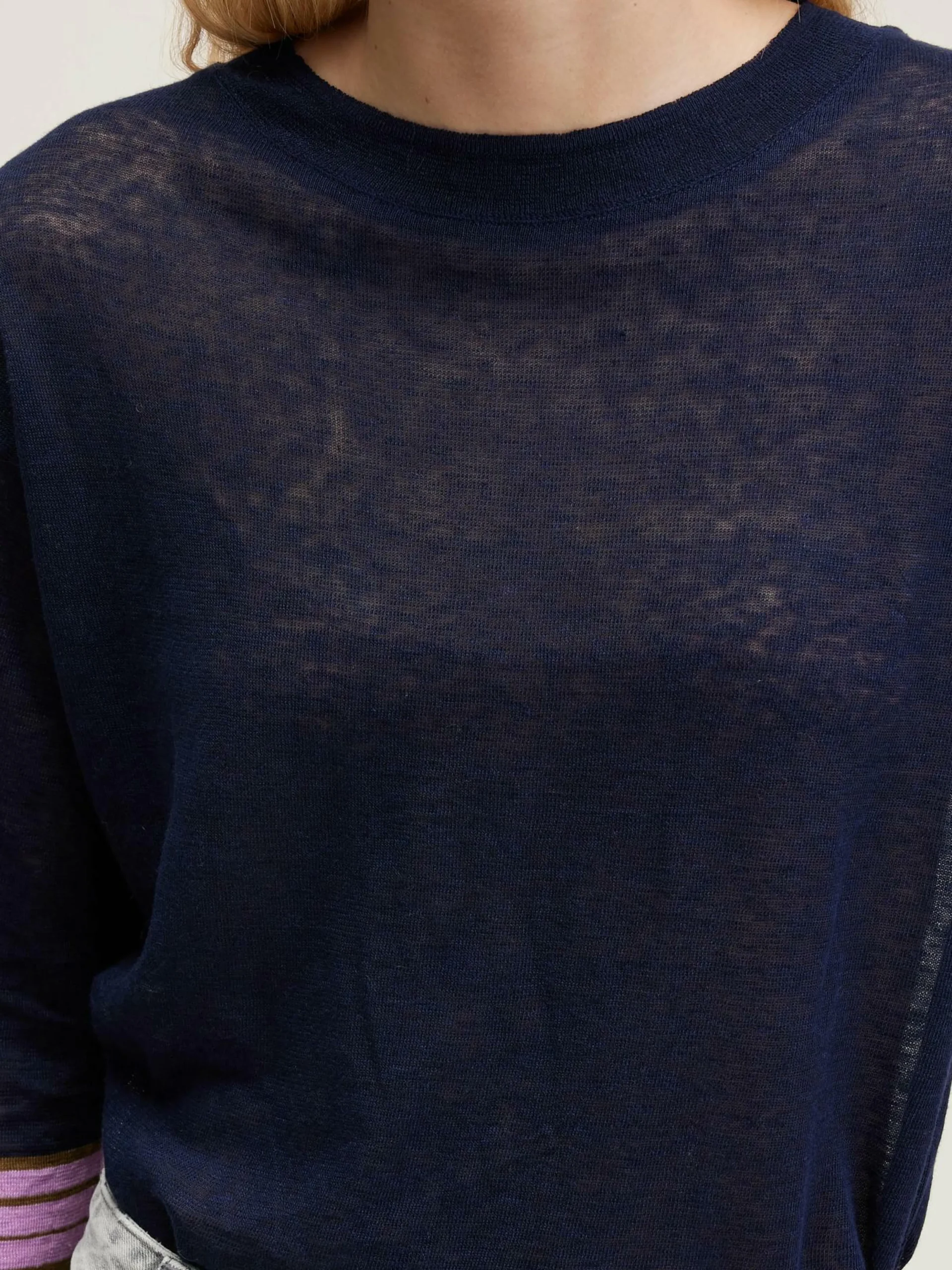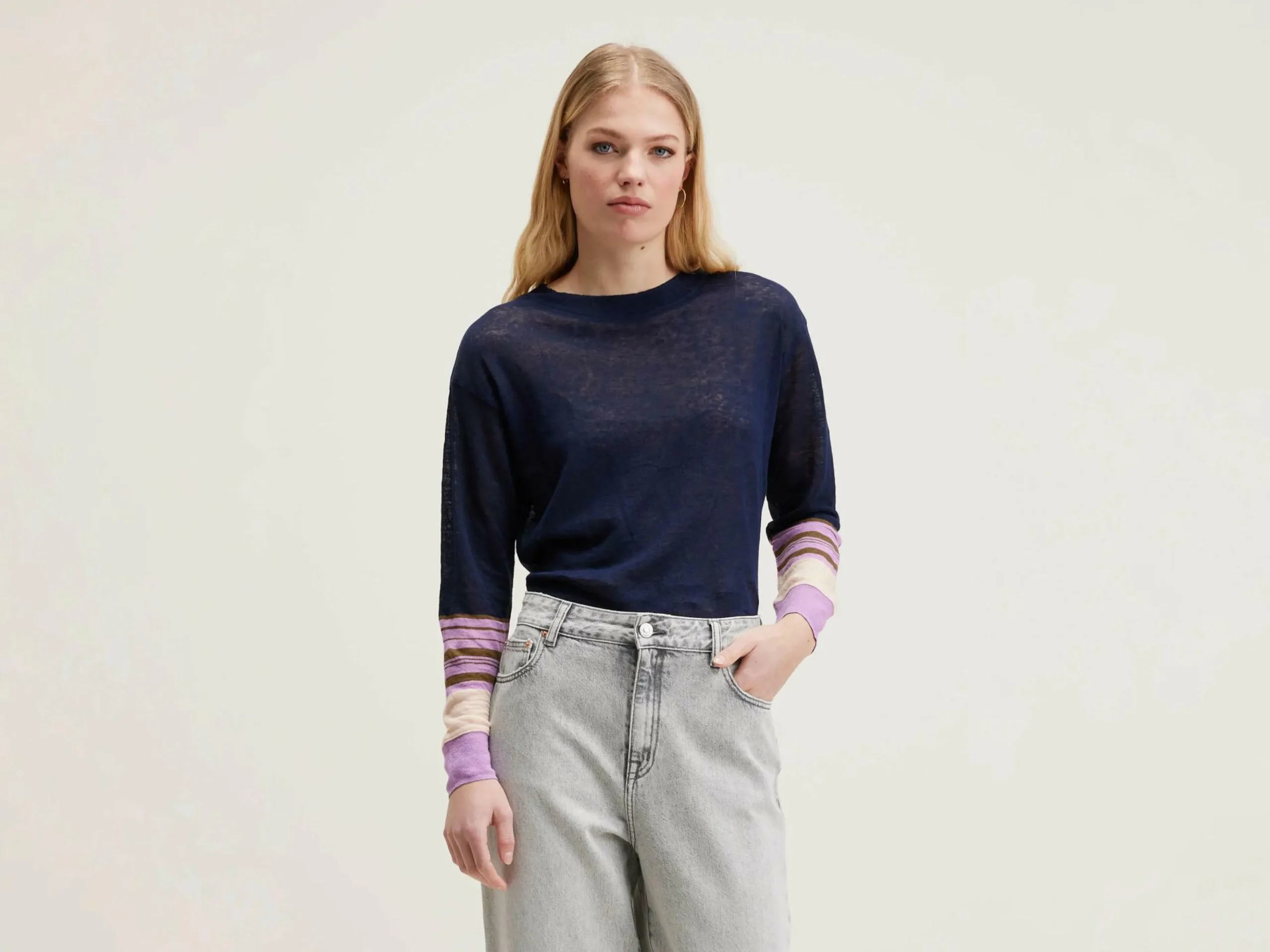 T-shirt en lin bleu marine coupe décontractée, manches longues avec rayures contrastées.