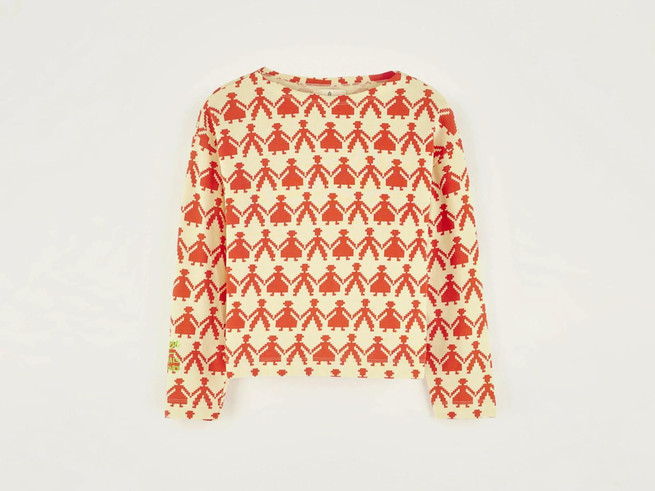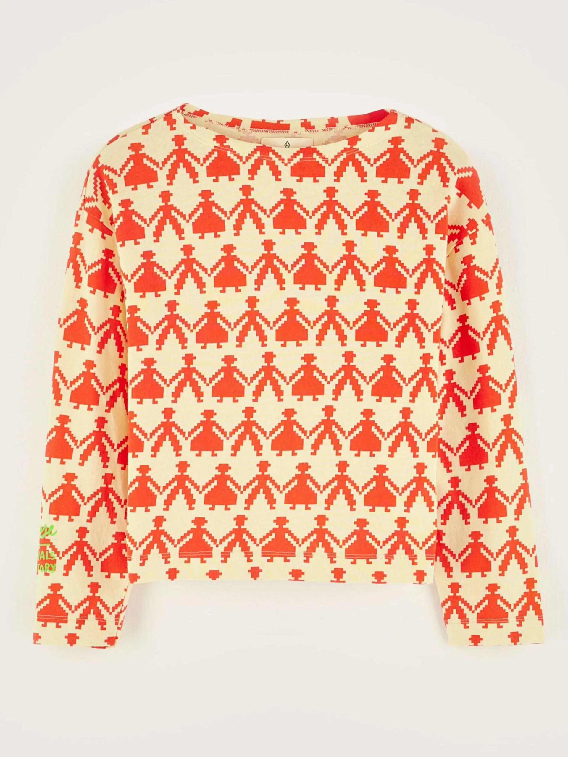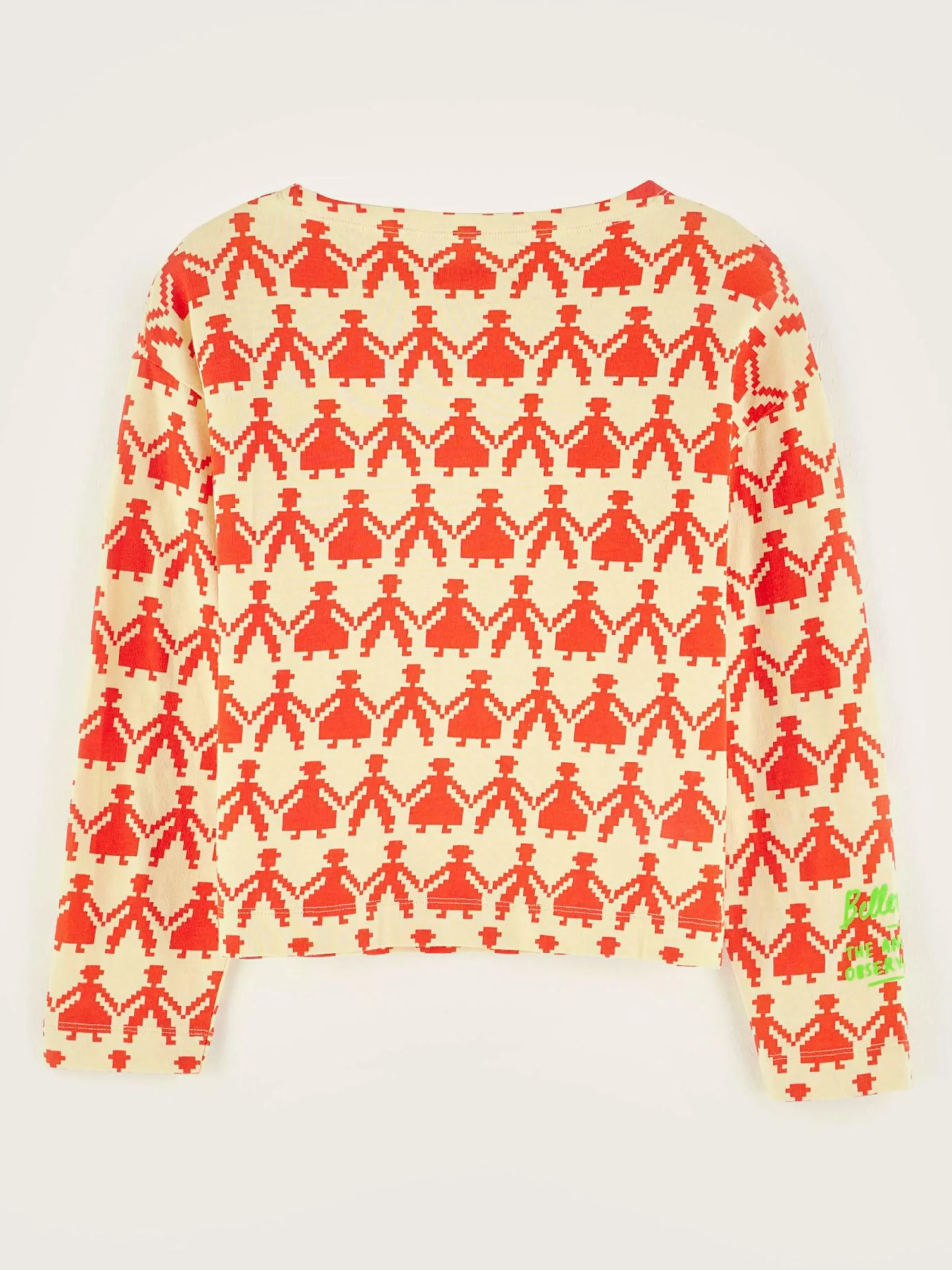 T-shirt évasé en coton jaune imprimé de personnages pixelisés.