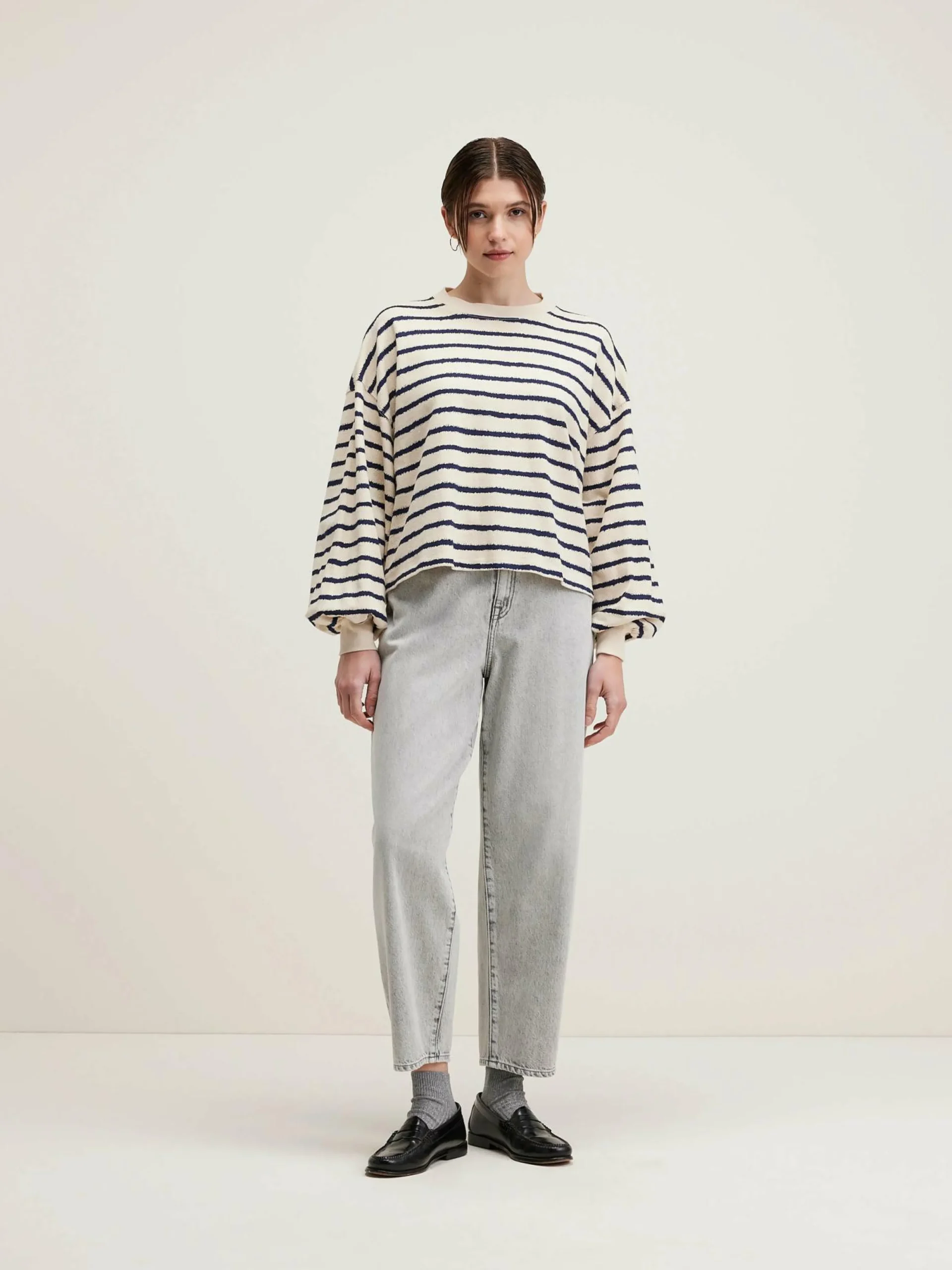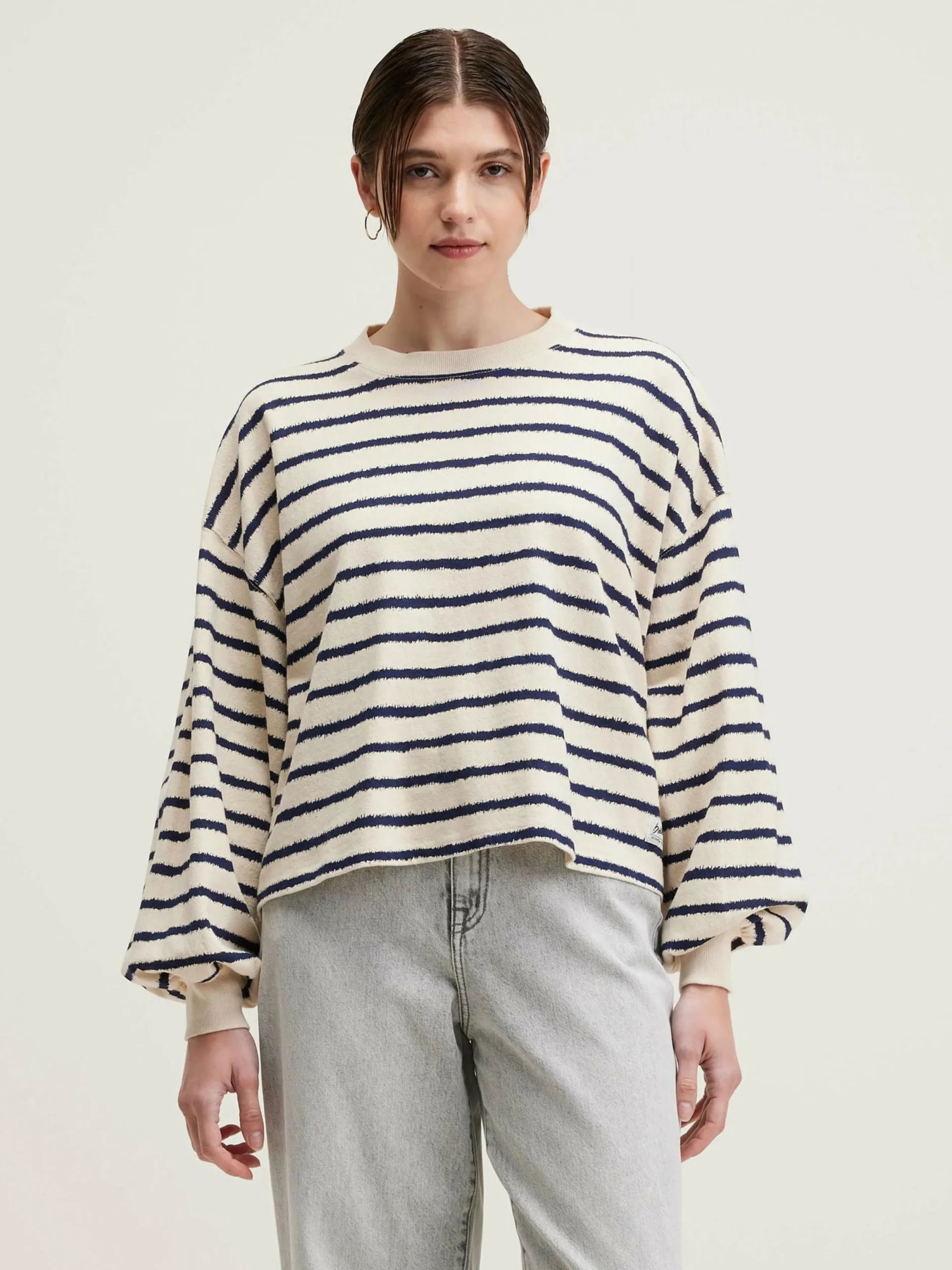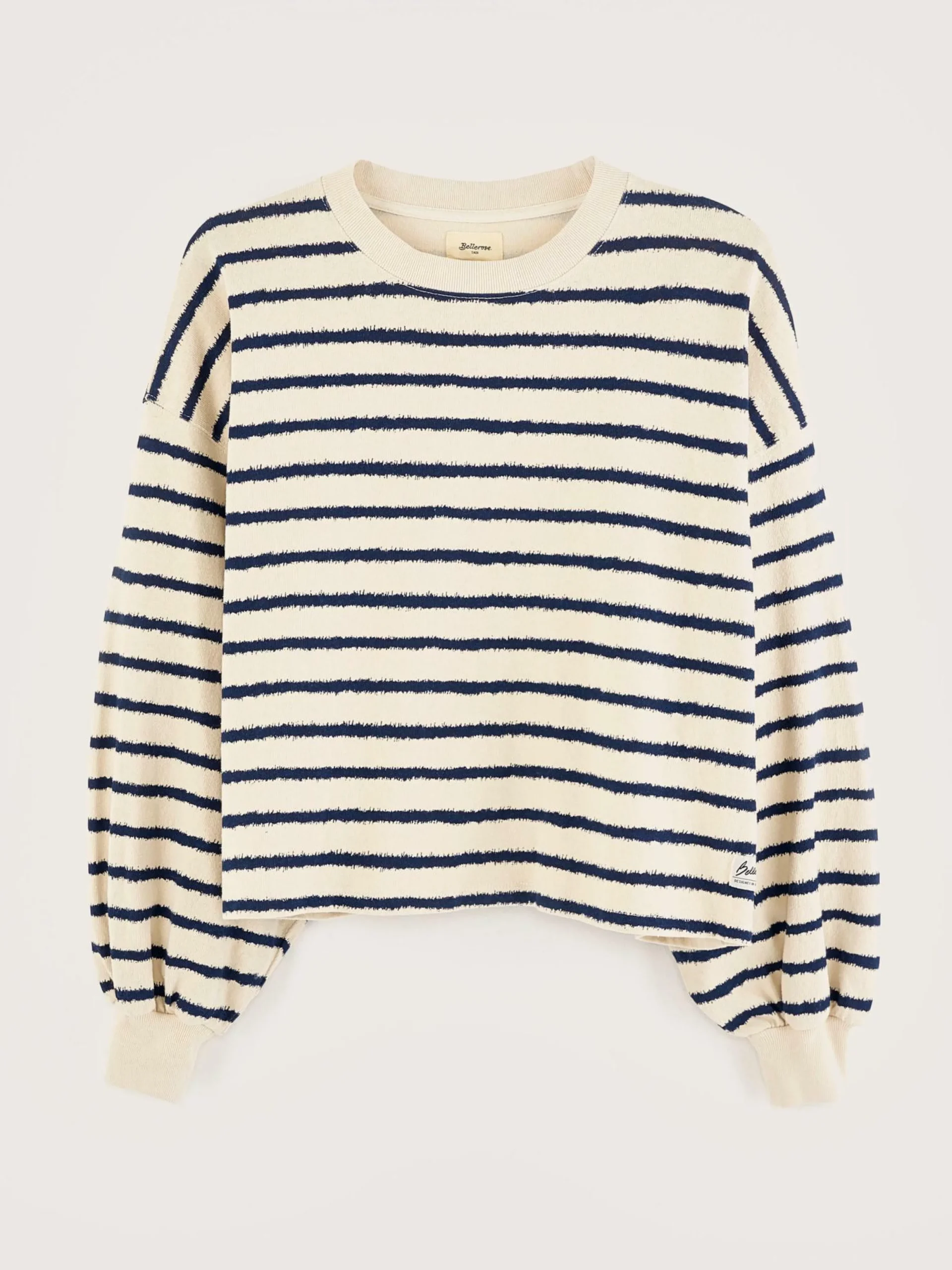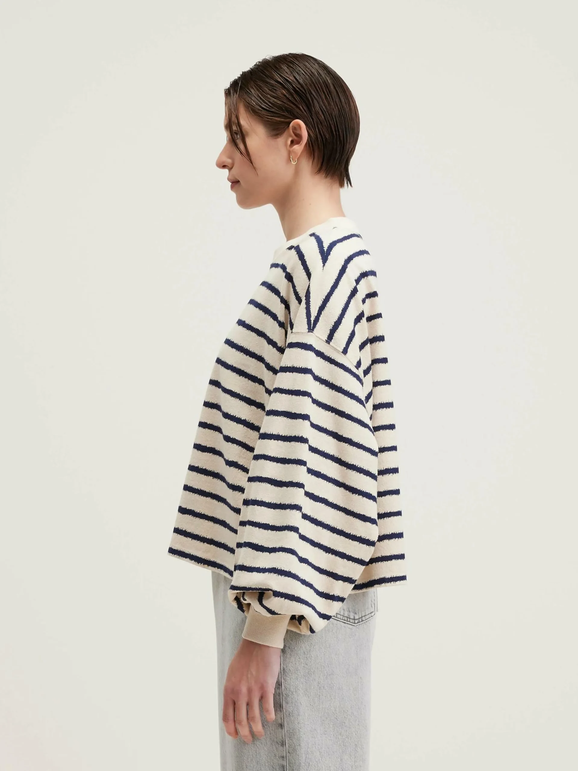 T-shirt oversize en coton écru avec des rayures bleu marine irrégulières.