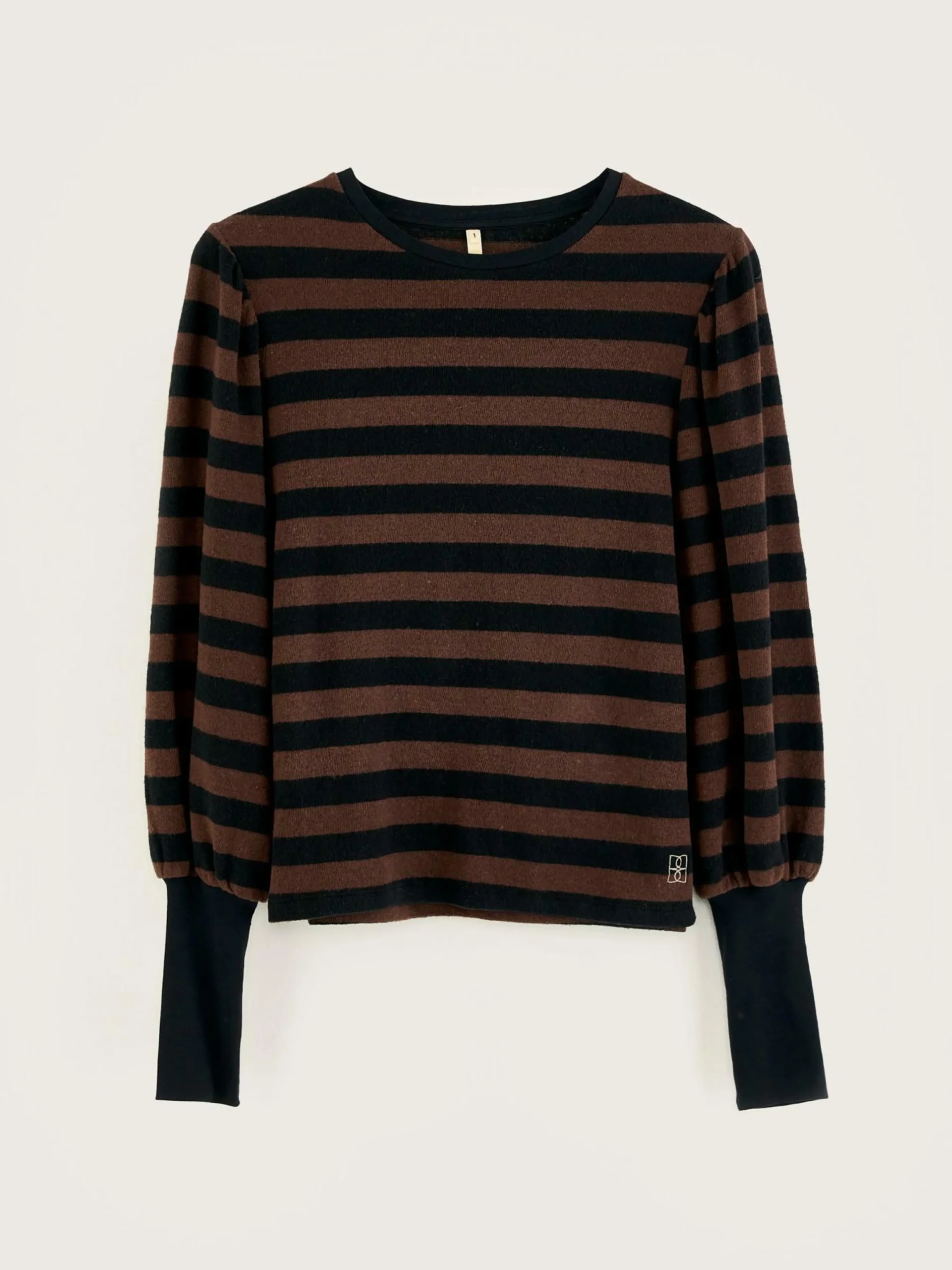 T-shirt en jersey rayé noir et brun, manches bouffantes, col rond et poignets ajustés.