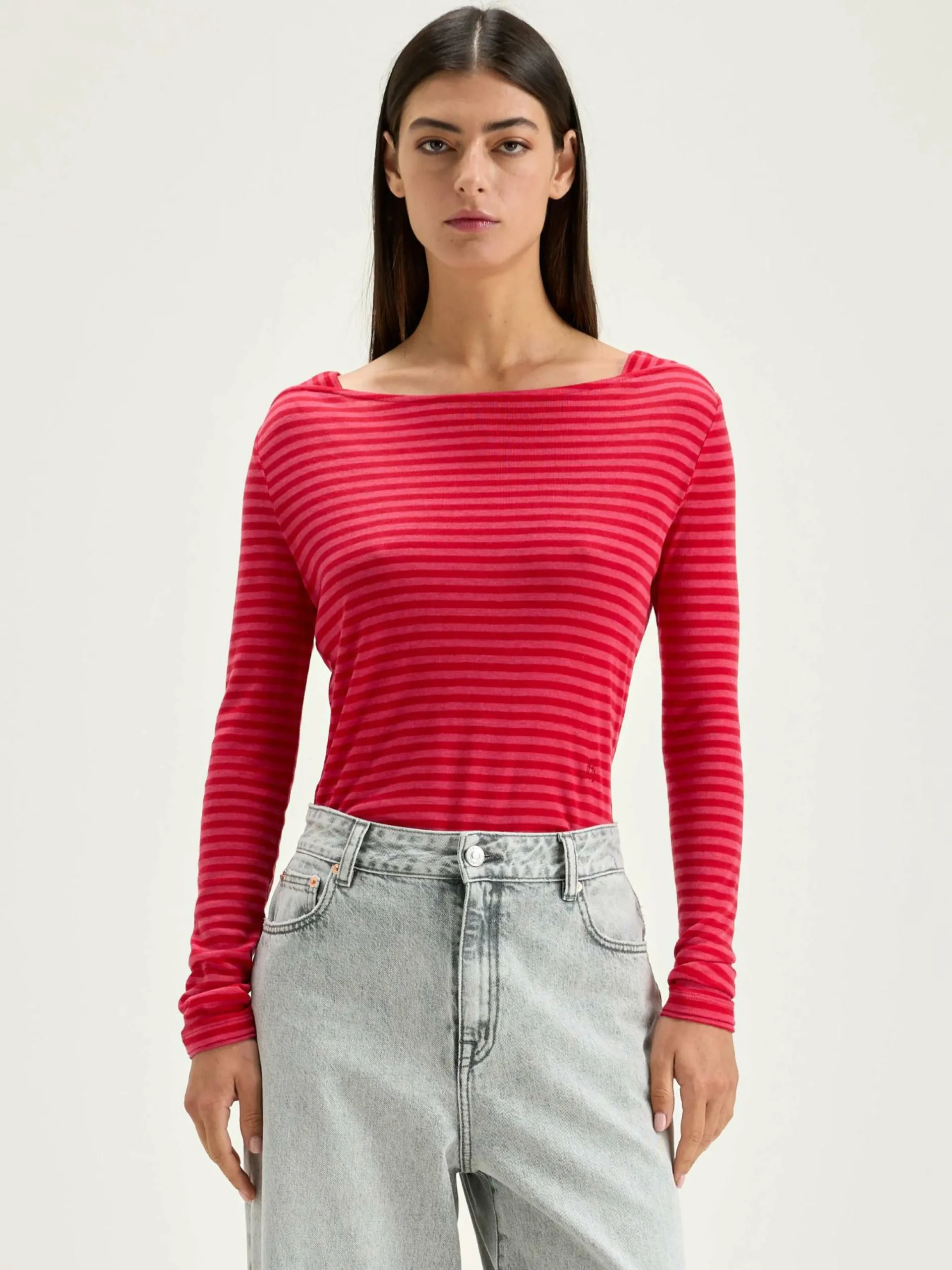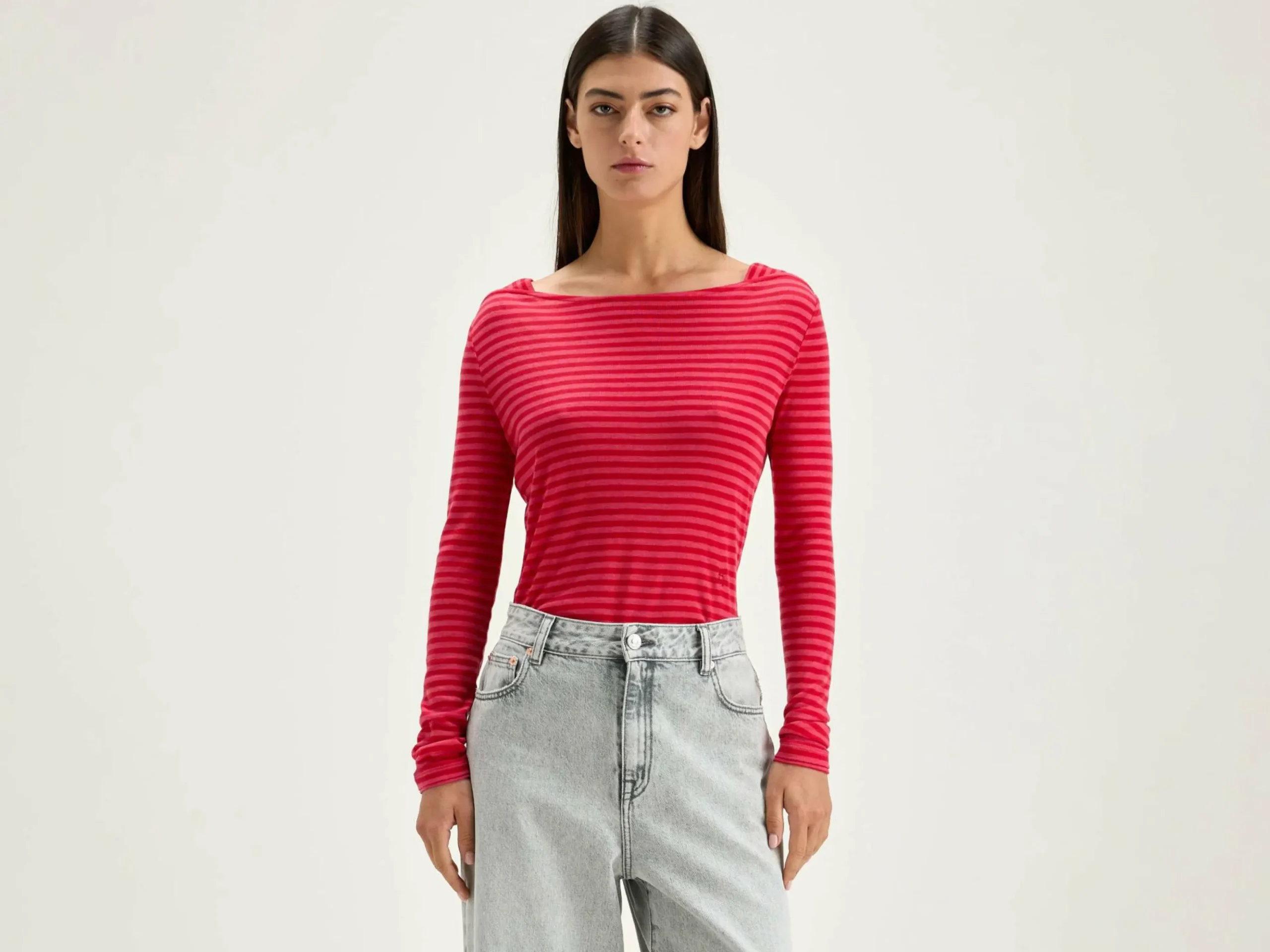 T-shirt rayé rose et rouge, coupe slim, manches longues et encolure bateau.