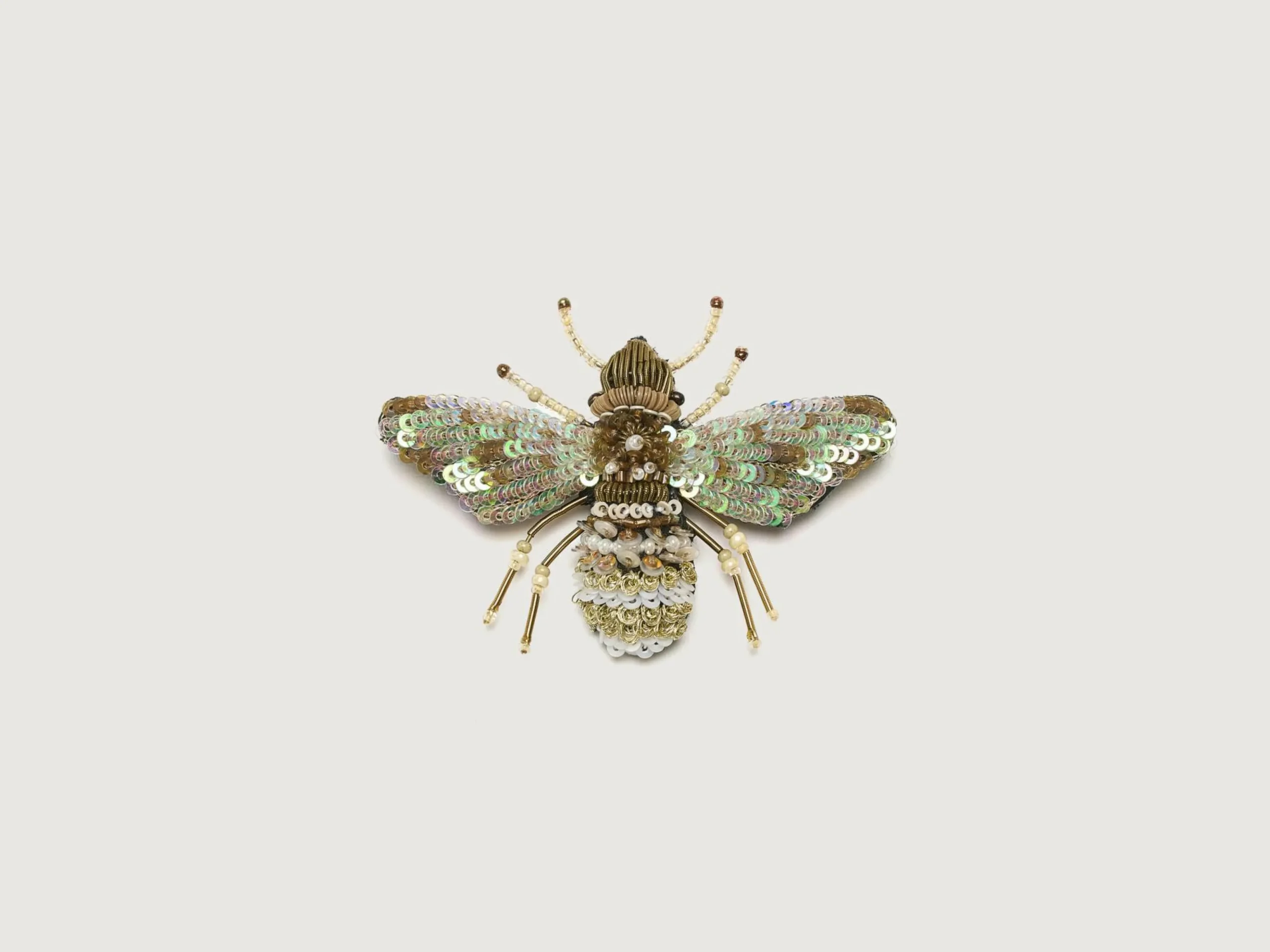 La broche Trovelore Pearl Bee, brodée à la main par des artisans indiens, est une ravissante pièce d’art à porter.