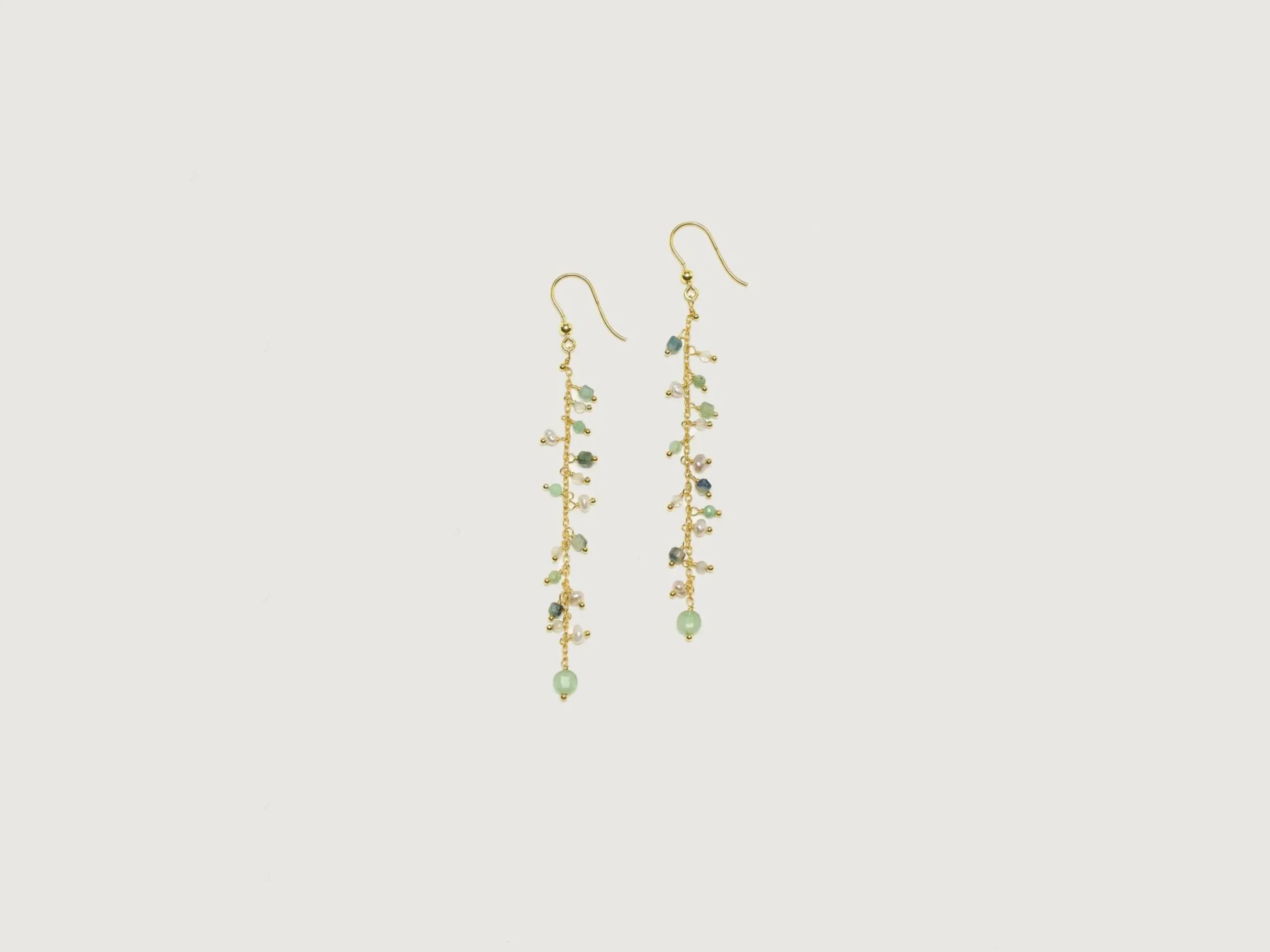 Les boucles d’oreilles Untitledition Ribes sont de magnifiques longues chaînes en or vermeil avec des perles d’eau douce et des pierres précieuses.