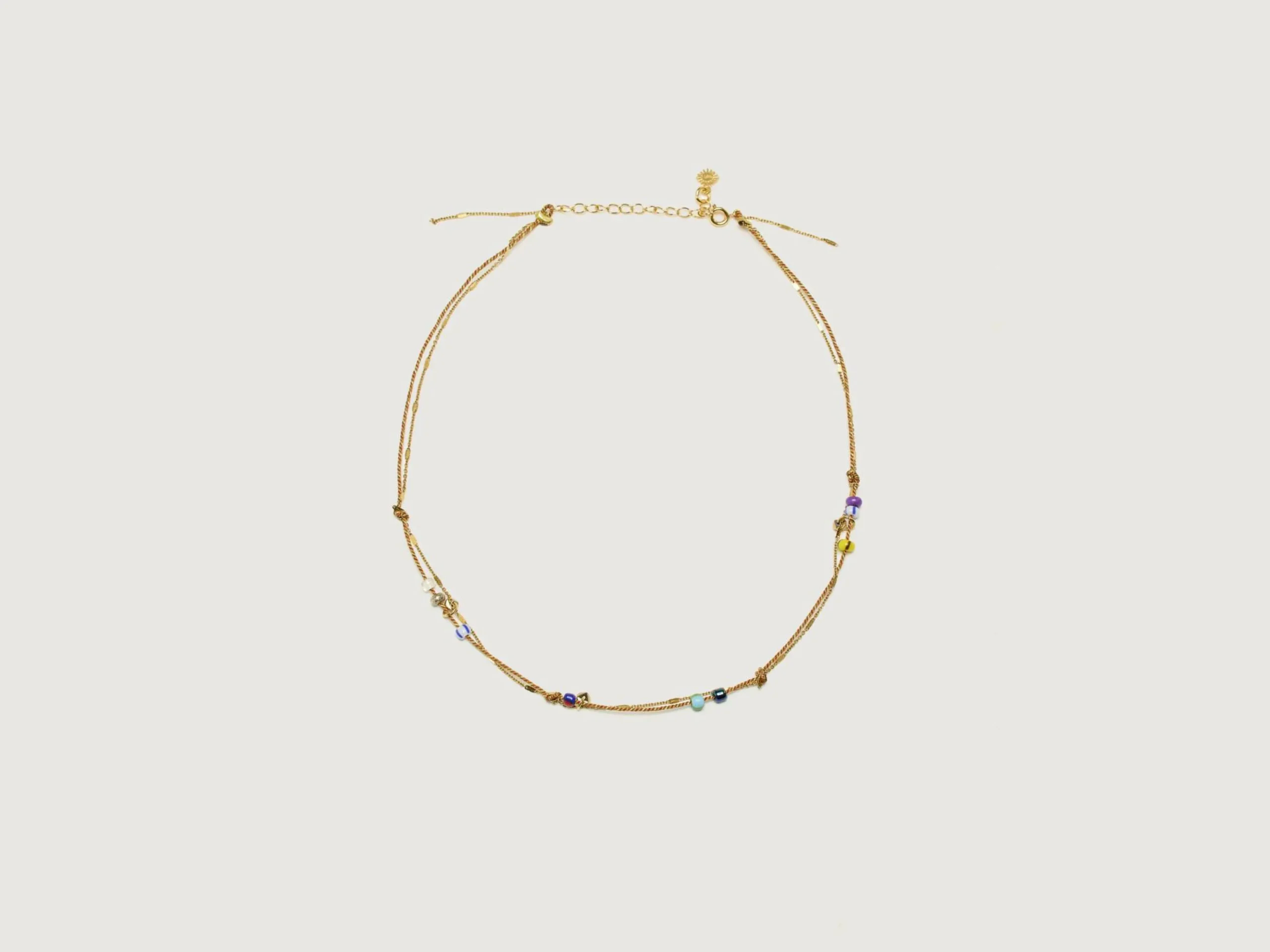 Le collier Sugarloaf de Vadi Jewels est un mélange éclectique de perles sur un fil en polyester tressé avec un fil d’or.
