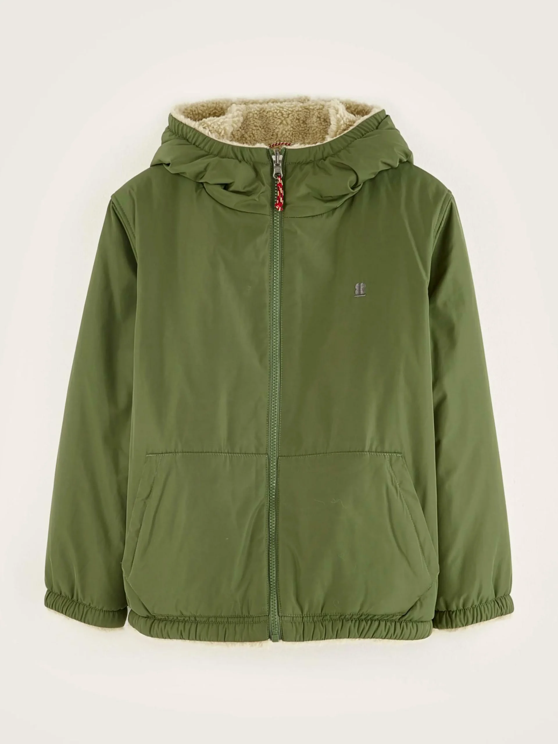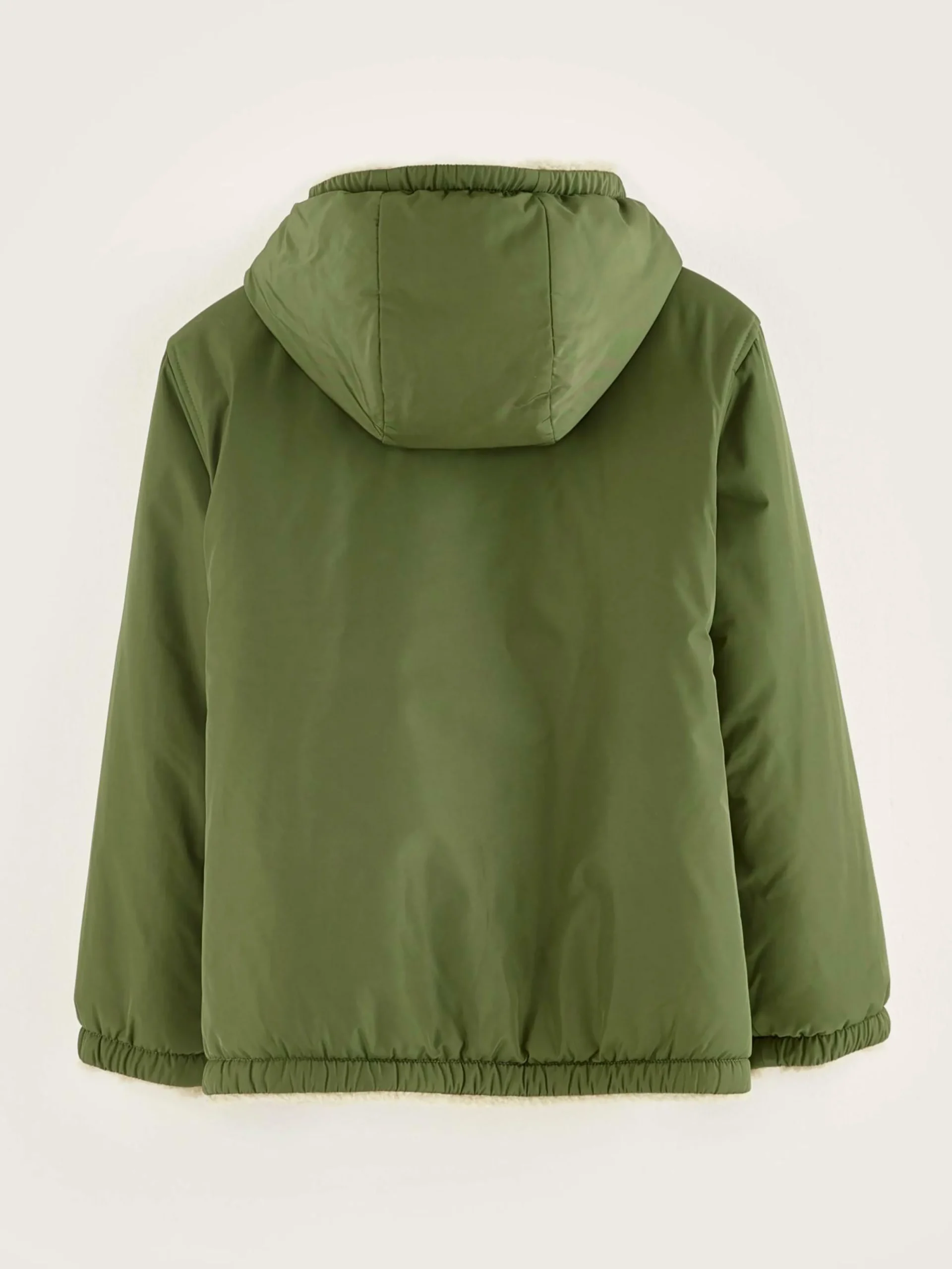 Veste réversible à capuche, coupe classique en tissu déperlant vert kaki et doublée de teddy.