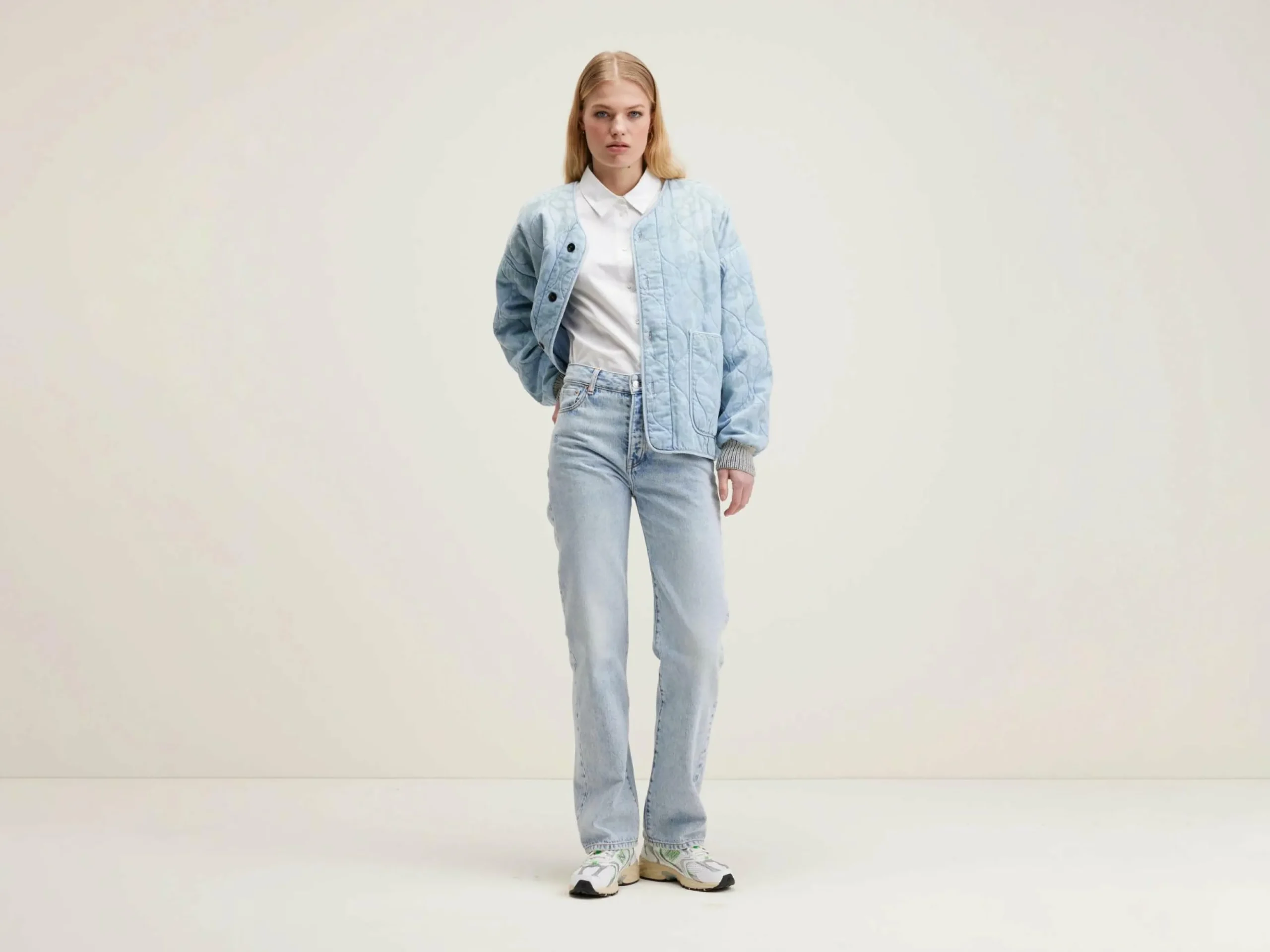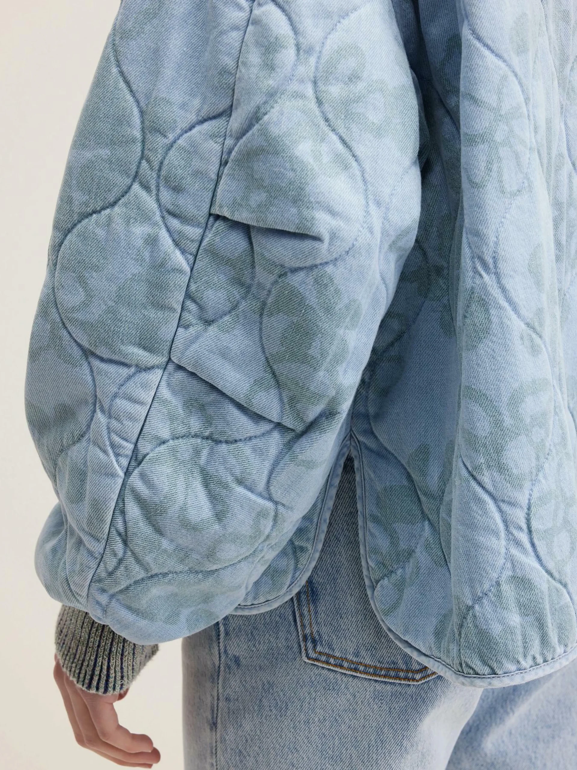 Veste oversize en denim de coton bleu clair quilté et imprimé de motifs floraux ton sur ton.