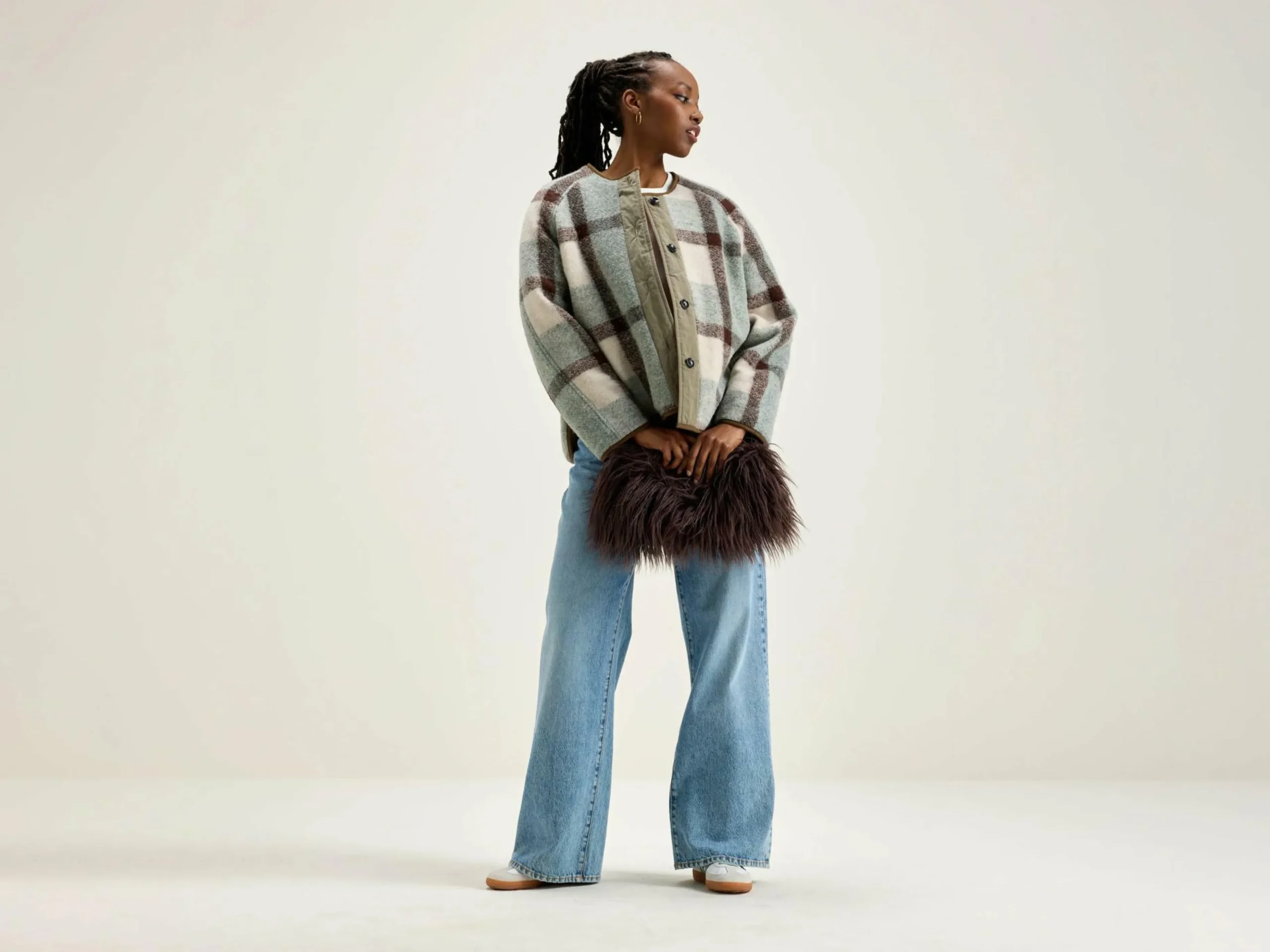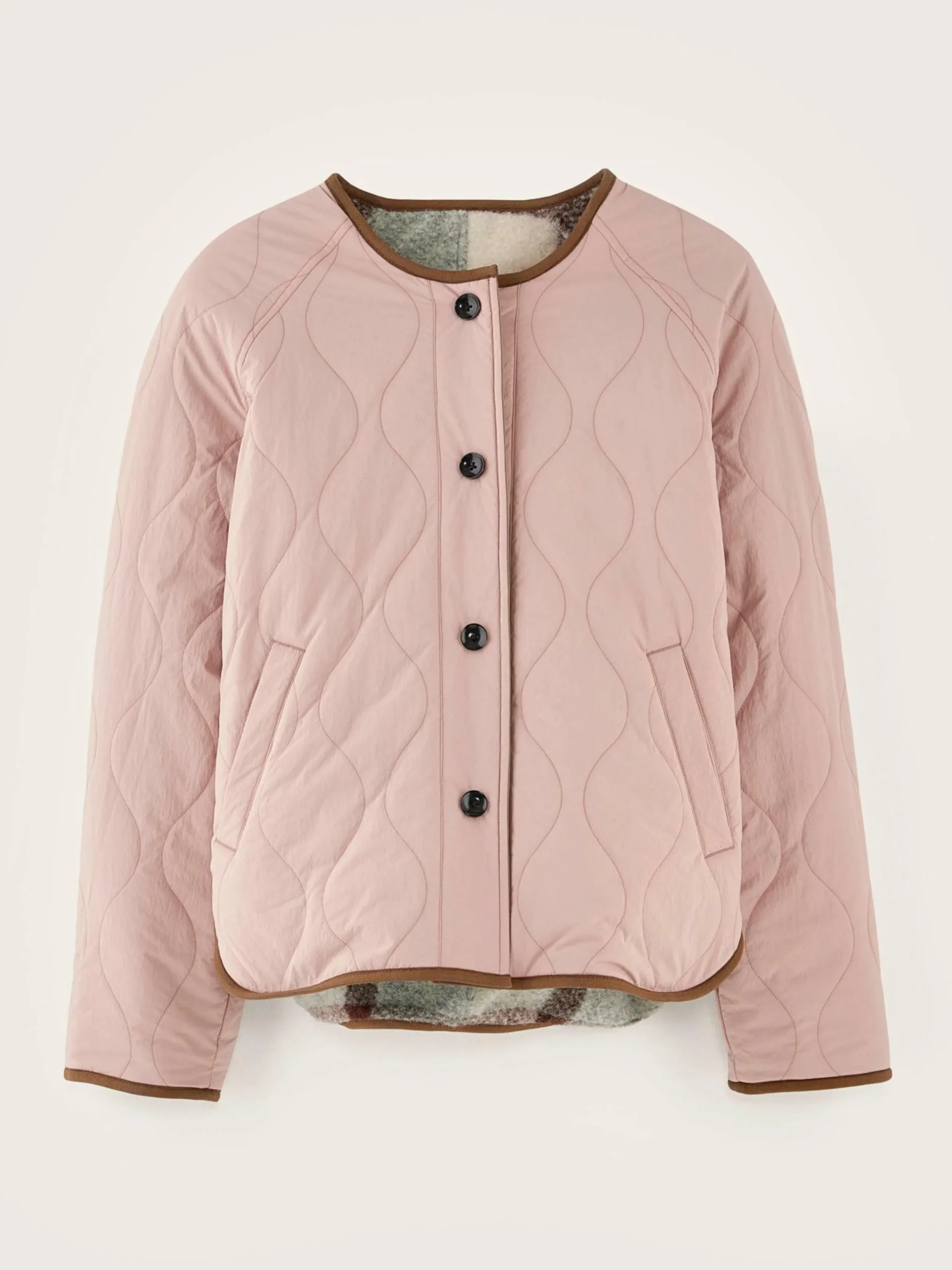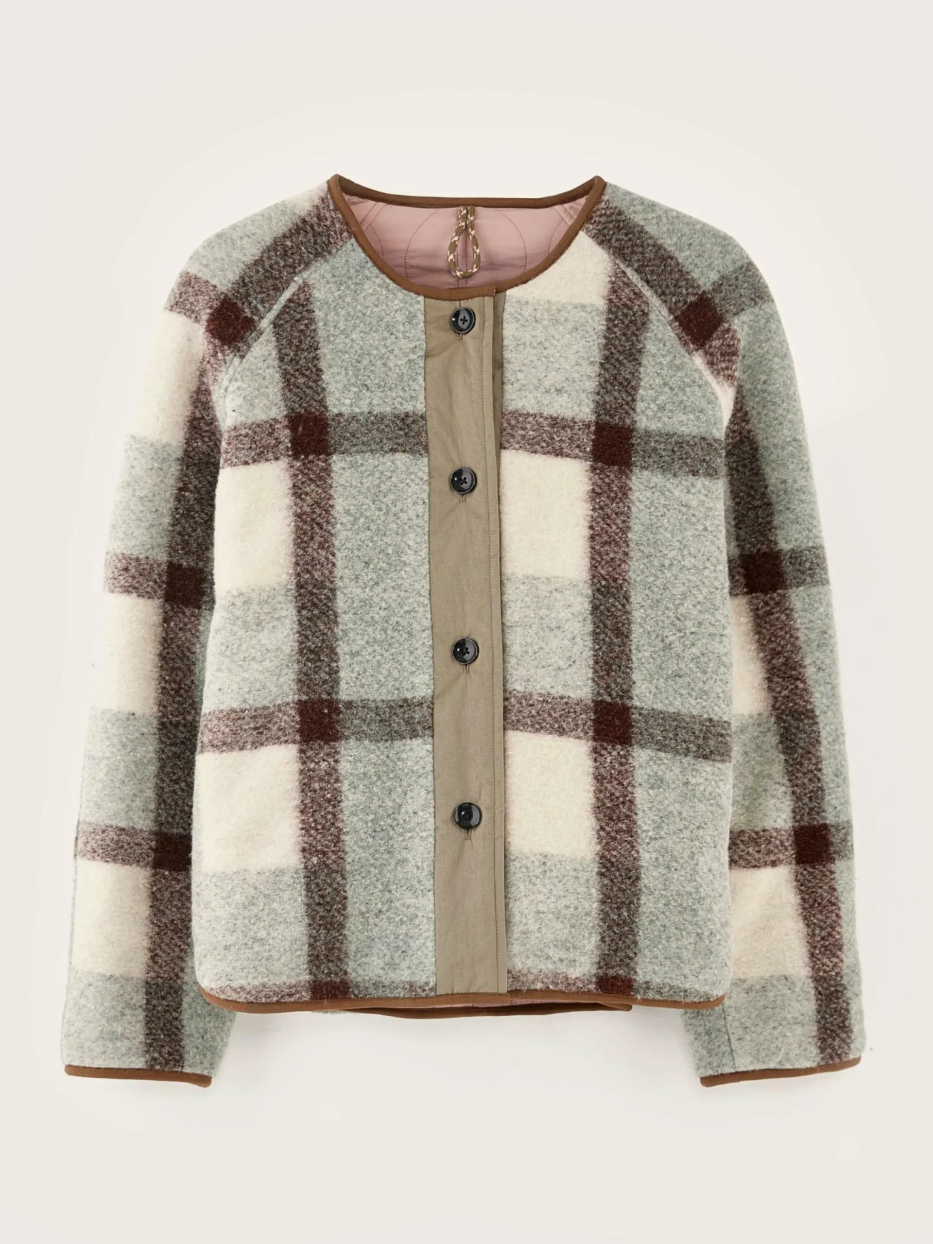 Veste oversize réversible à manches raglan, un côté en ripstop vieux rose et un côté en laine mélangée à carreaux.