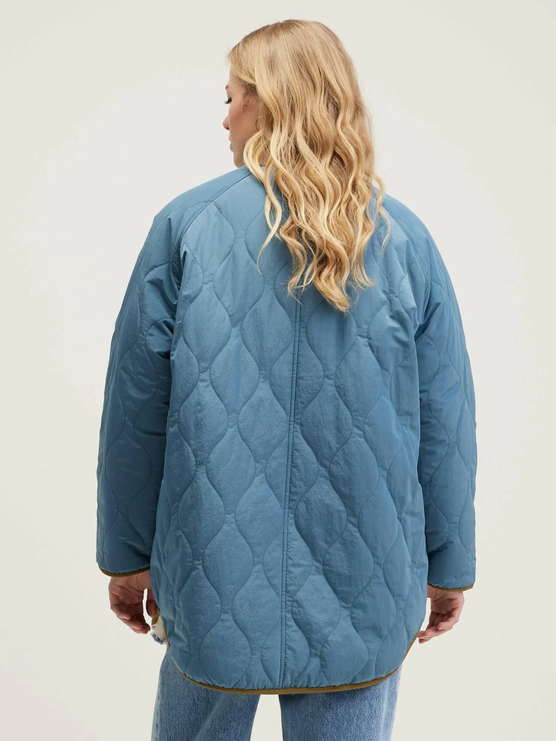 Veste bleue oversize et réversible. Une face satinée et matelassée en nylon bleu et une face en teddy imprimé de fleurs géantes.