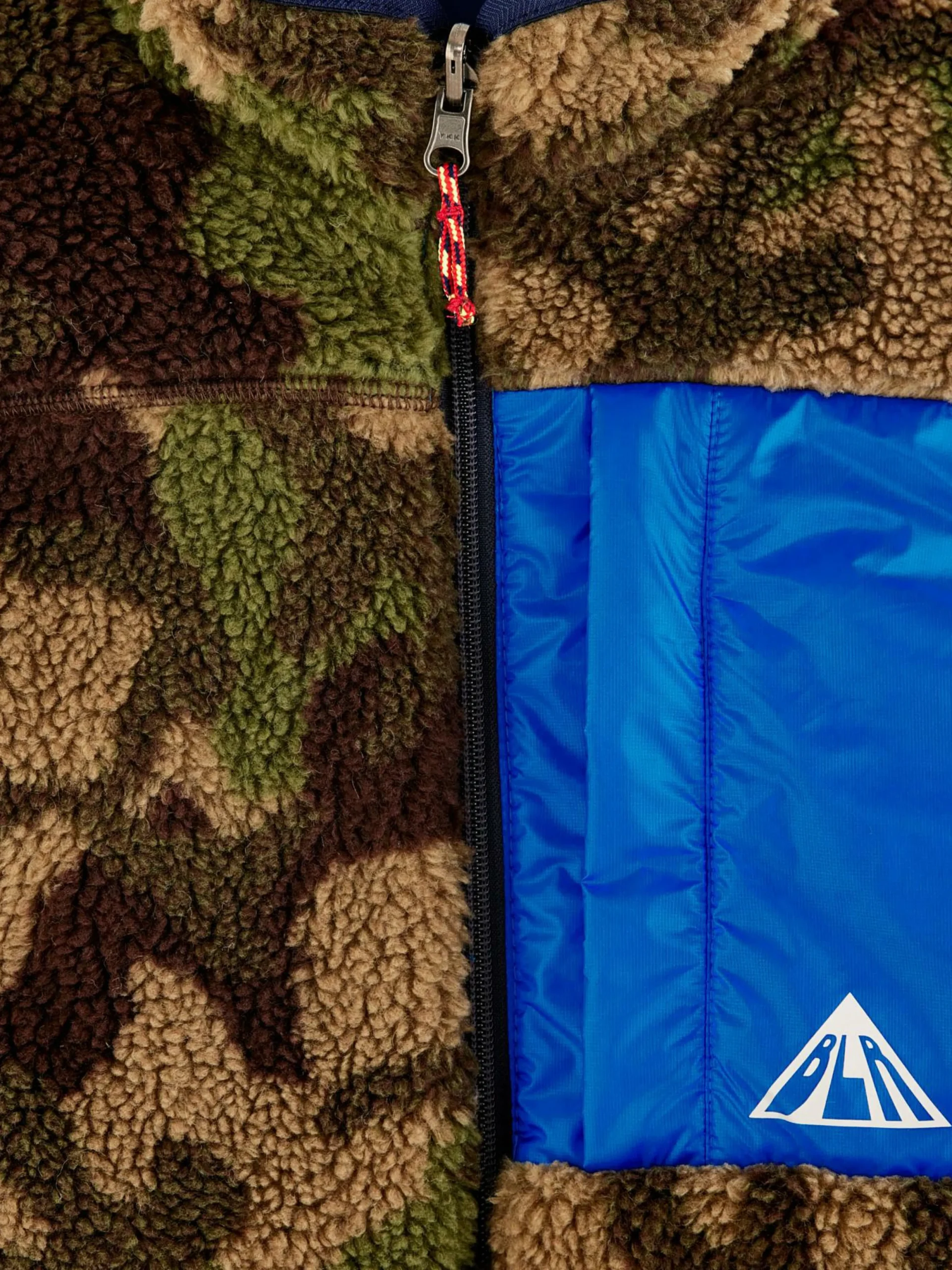 Bodywarmer réversible et genderless avec un côté en teddy imprimé camouflage et l’autre en tissu bleu déperlant.