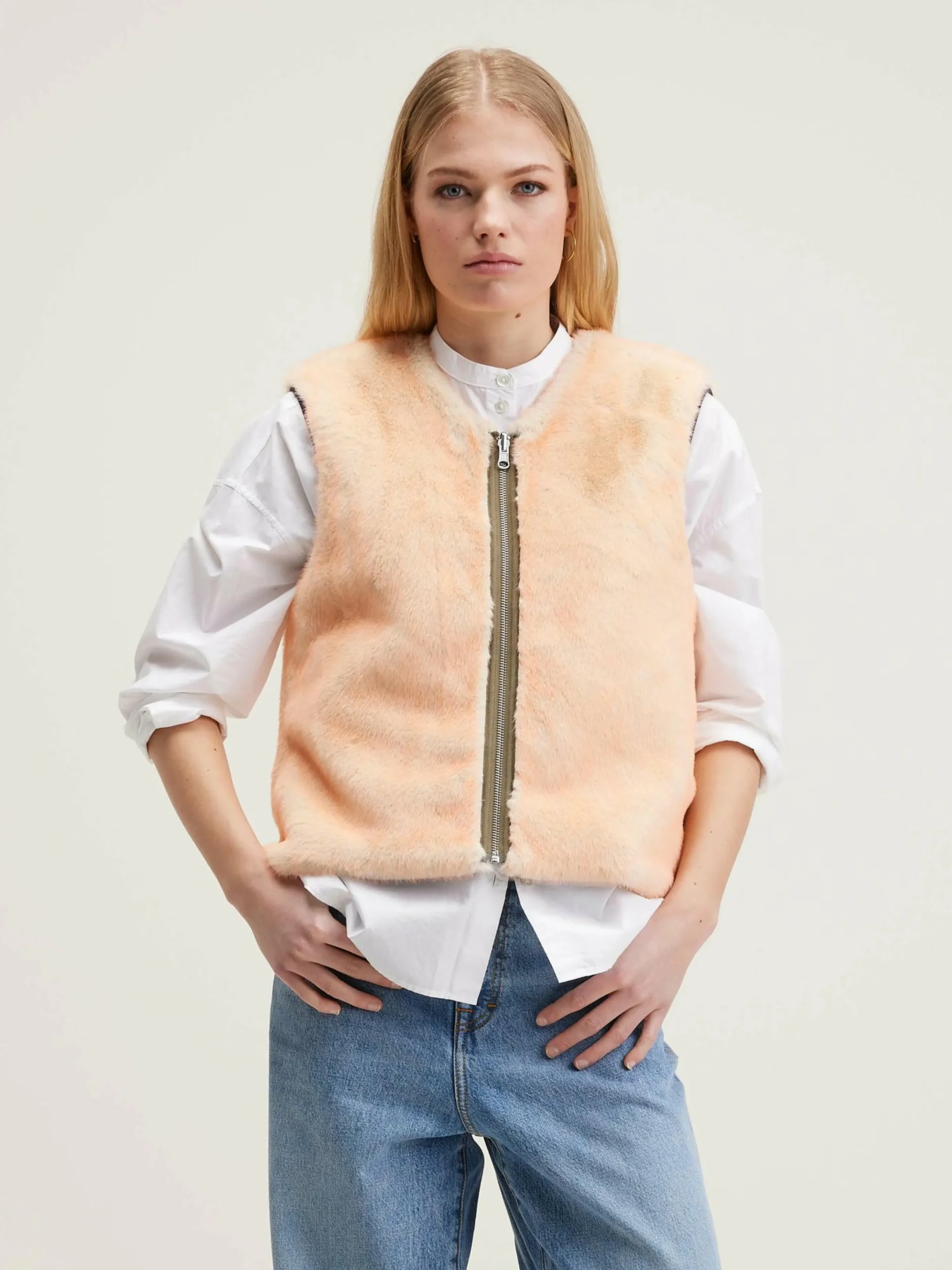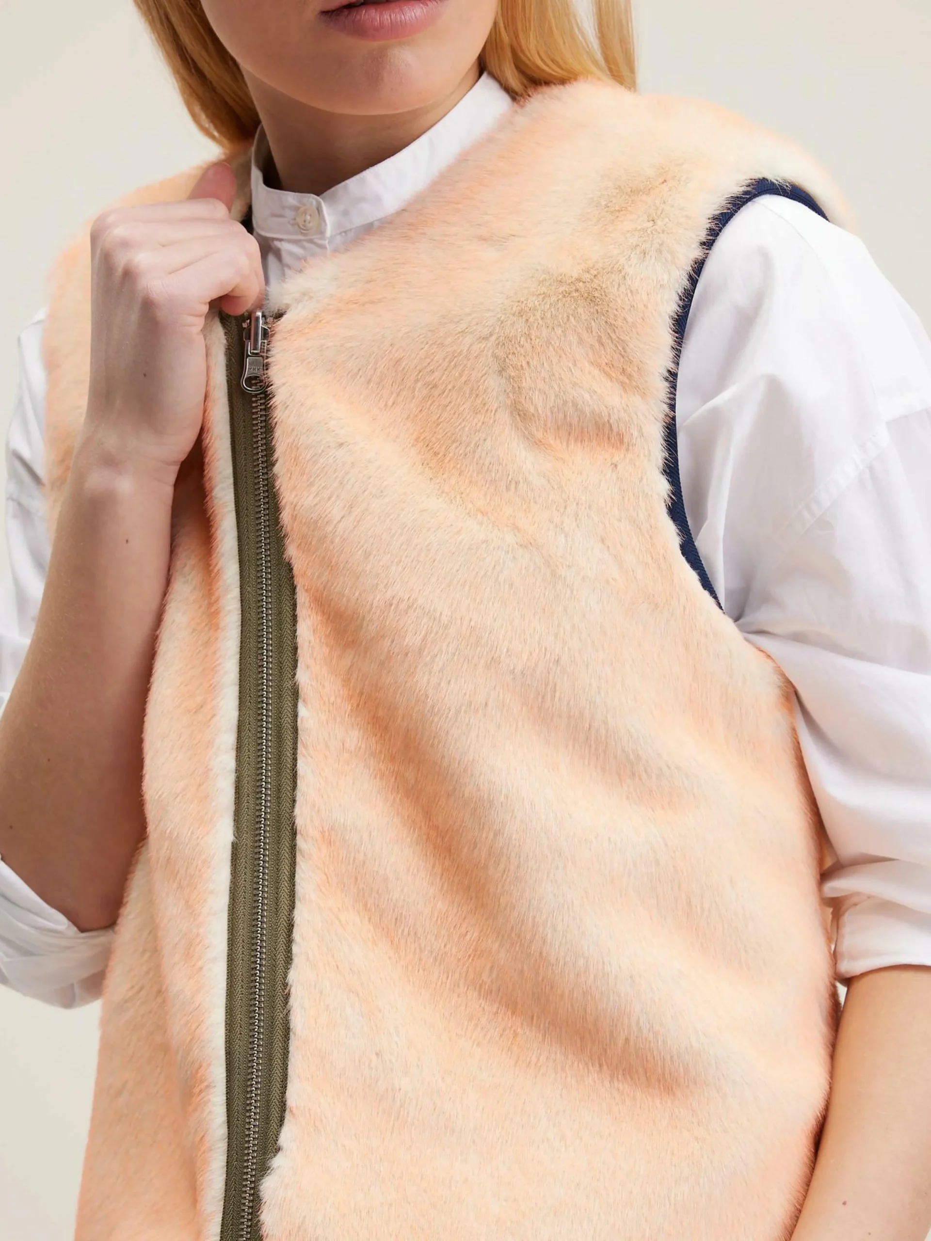 Surchemise réversible avec un côté en flanelle bleu marine rayée et l’autre en fausse fourrure rose.