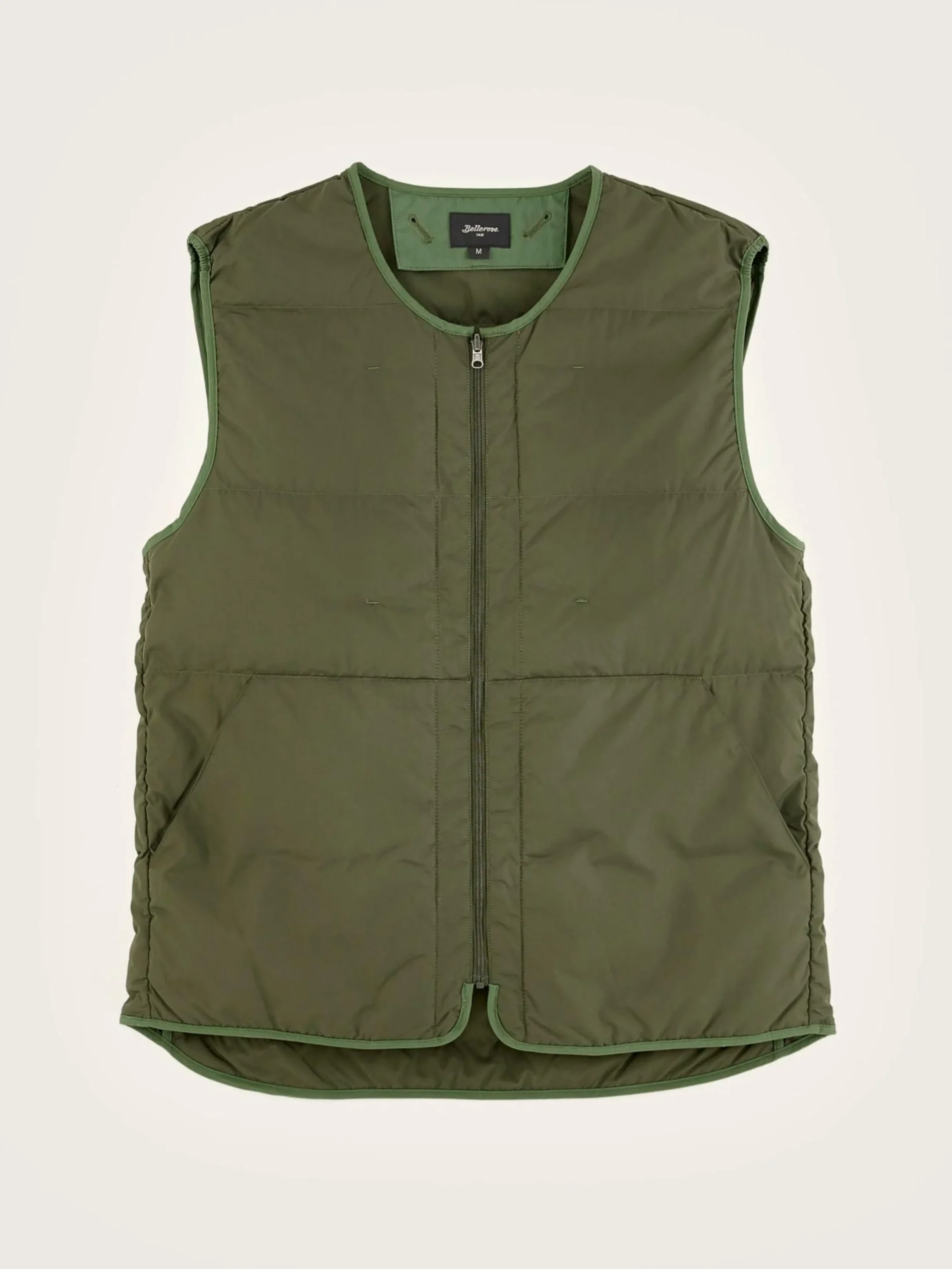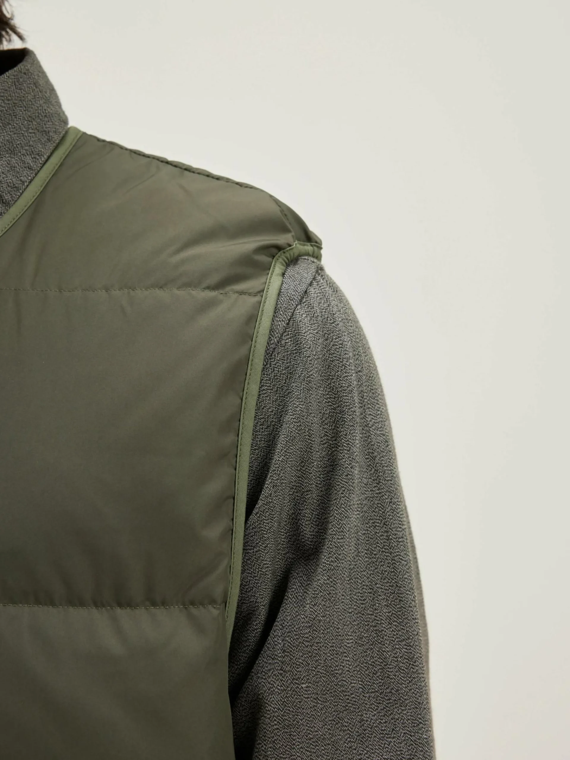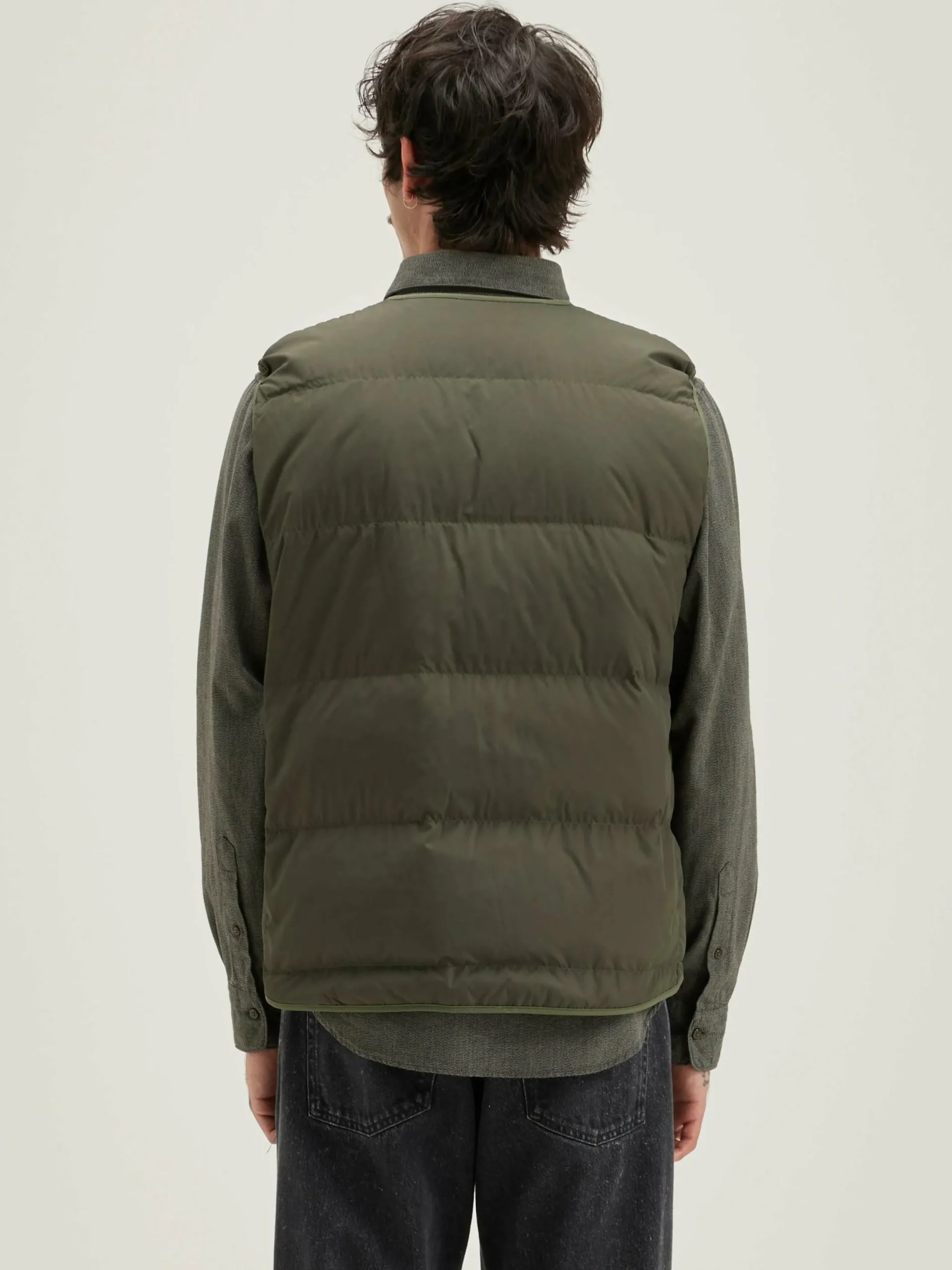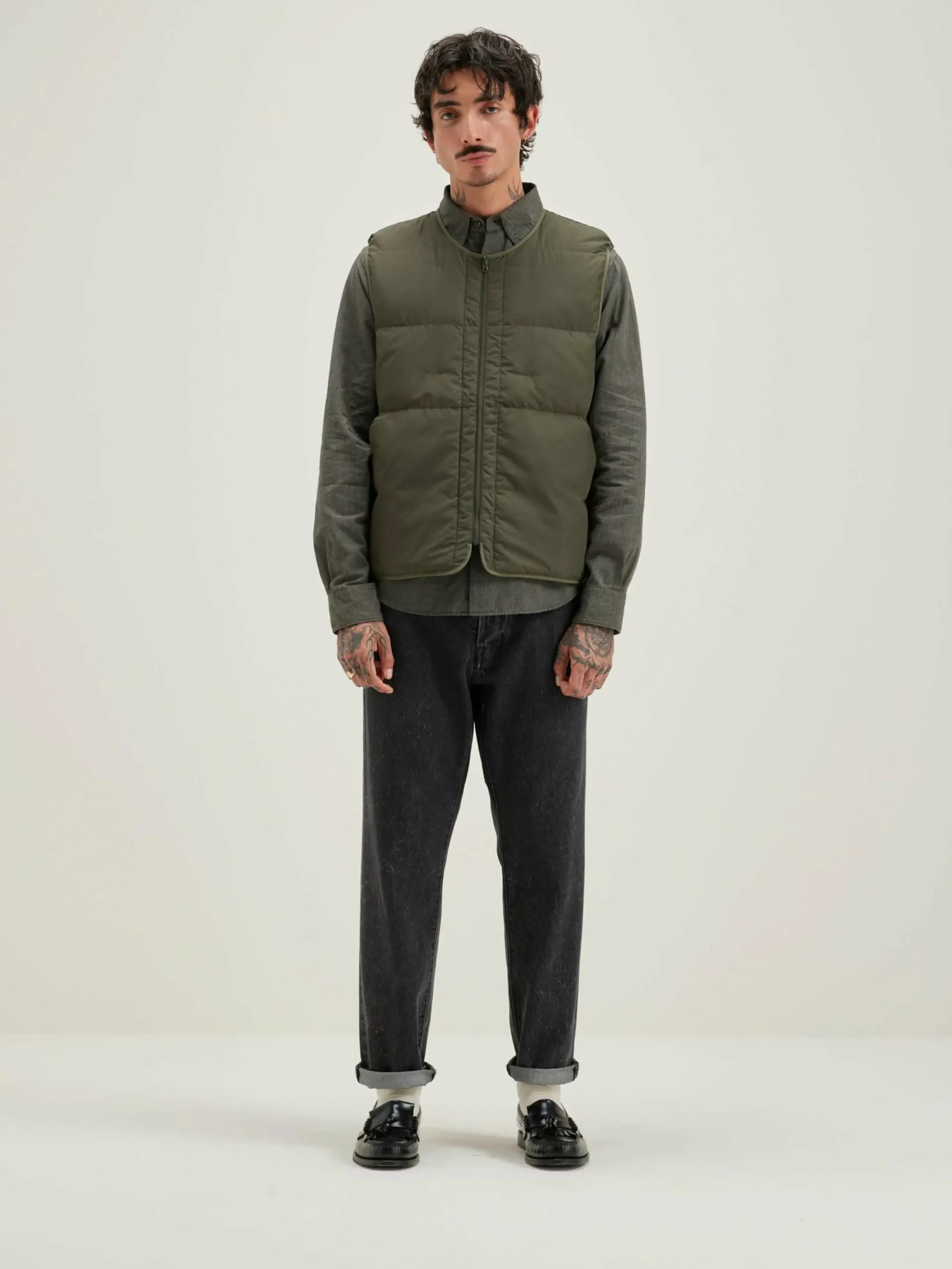 Bodywarmer réversible matelassé vert olive, avec fermeture éclair à l’avant.