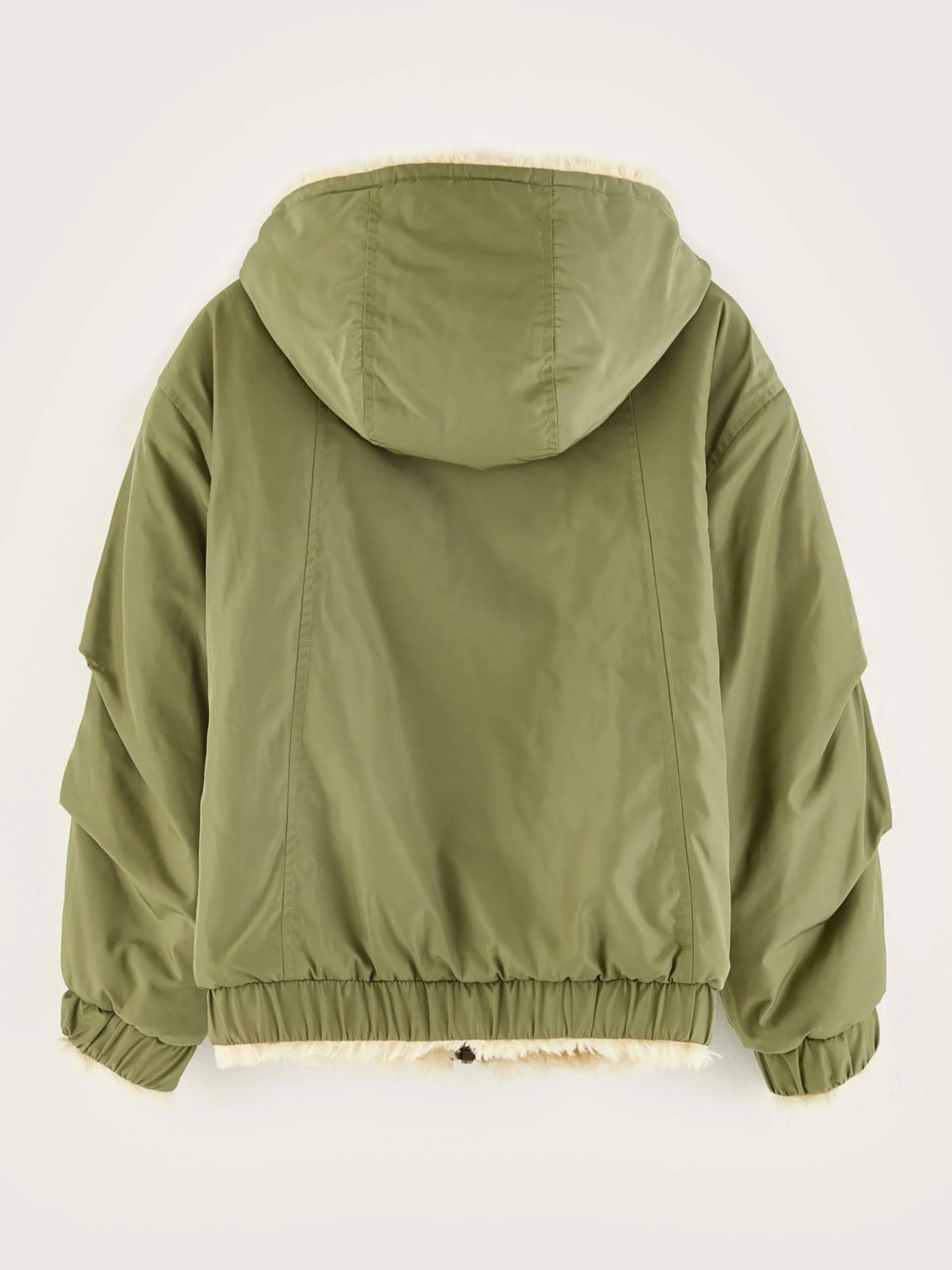 Veste réversible style bomber, couleur vert jeep et doublure en fausse fourrure écrue.